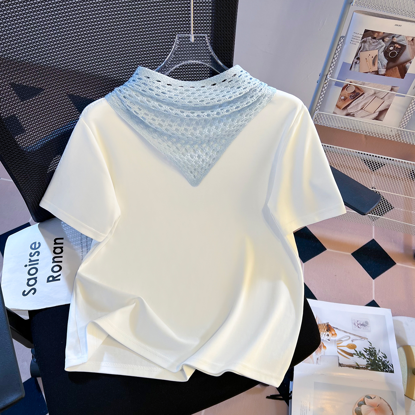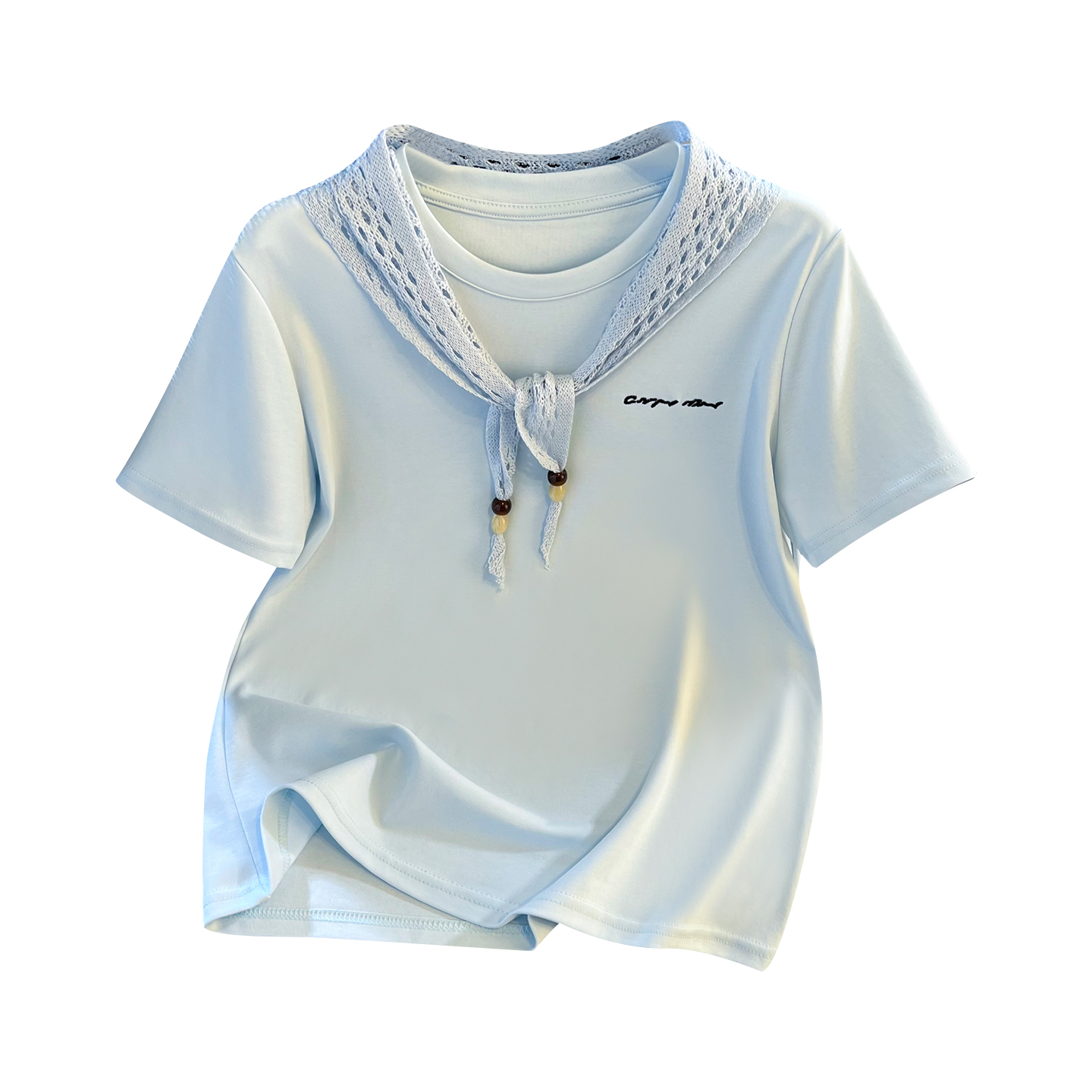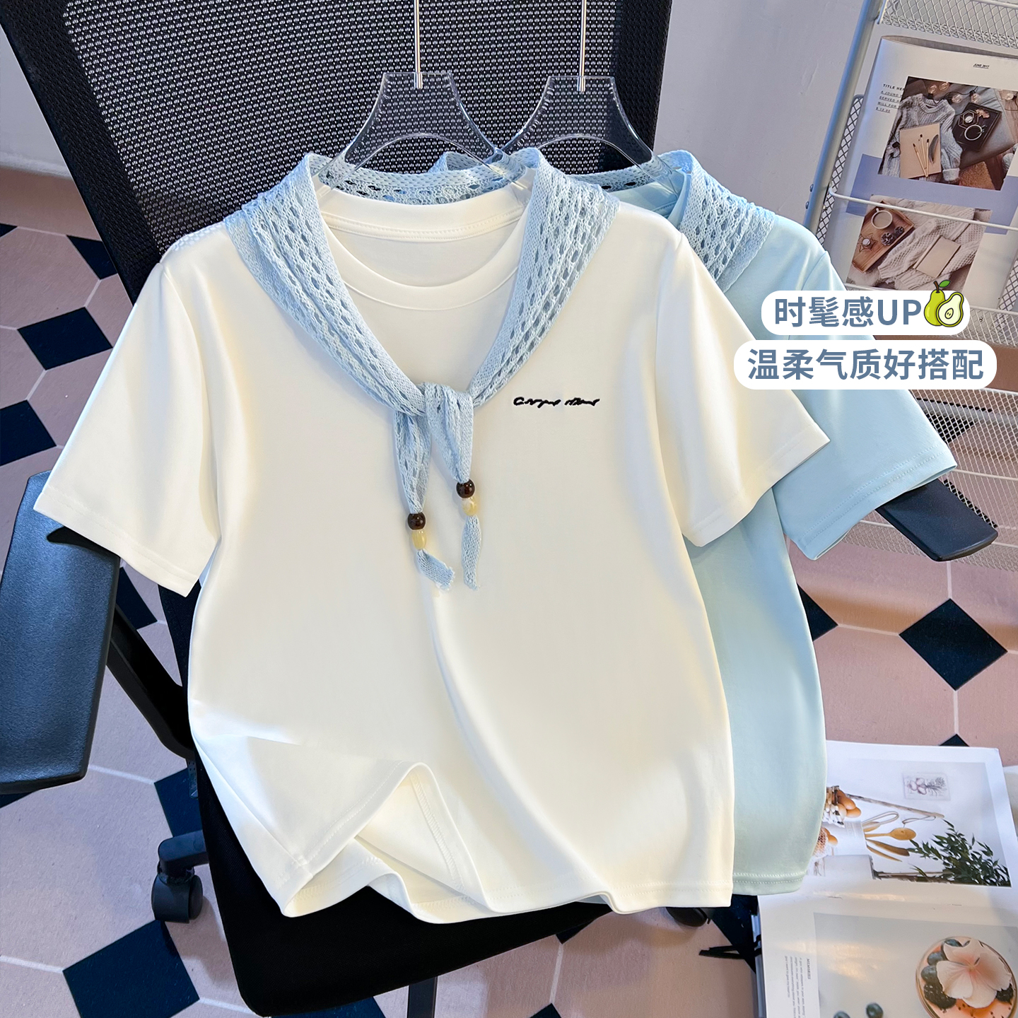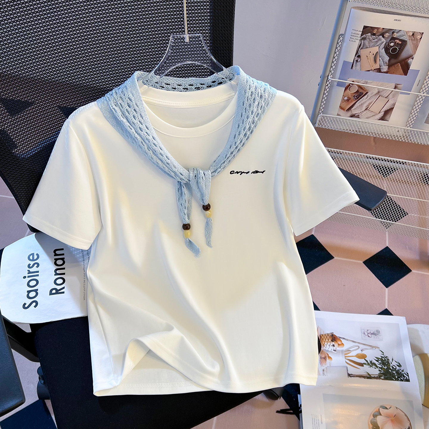 FA55149# 春季新款加厚纯棉重工勾花穿珠披肩修身时尚短袖T恤女 服裝批發女裝批發服飾貨源