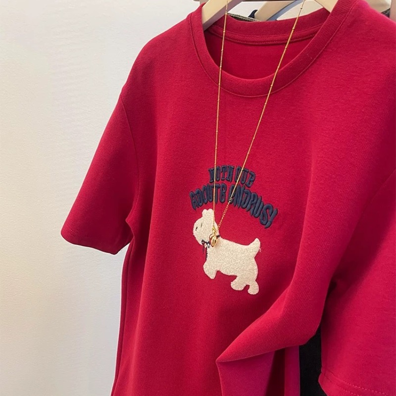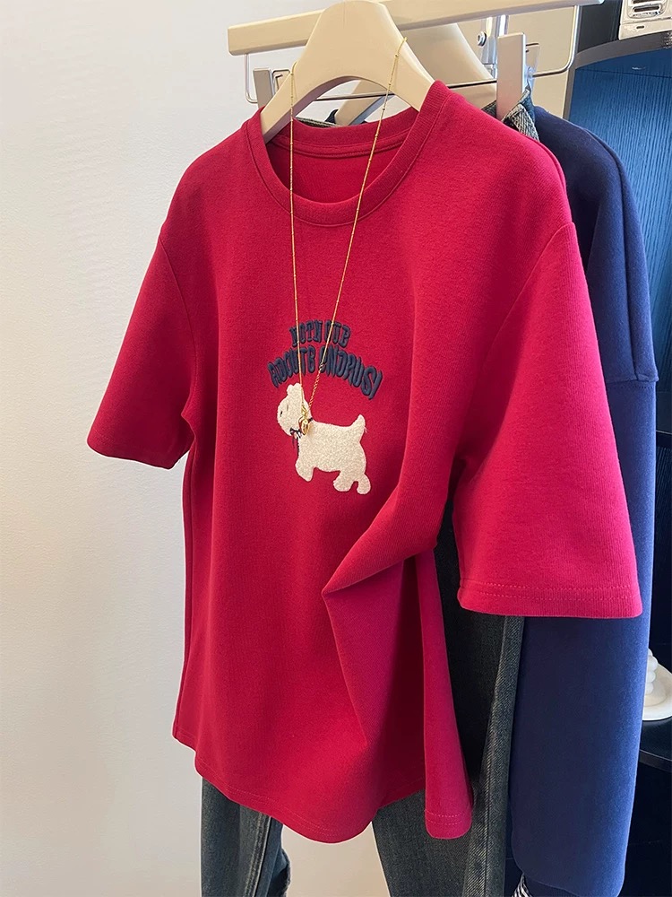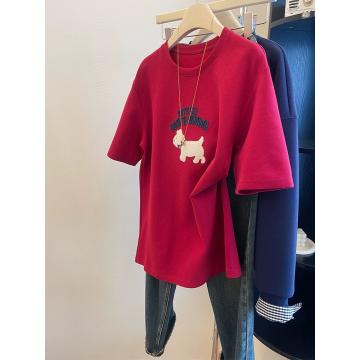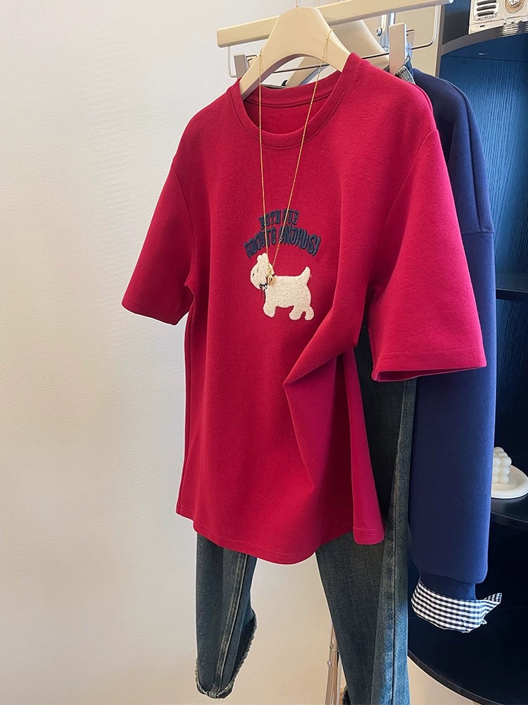 FA55172# 德绒特大码300斤韩版百搭红色刺绣小狗短袖t恤女秋冬新款磨毛上衣 服裝批發女裝批發服飾貨源