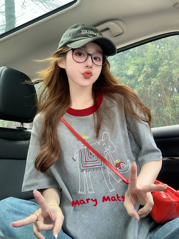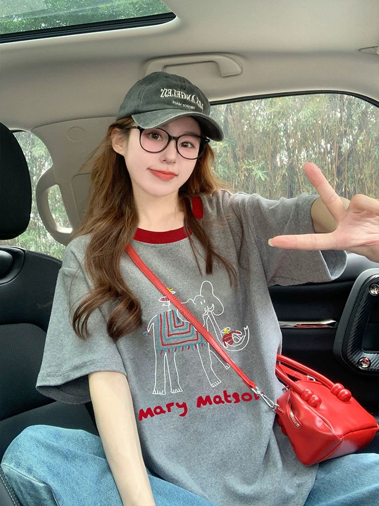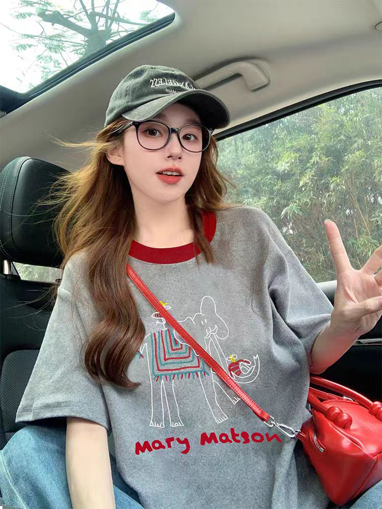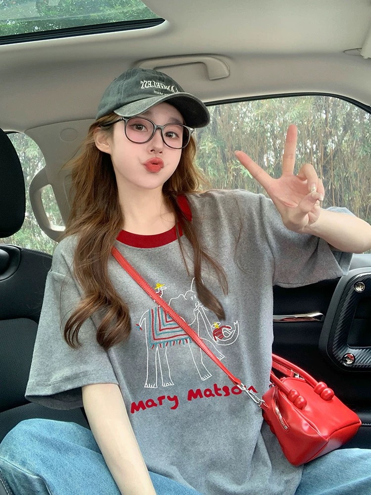 FA55179# 灰色大象短袖t恤女新款夏季撞色韩系复古减龄宽松休闲上衣ins 服裝批發女裝批發服飾貨源