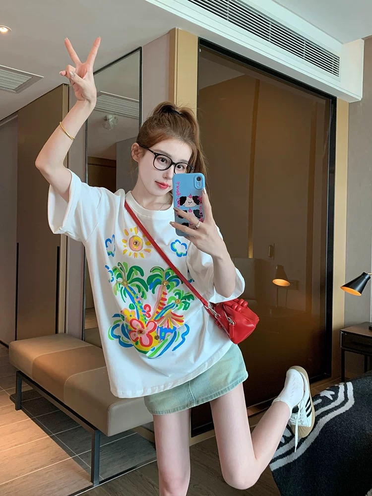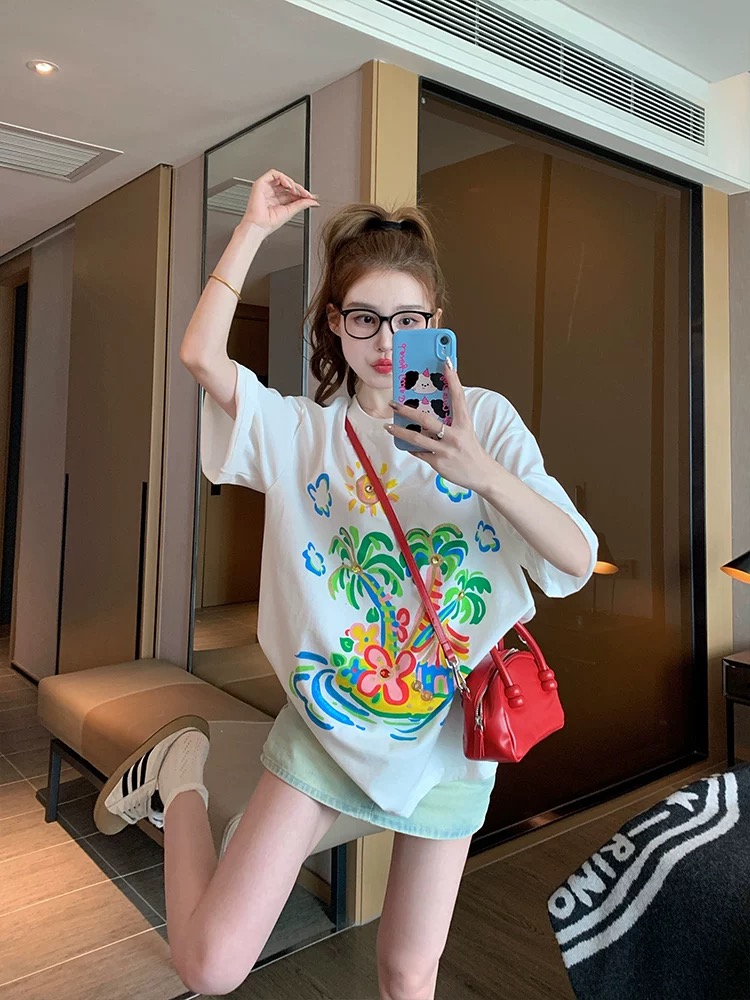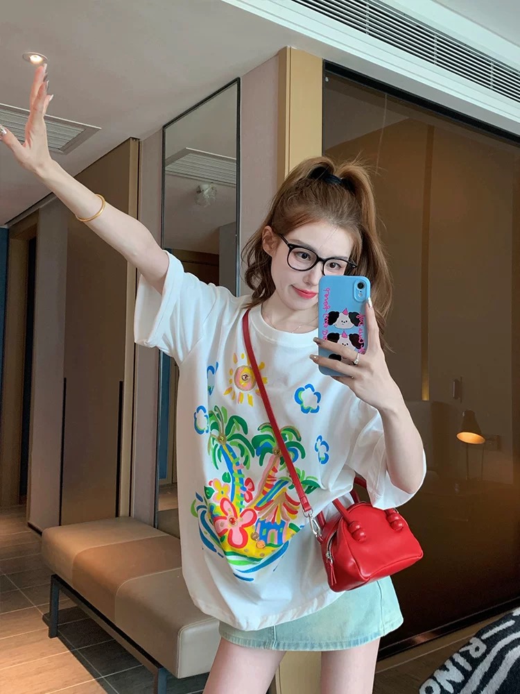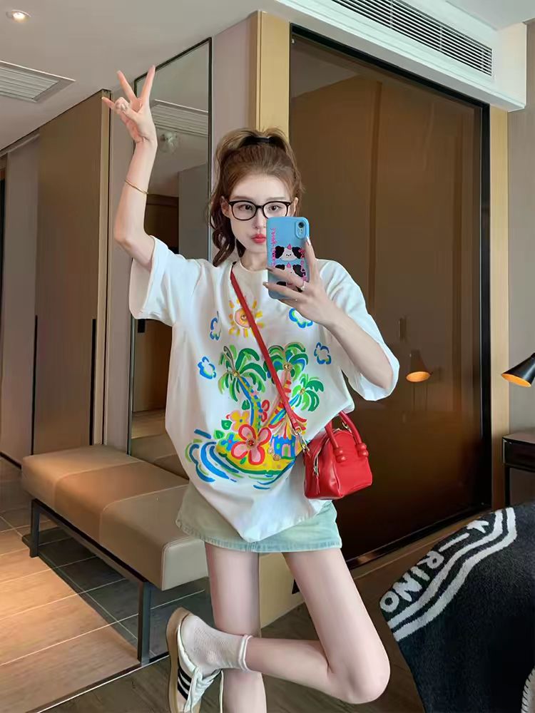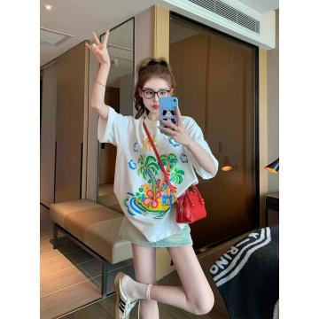 FA55182# 白色夏威夷纯棉短袖t恤女夏季高级感小众宽松休闲百搭体恤上衣ins 服裝批發女裝批發服飾貨源