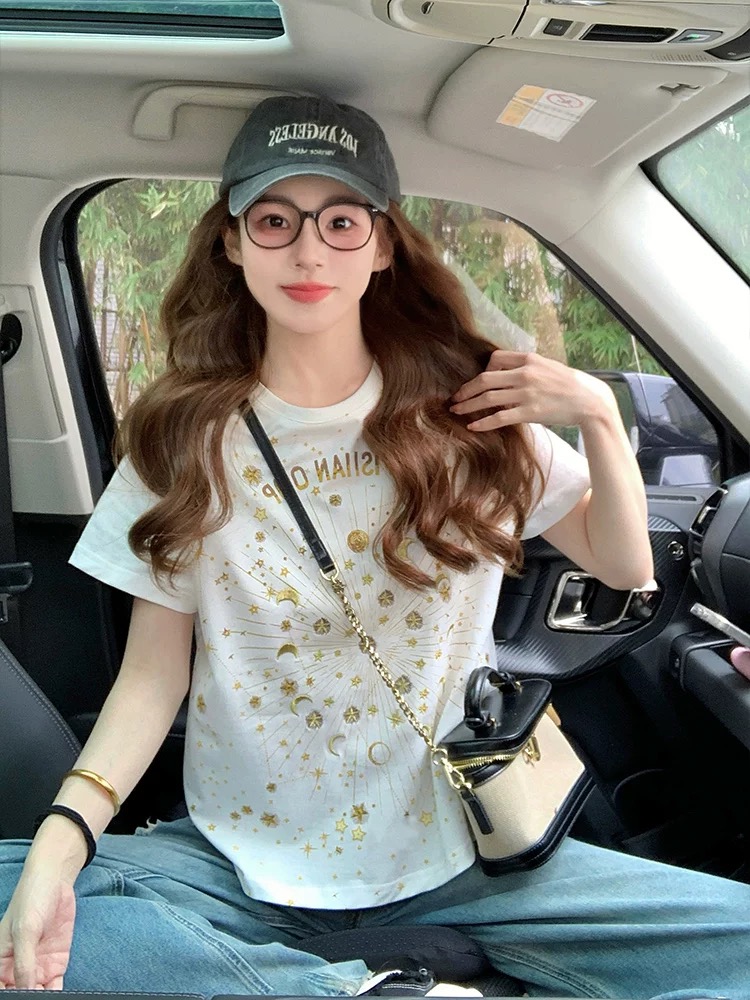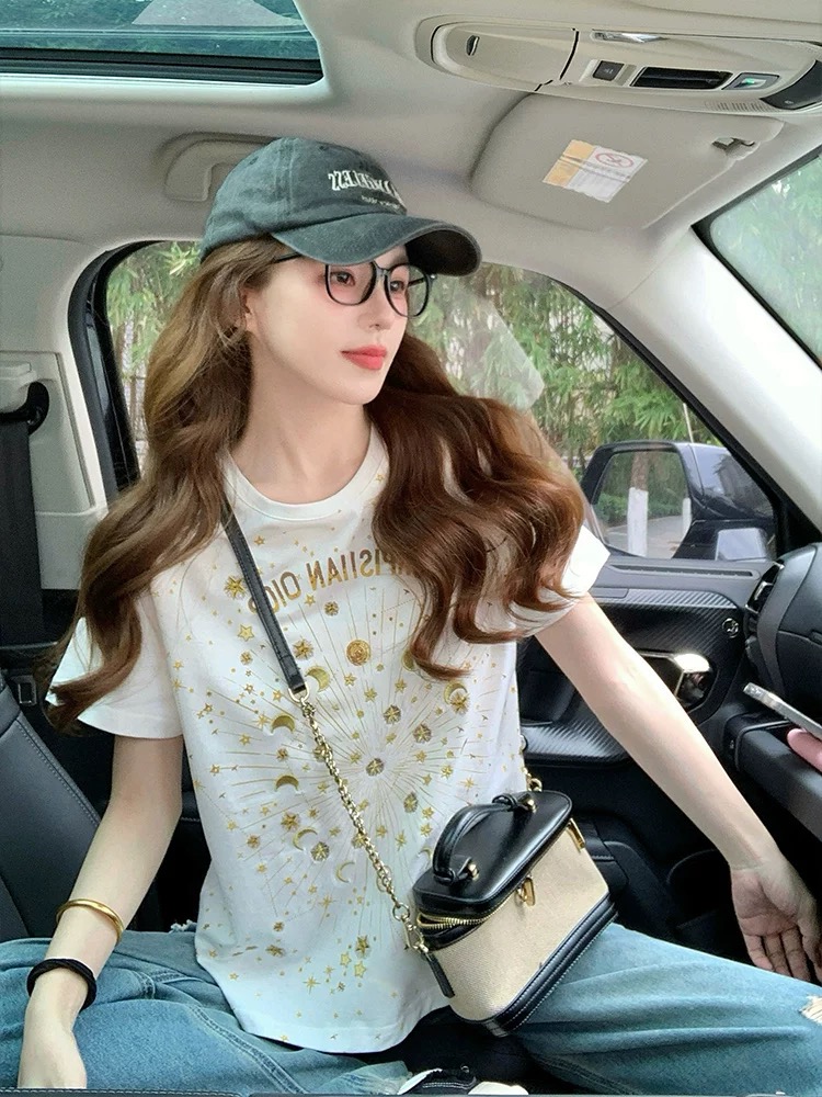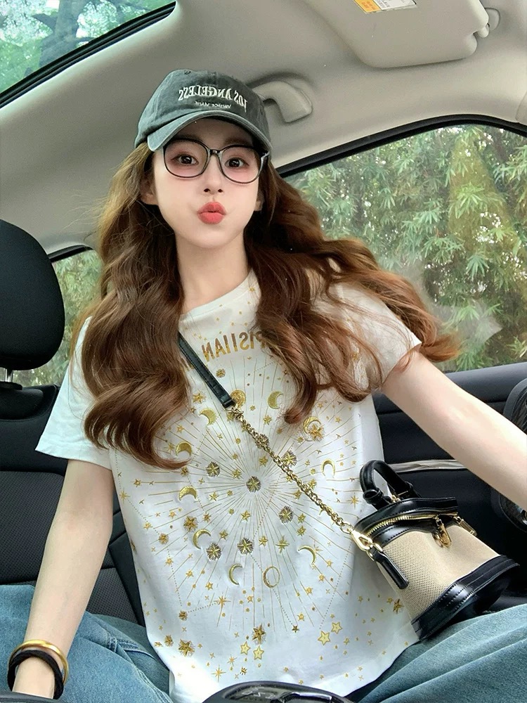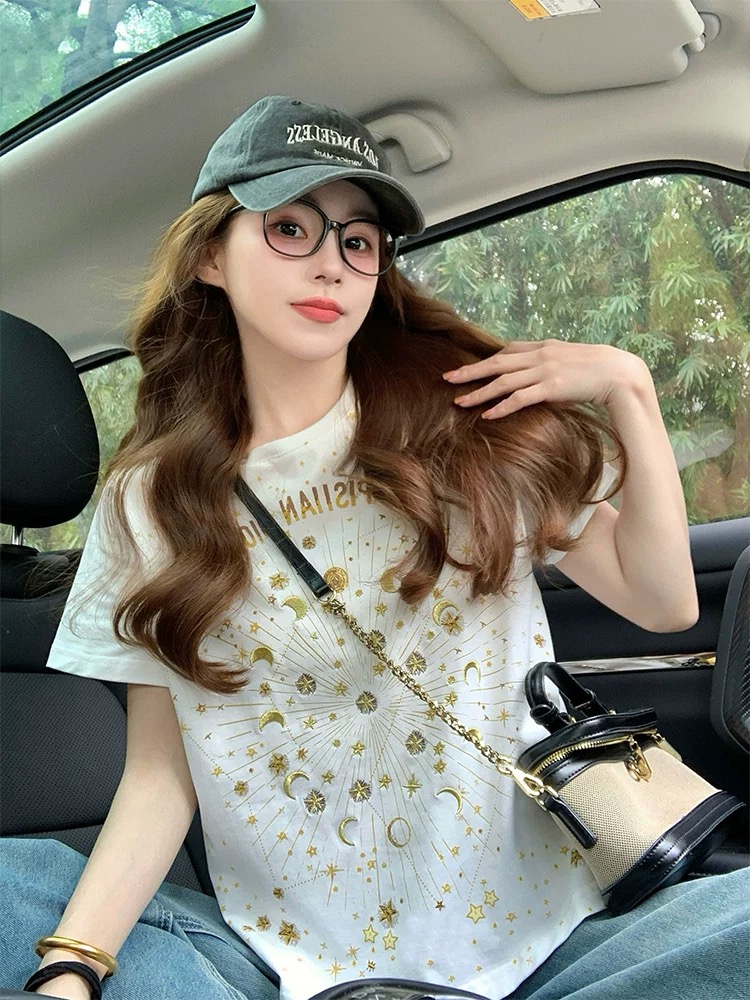 FA55184# 小香风短袖t恤女新款夏季重工星星刺绣高级感宽松正肩上衣潮 服裝批發女裝批發服飾貨源