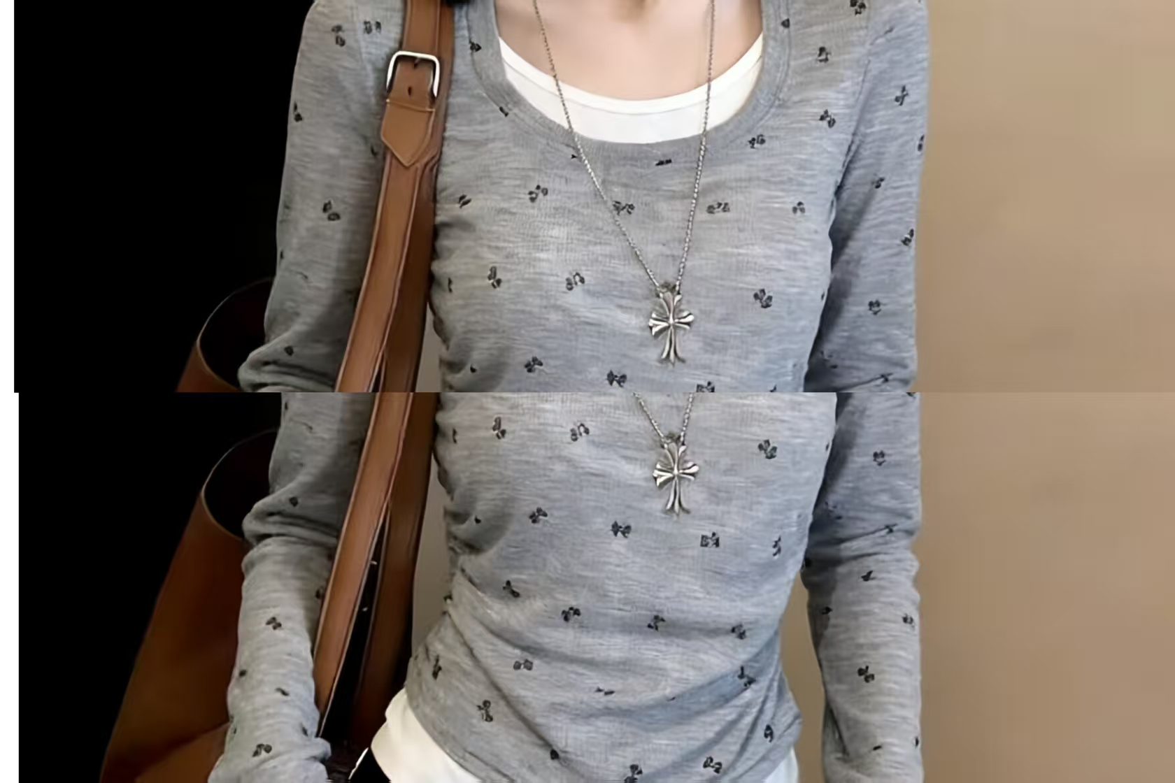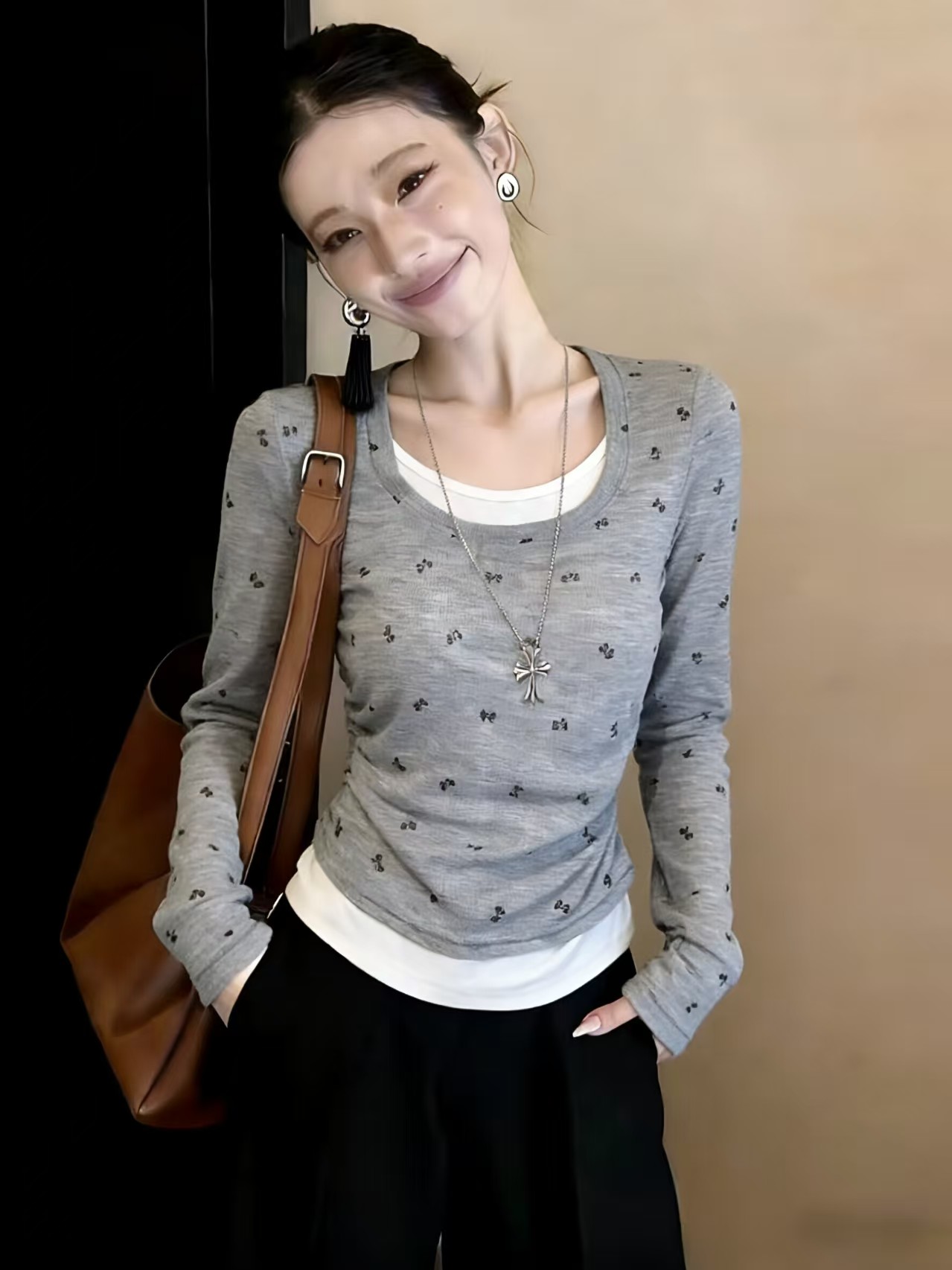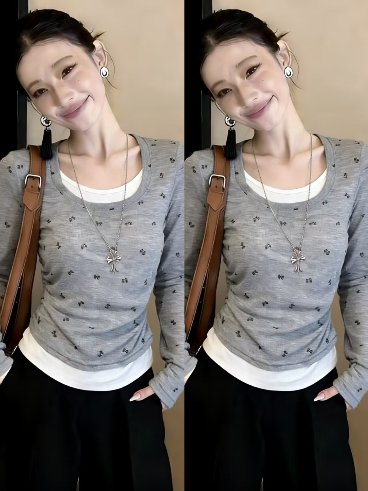FA55225# 假两件蝴蝶印花长袖夏季设计感收腰显瘦上衣女 服裝批發女裝批發服飾貨源
