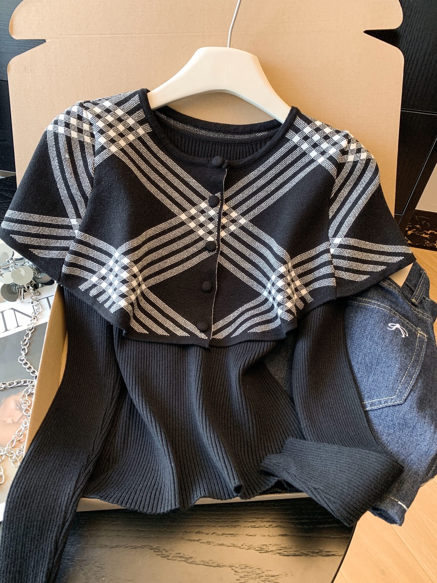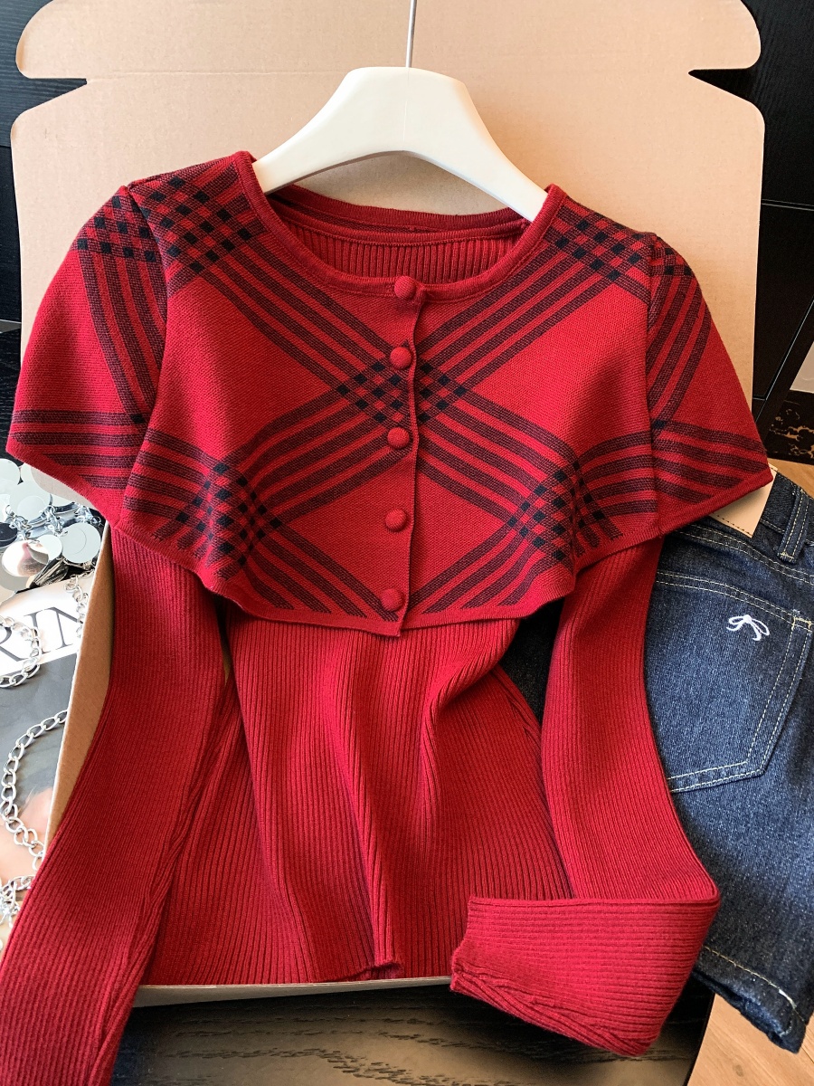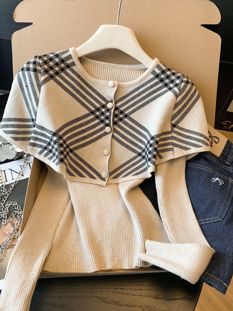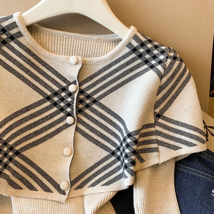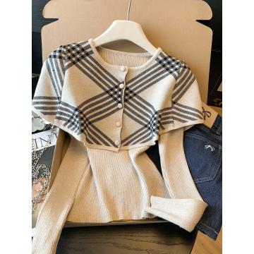 FA55266# 韩版新年套装秋冬季新款格纹斗篷+内搭毛衣针织衫两件套 服裝批發女裝批發服飾貨源