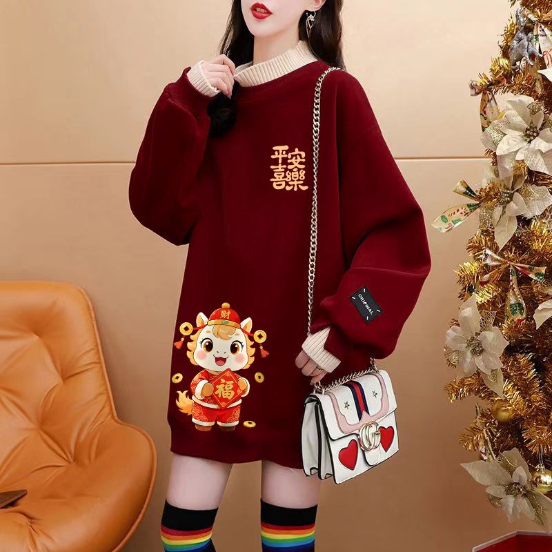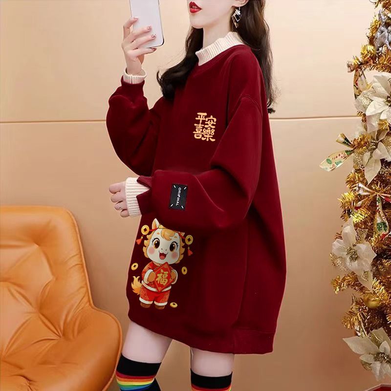 FA55312# 绝美新年红色假两件加绒卫衣女设计感卡通涂鸦宽松休闲中长款上衣 服裝批發女裝批發服飾貨源