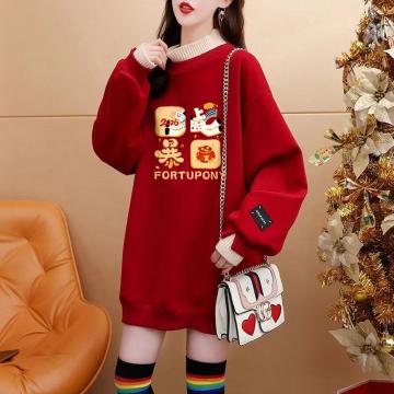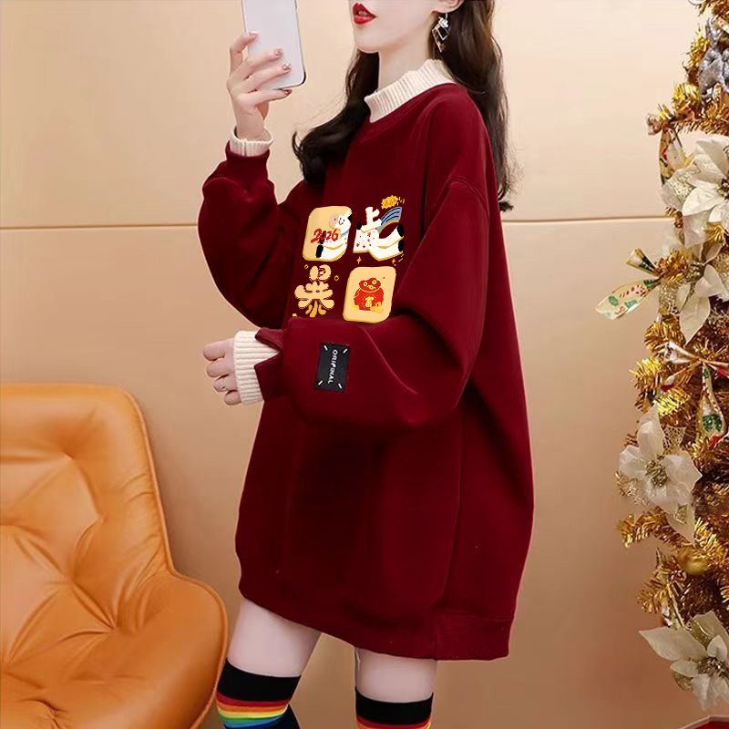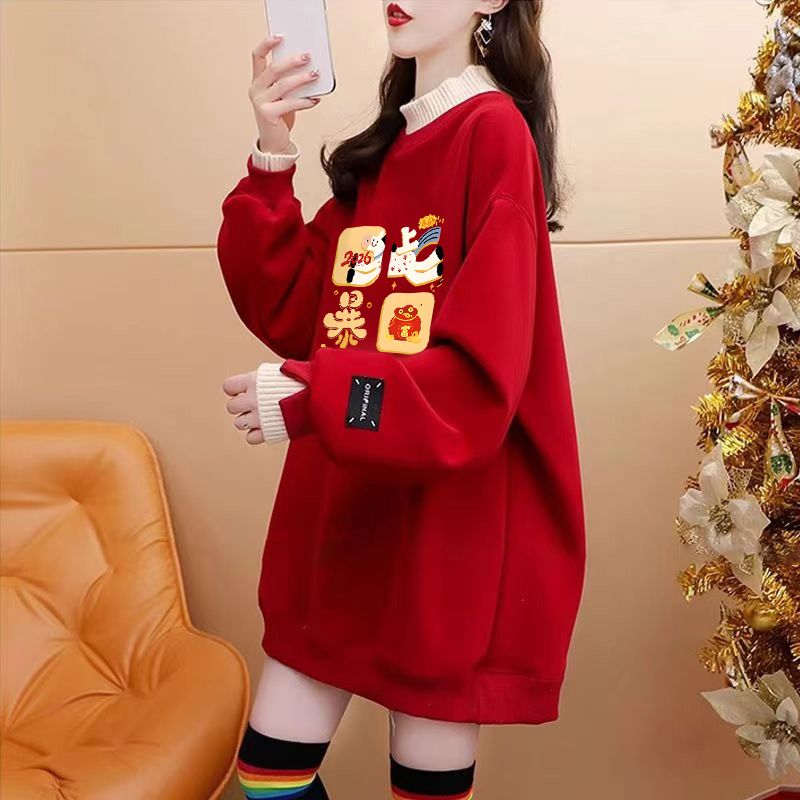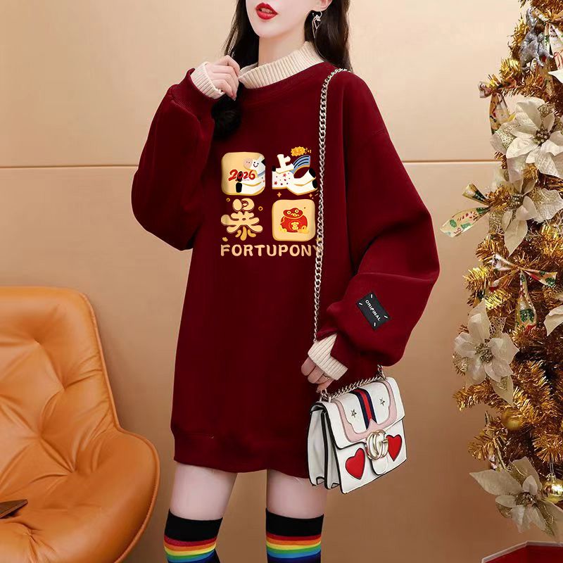 FA55314# 绝美新年红色假两件加绒卫衣女设计感卡通涂鸦宽松休闲中长款上衣 服裝批發女裝批發服飾貨源