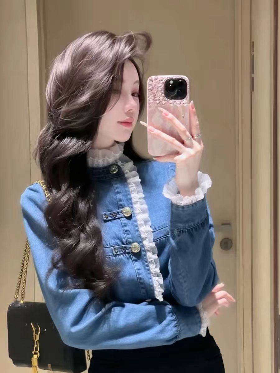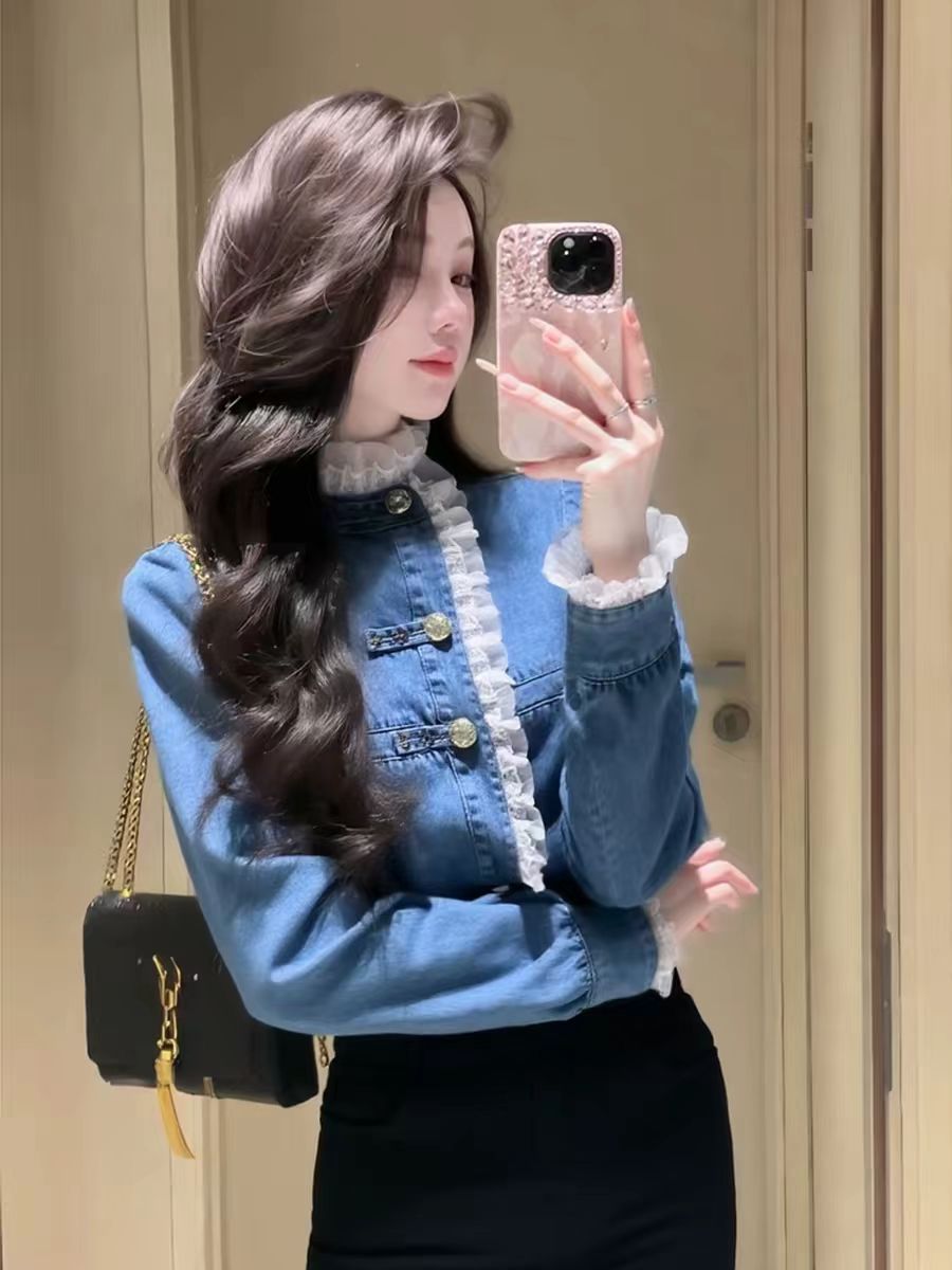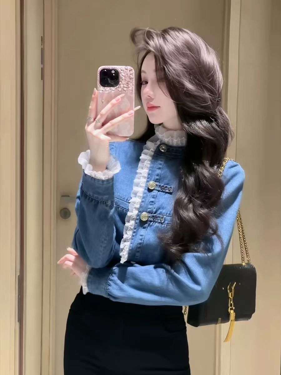 FA55358# 独特别致蓝色牛仔上衣女冬季爆款轻奢高级感时髦洋气百搭衬衣 服裝批發女裝批發服飾貨源