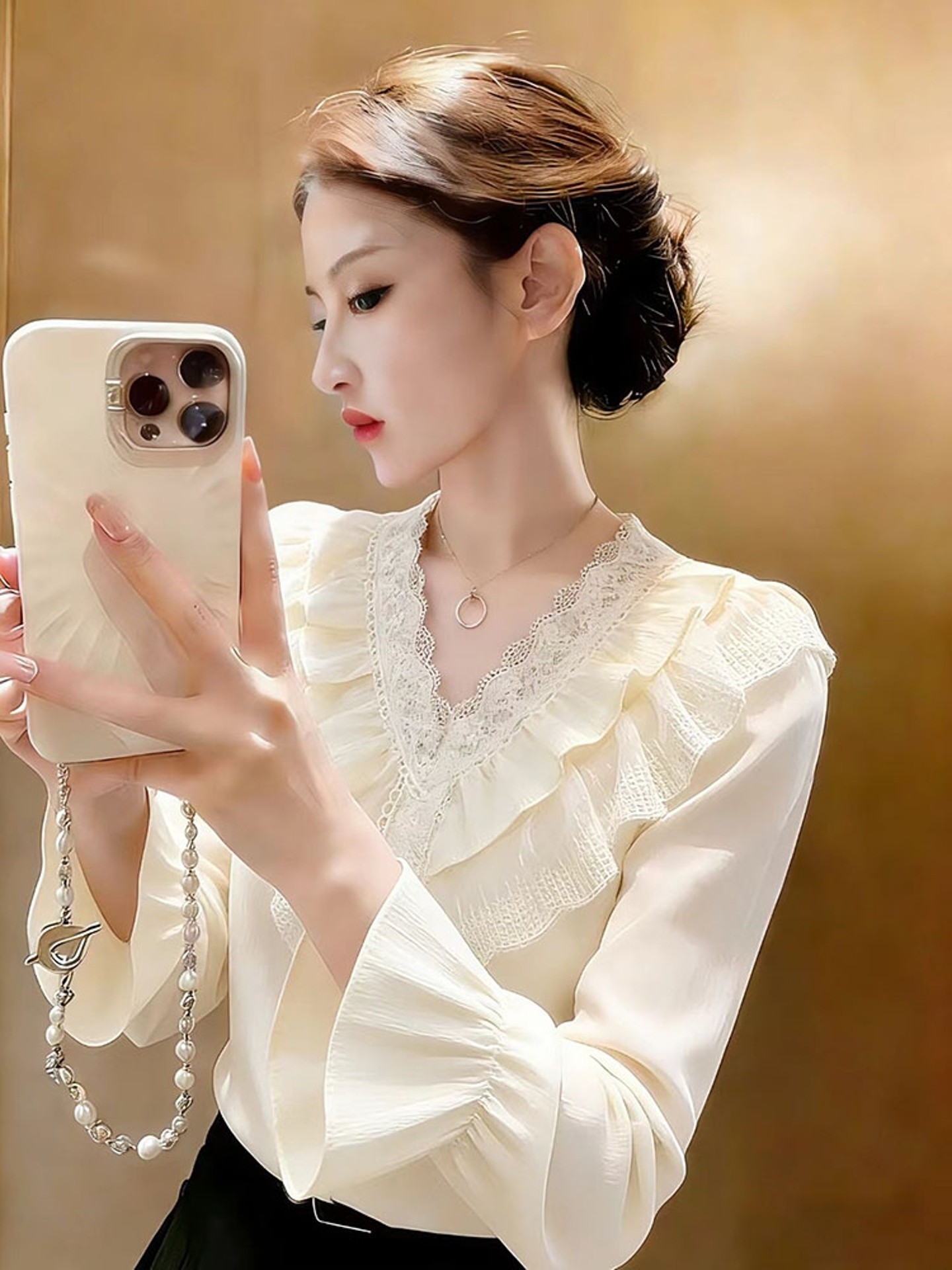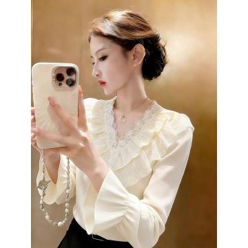 FA55360# 超火独特漂亮炸街减龄上衣轻熟小众不撞款杏色蕾丝花边衬衫女春季 服裝批發女裝批發服飾貨源