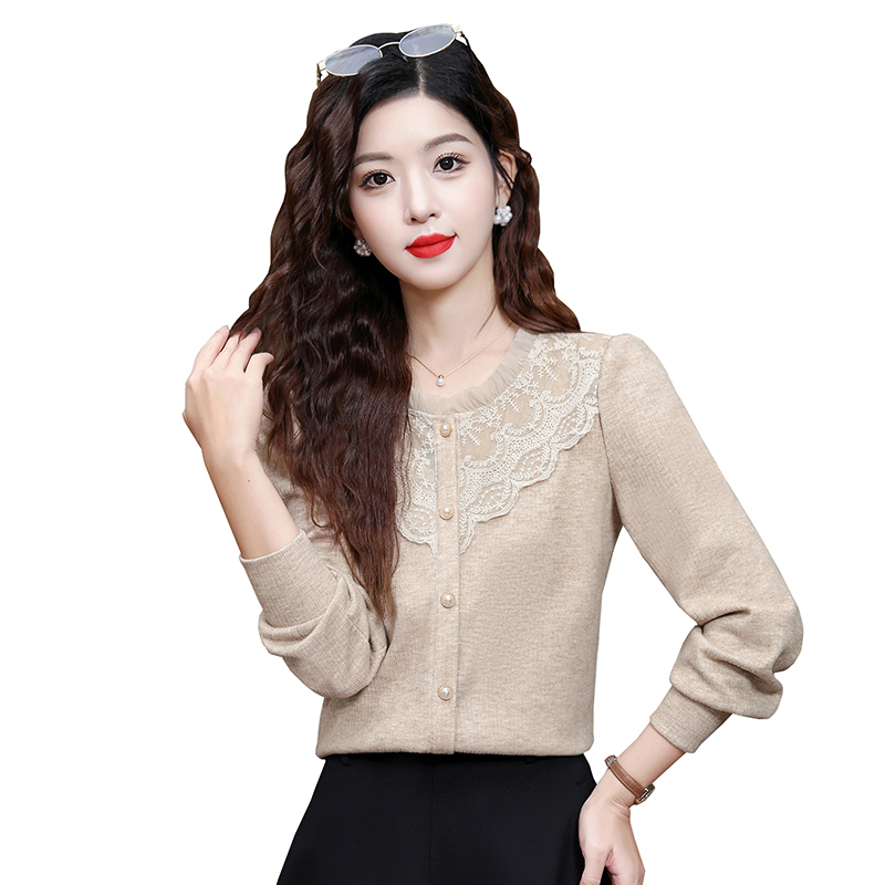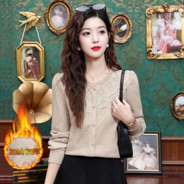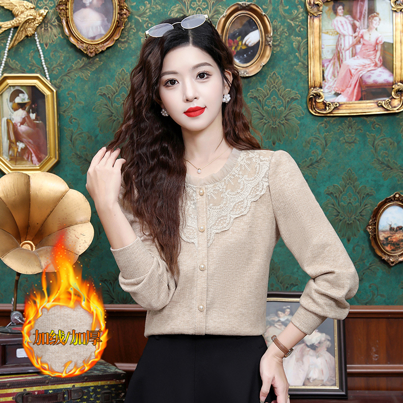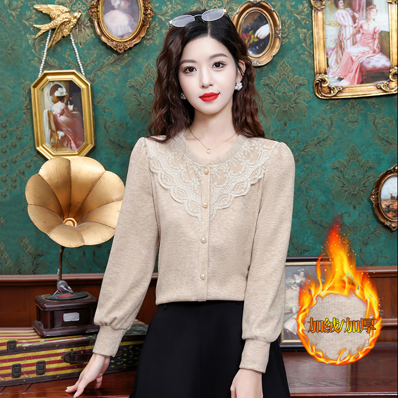 FA55365# 秋冬新款加绒长袖蕾丝花边圆领显瘦减龄百搭洋气上衣 服裝批發女裝批發服飾貨源