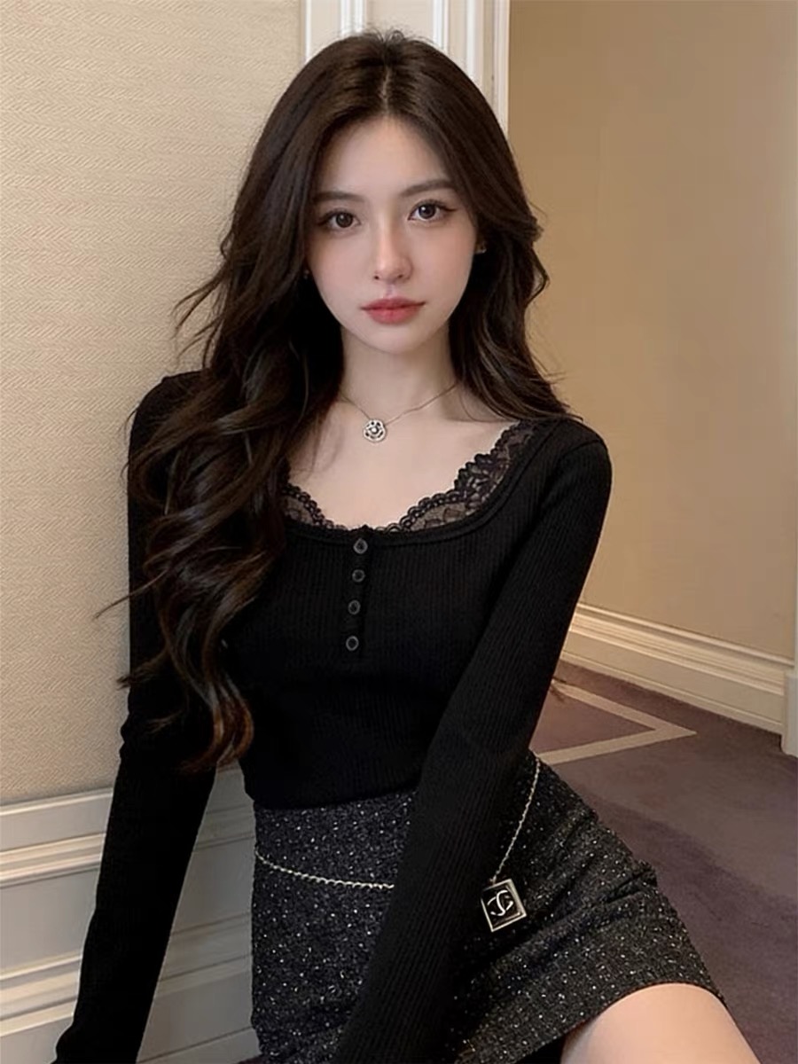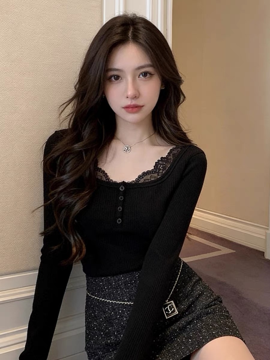 FA55381# 辣妹纯欲绝美蕾丝边黑色打底衫女秋冬新款内搭长袖上衣设计感小众 服裝批發女裝批發服飾貨源