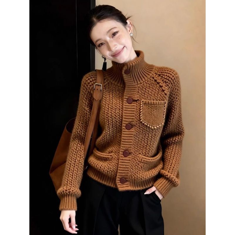 Home > 毛衣、针织衫 > FA55861# 韩版高级感复古风咖色单排扣针织开女春季氛围感穿搭时尚百搭 服裝批發女裝批發服飾貨源