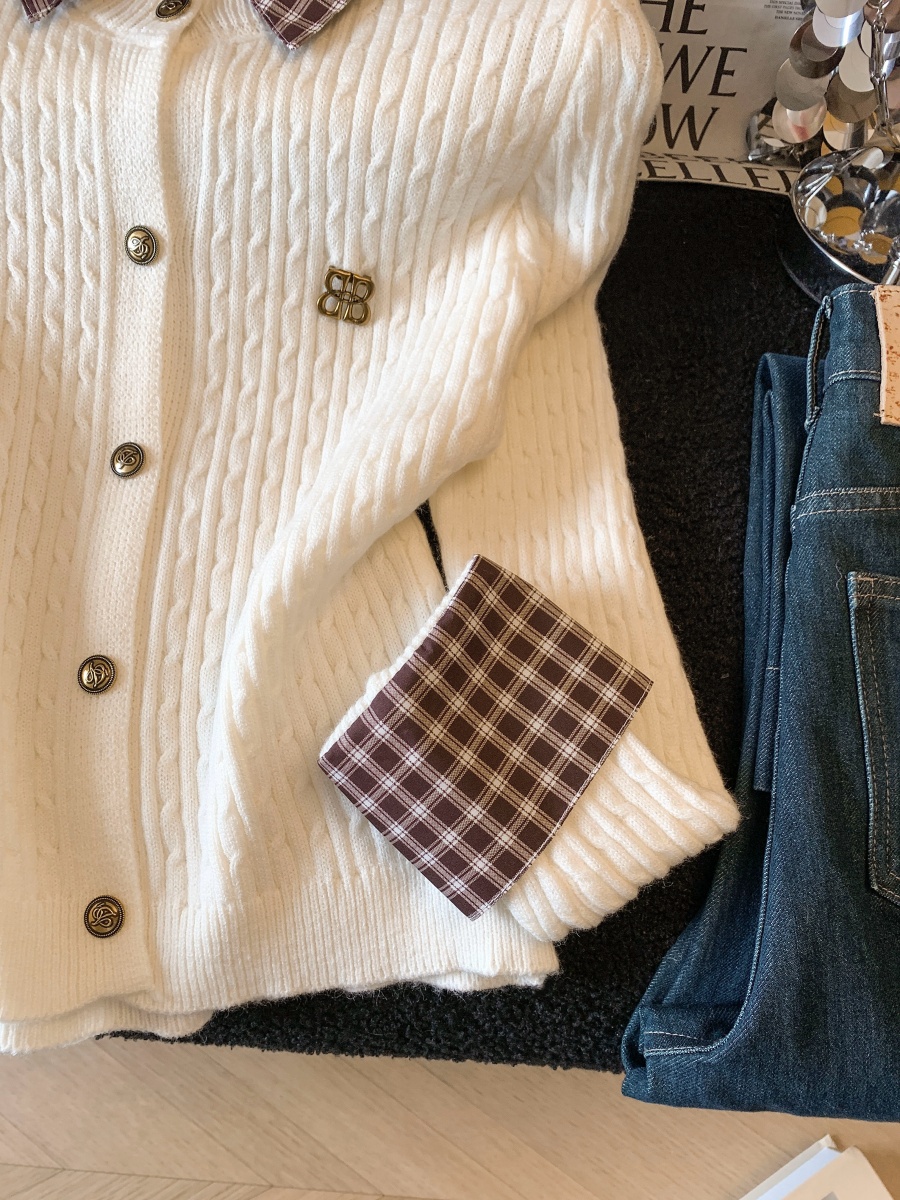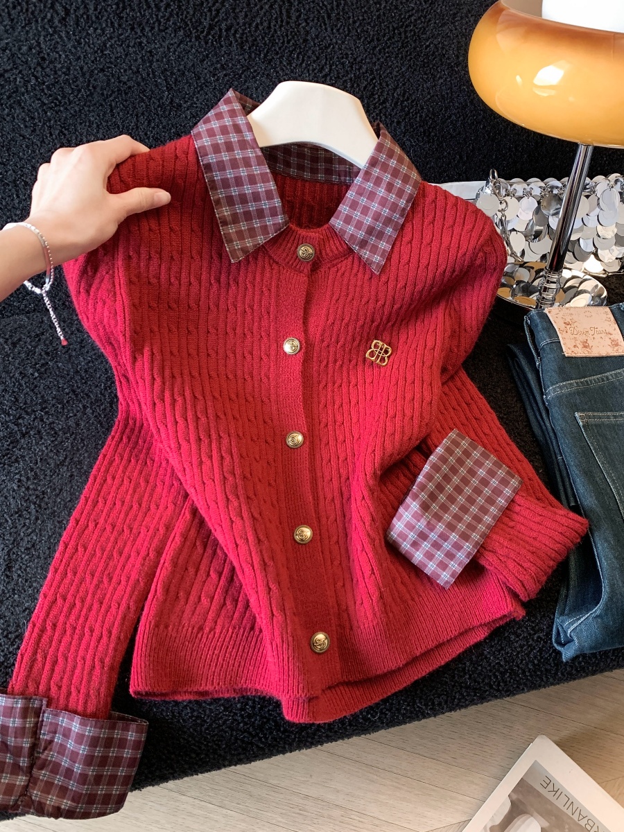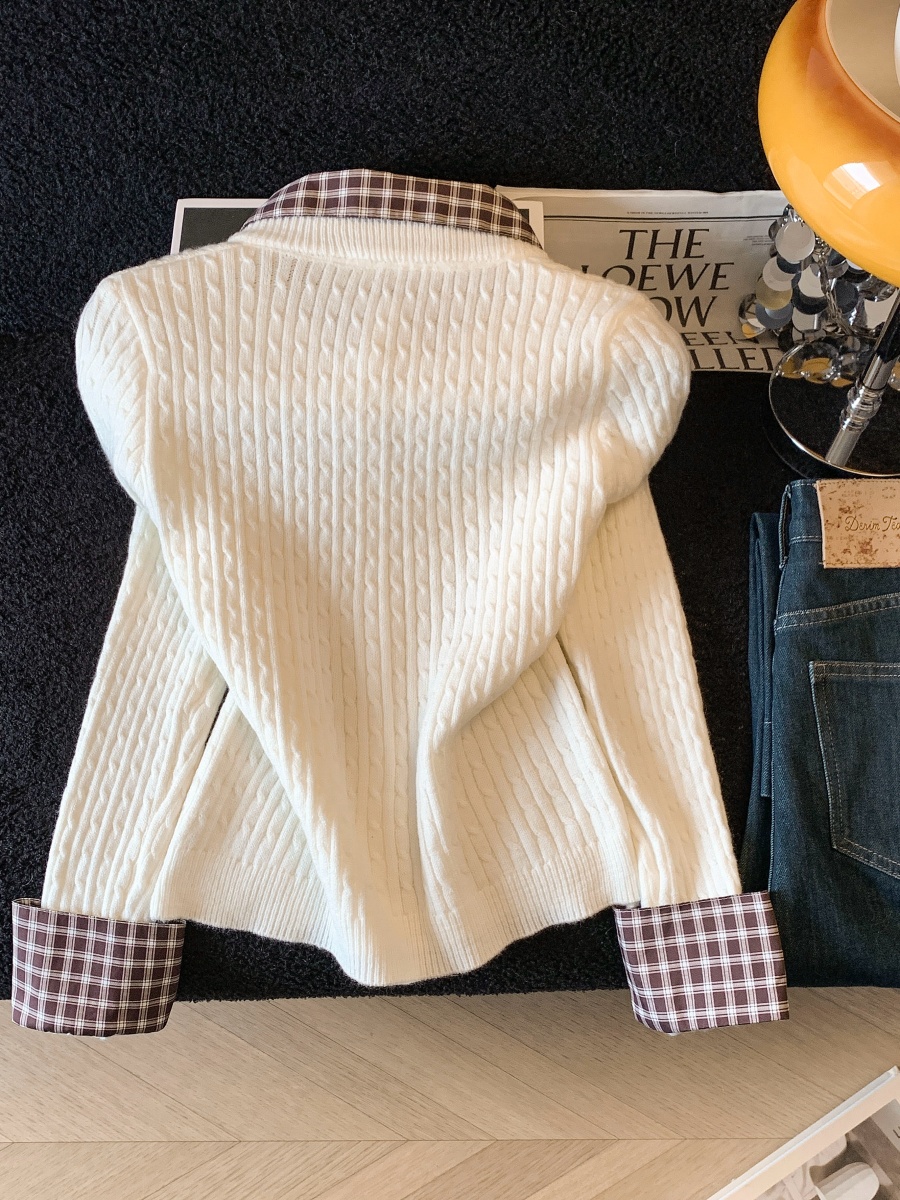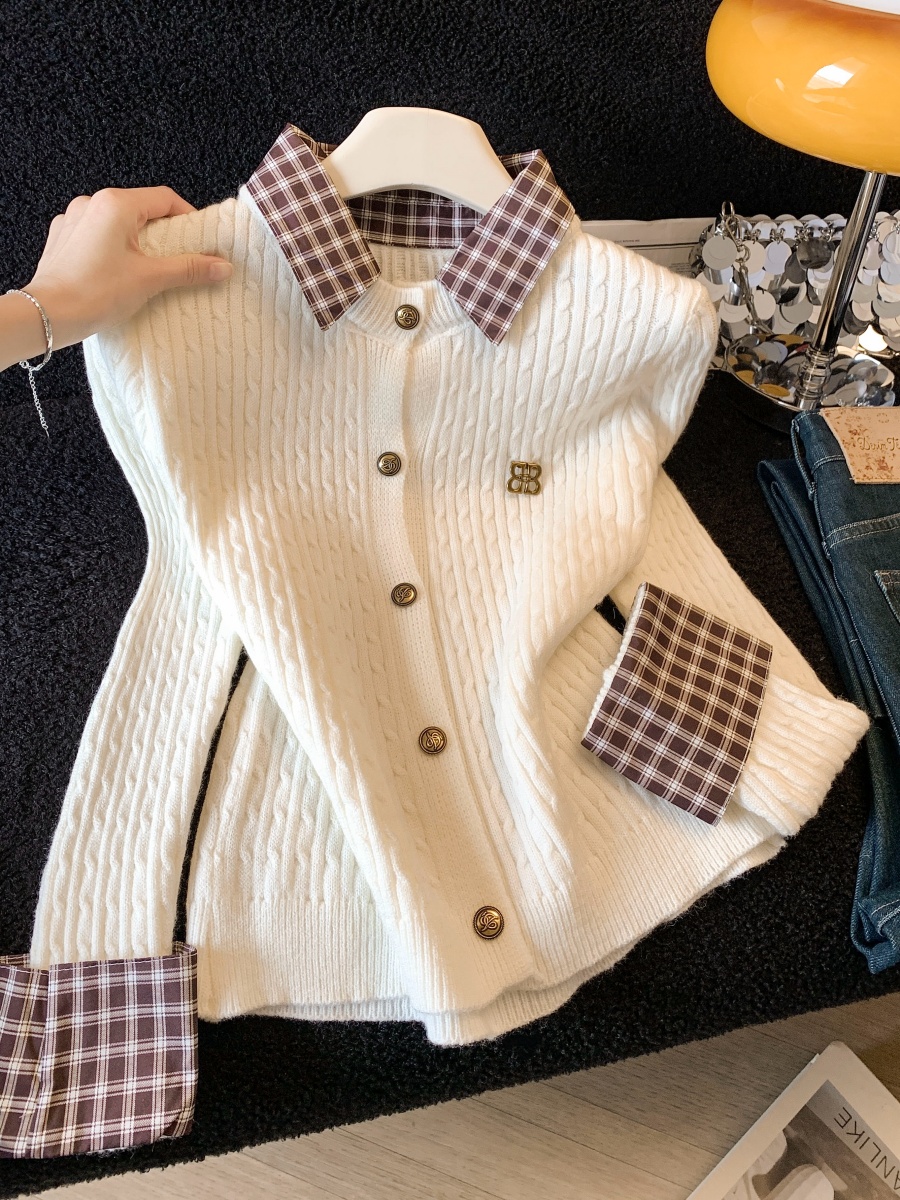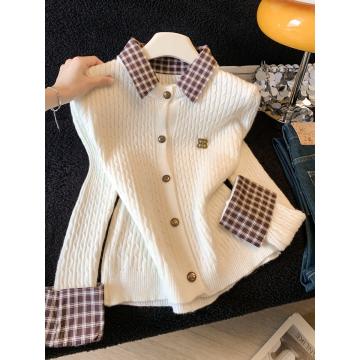 FA56615# 春季韩系假两件翻领针织格子袖开衫减龄显瘦上衣女 服裝批發女裝批發服飾貨源