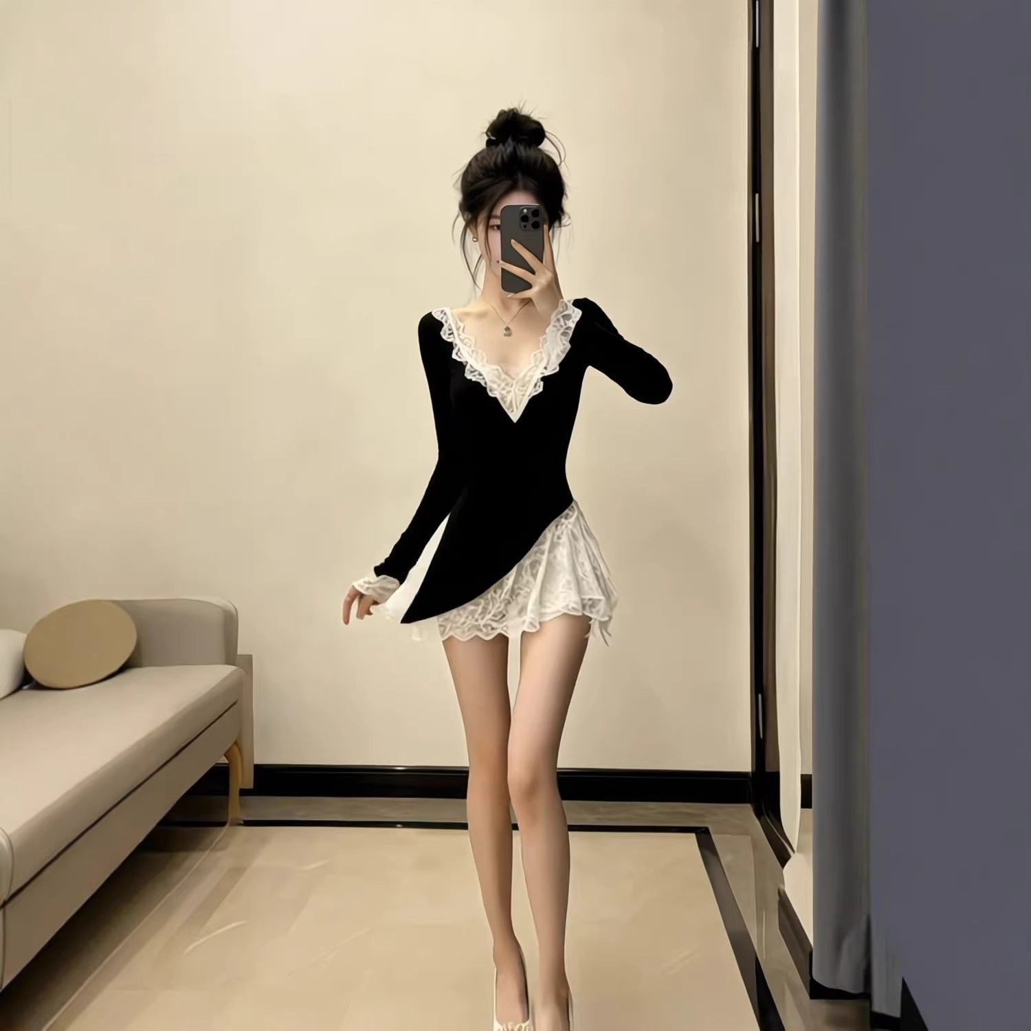 春季气质高级感纯欲御姐风黑色拼接蕾丝V领修身长袖高腰连衣裙女 服裝批發女裝批發服飾貨源