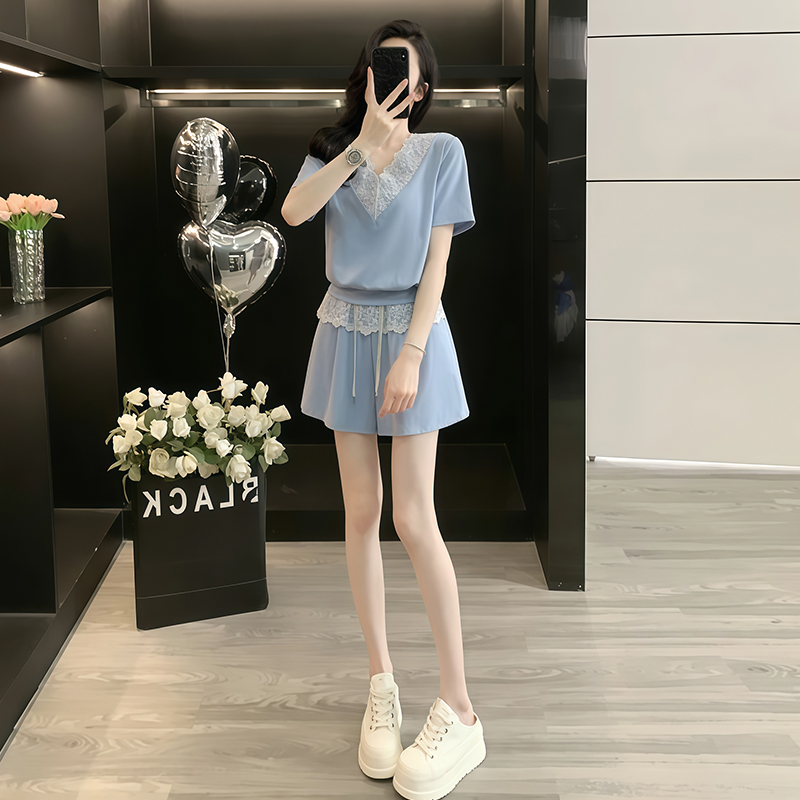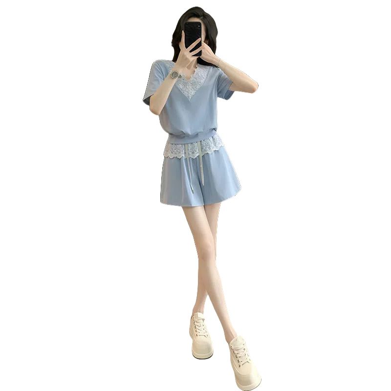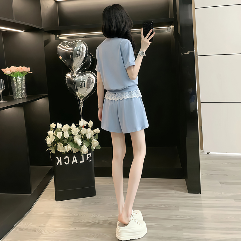 Home > 韩版套装 > BY10264# 高含棉时尚休闲套装女夏季新款蕾丝短袖高腰短裤两件套 服裝批發女裝批發服飾貨源