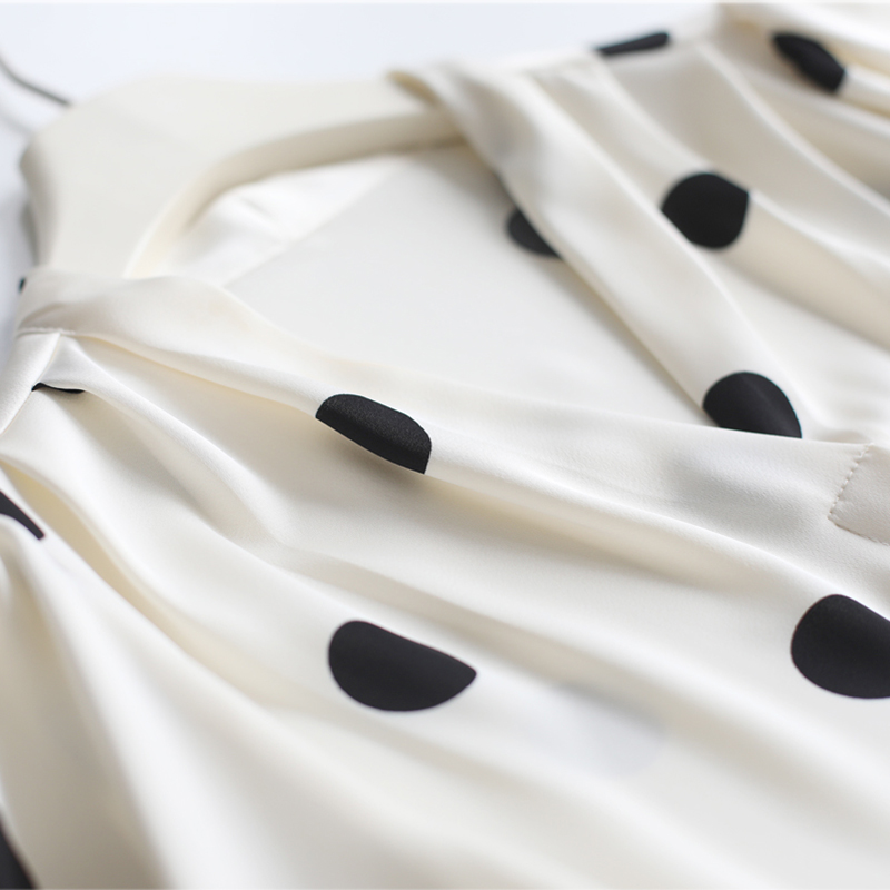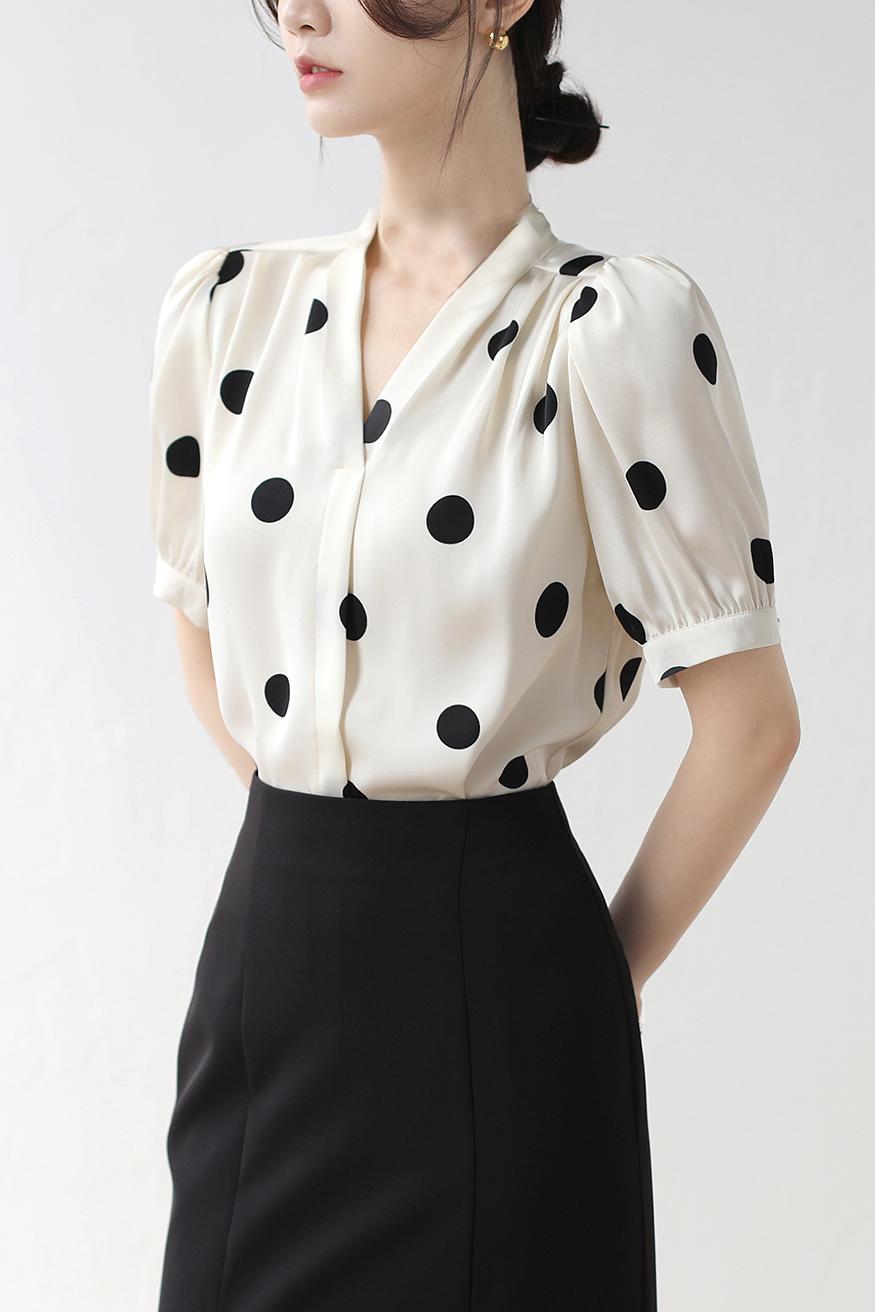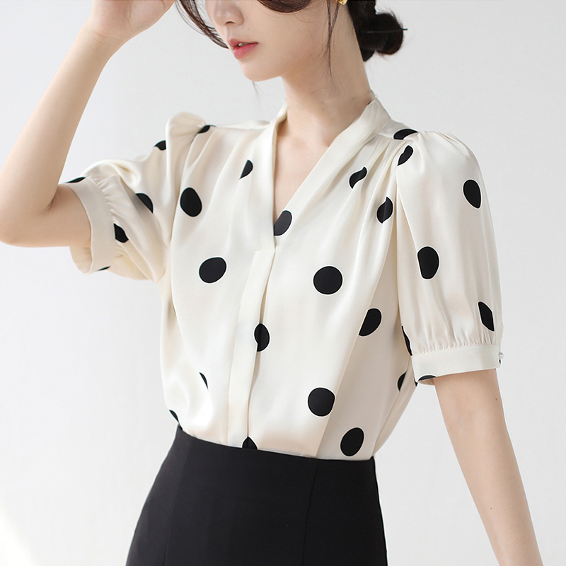 BY11637# 法式复古波点V领衬衫短袖女夏季新款玫瑰花系带缎面通勤上衣 服裝批發女裝批發服飾貨源