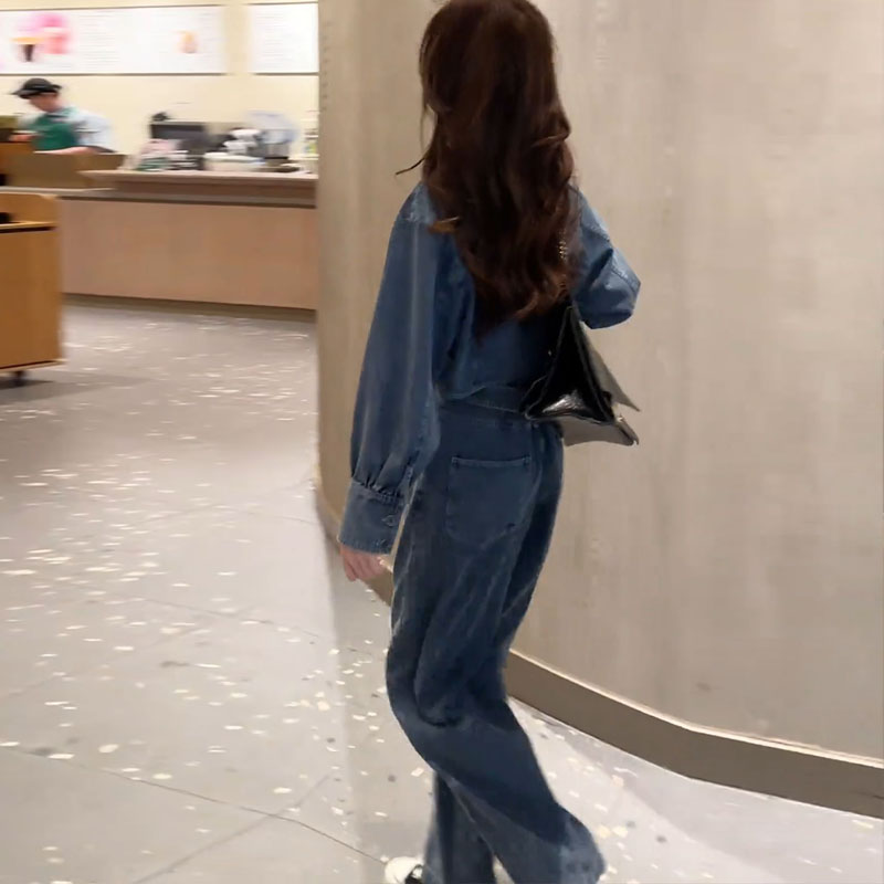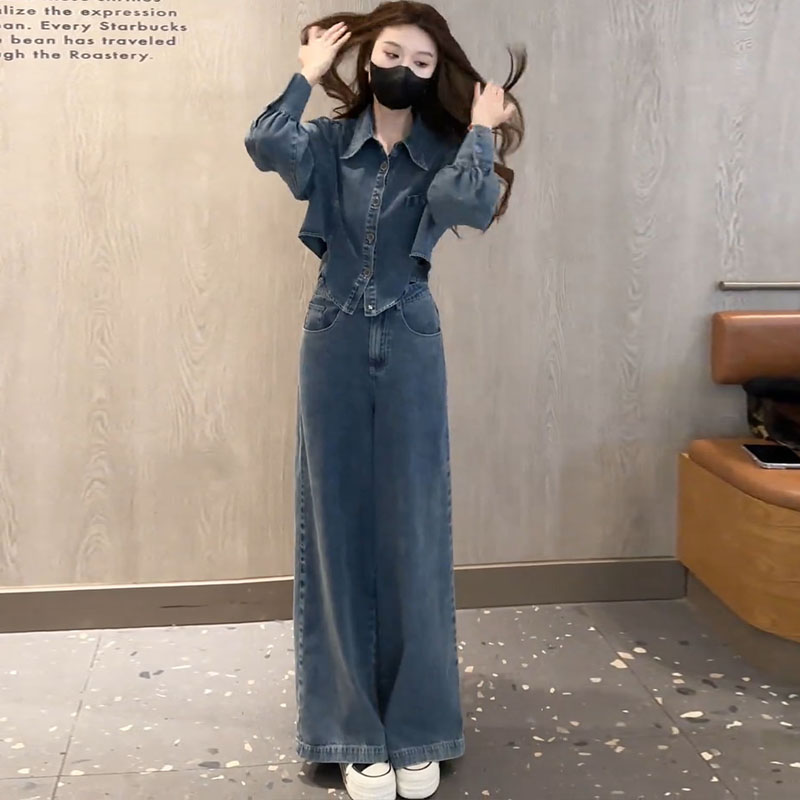 BY12057# 韩版时尚潮流百搭显瘦长袖上衣+阔腿裤牛仔两件套女 服裝批發女裝批發服飾貨源