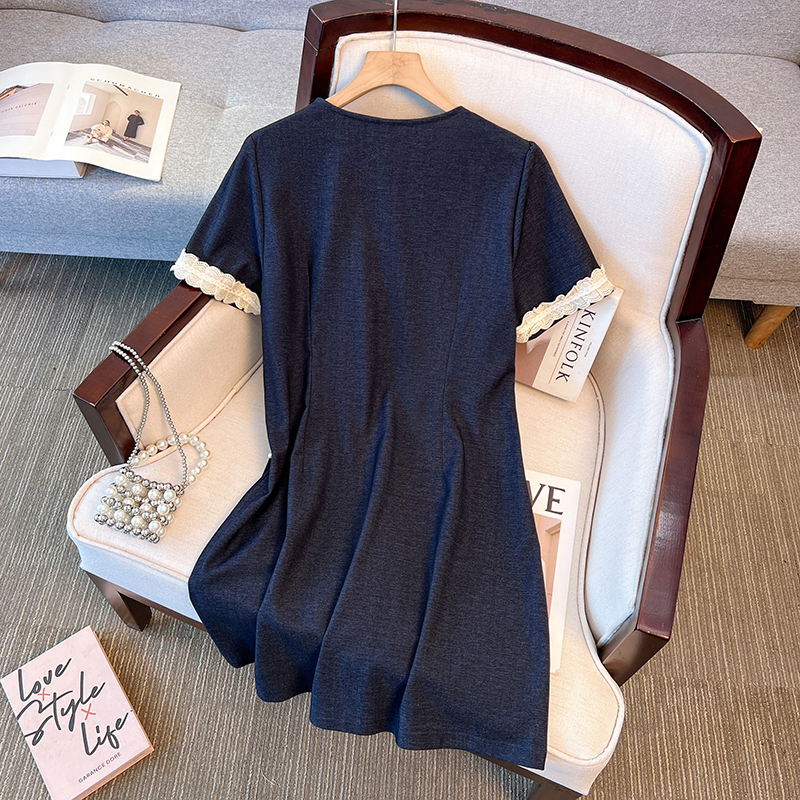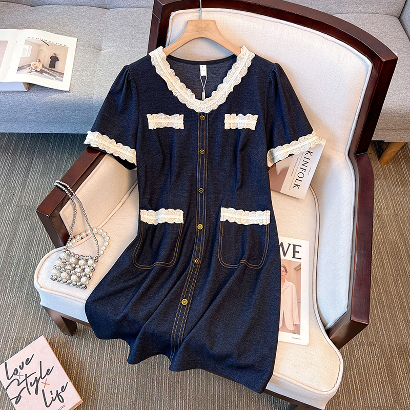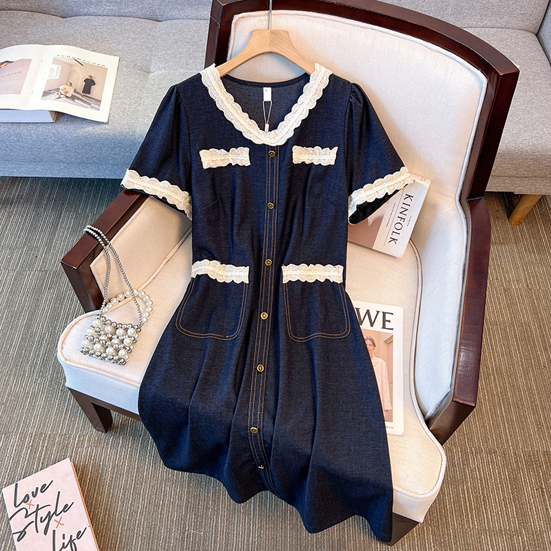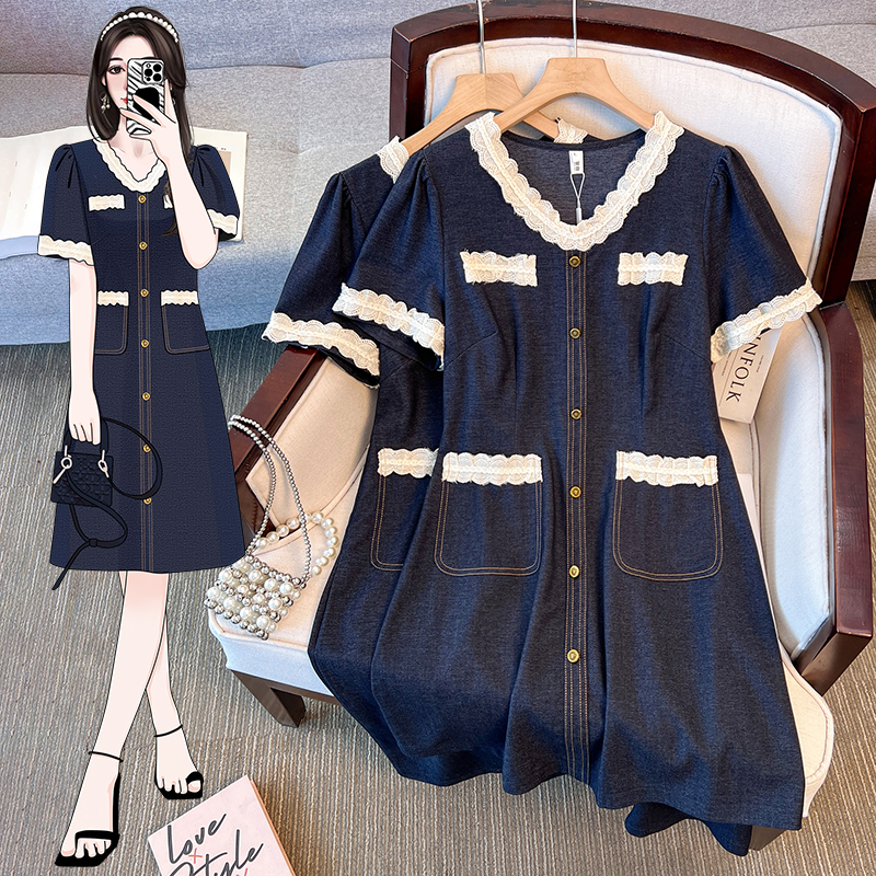 大码女装夏季新款胖mm时尚减龄花边拼接仿牛仔显瘦连衣裙 服裝批發女裝批發服飾貨源