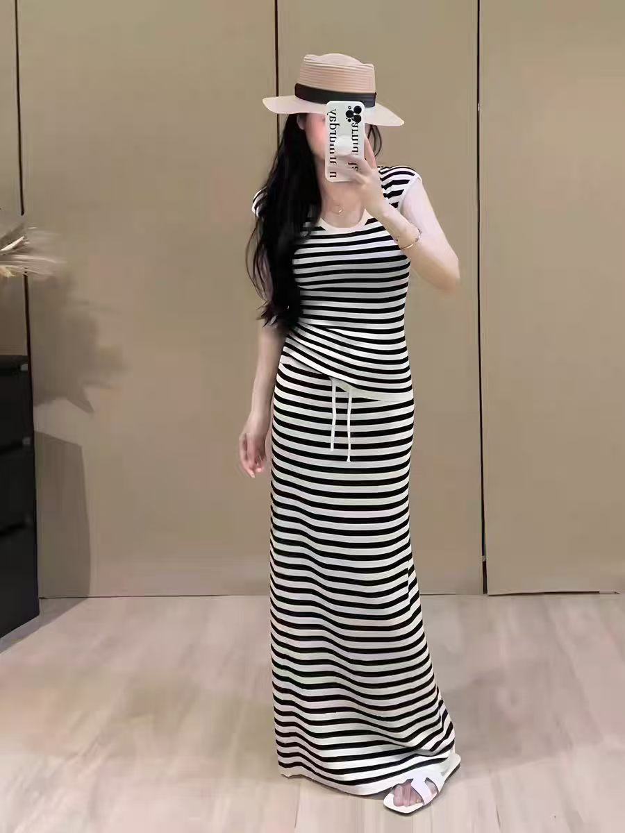 Home > 韩版套装 > BY12090# 法式休闲简约慵懒风条纹U领短袖爆款T恤女夏季高腰直筒半身裙套装 服裝批發女裝批發服飾貨源