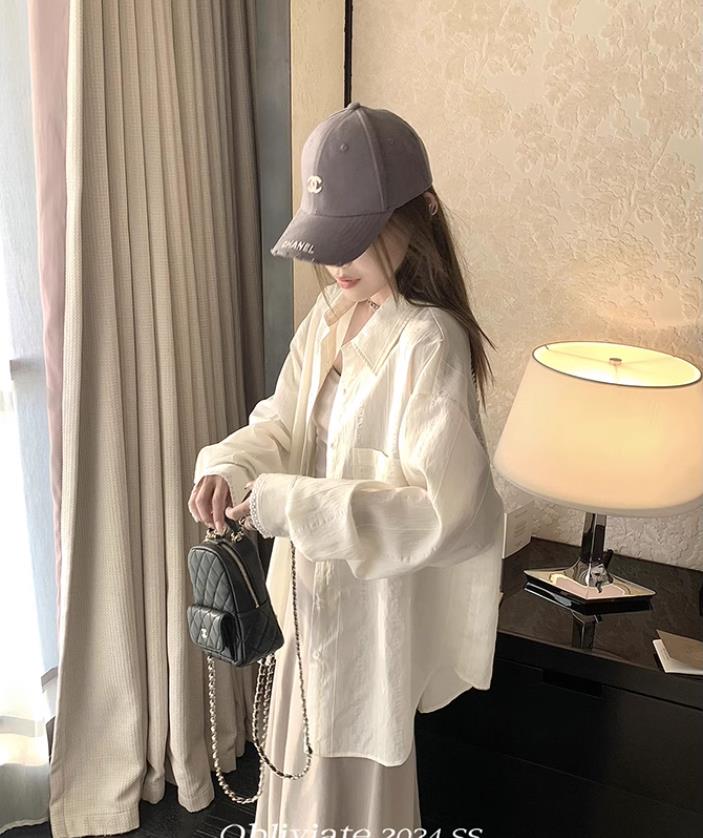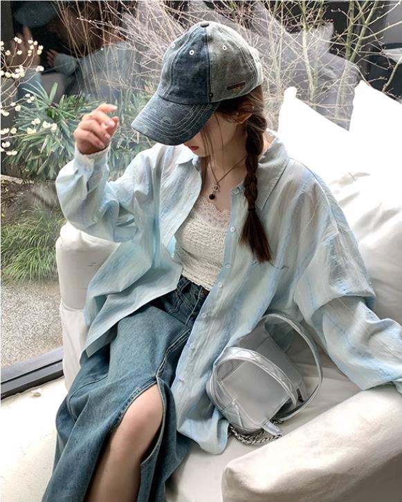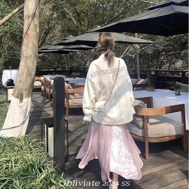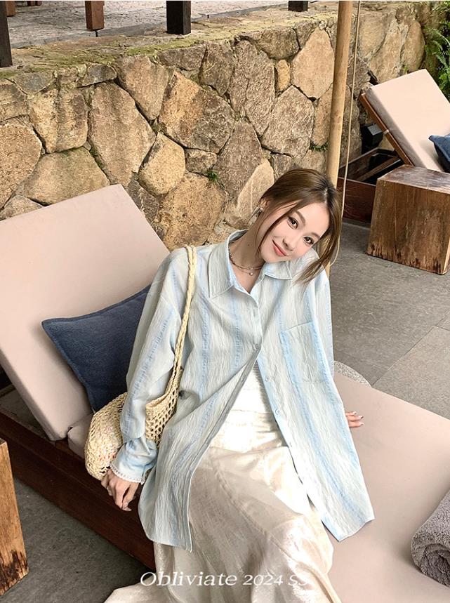 一忘皆空/背后小心机’23%天丝浅蓝衬衫女夏季蕾丝拼接长袖上衣 服裝批發女裝批發服飾貨源