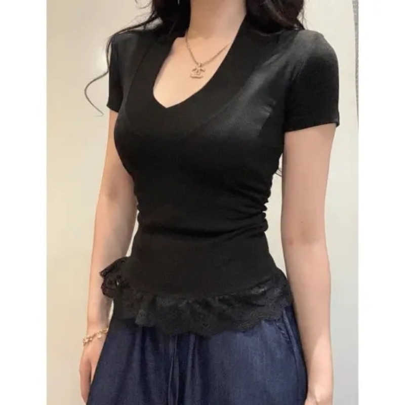 BY12316# 蕾丝拼接v领短袖T恤女夏褶皱修身内搭辣妹灰色正肩上衣 服裝批發女裝批發服飾貨源
