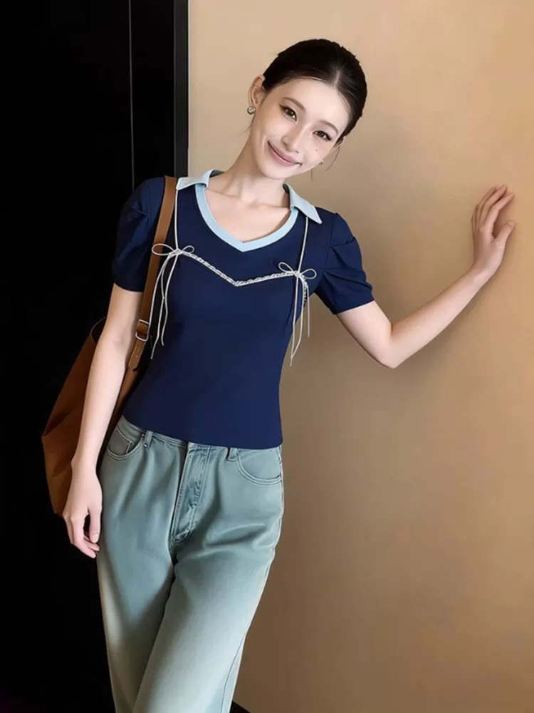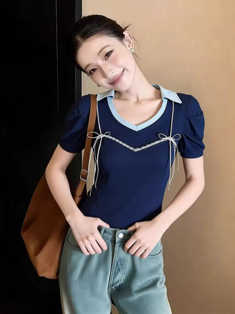 BY12320# 夏季甜辣妹蝴蝶结v领短袖t恤女高级设计感巨好看修身显瘦通勤上衣 服裝批發女裝批發服飾貨源