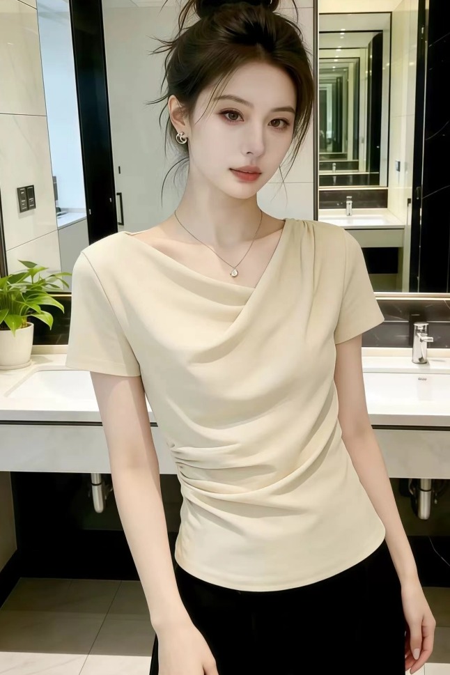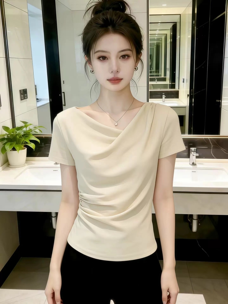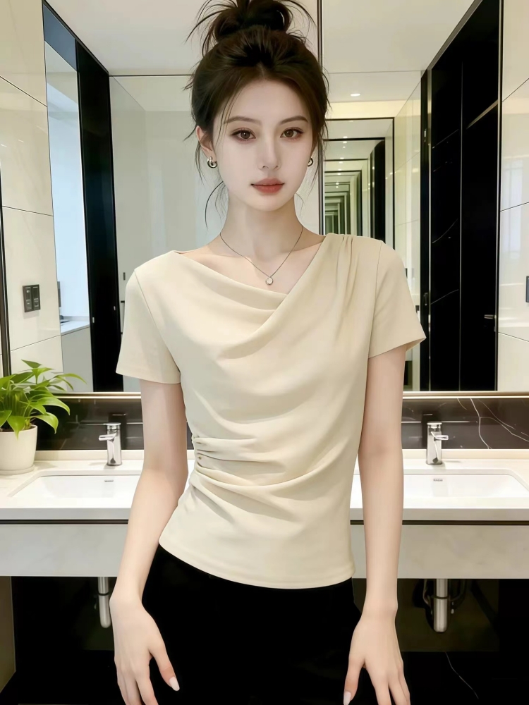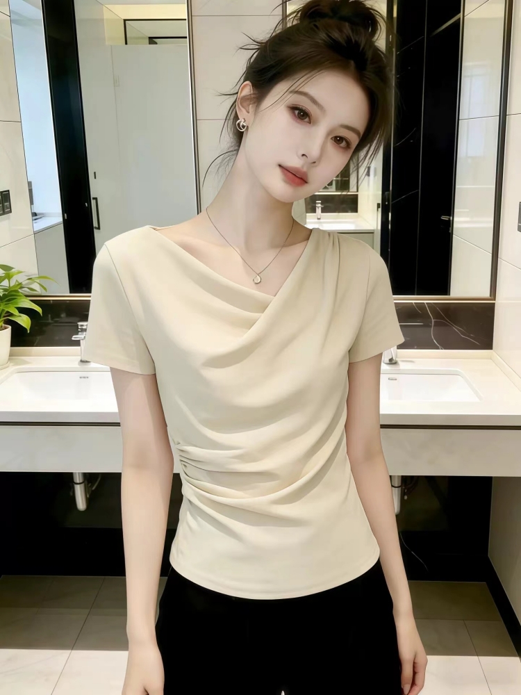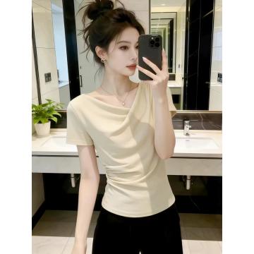 BY12338# 设计感荡领短袖t恤女夏季新款今年流行爆款修身显瘦女士上衣 服裝批發女裝批發服飾貨源