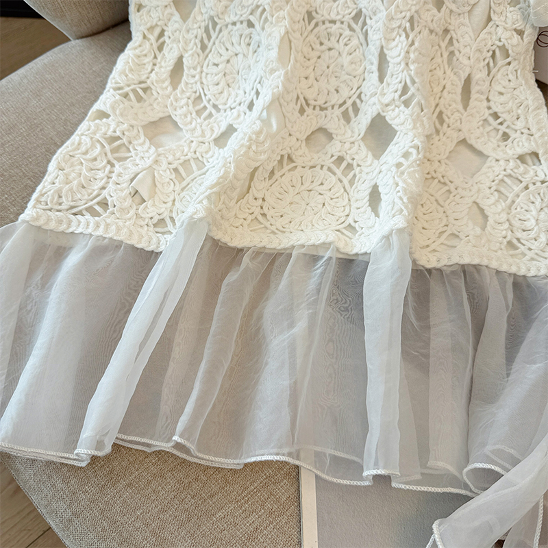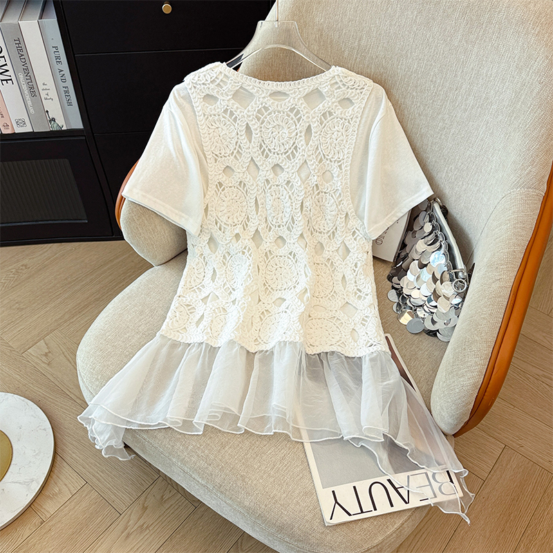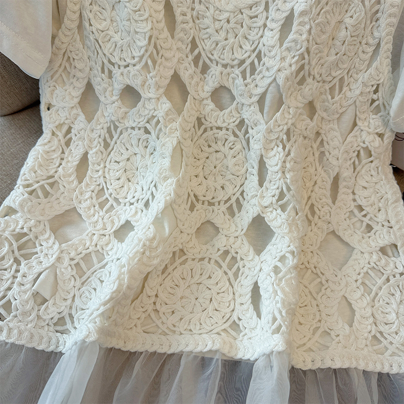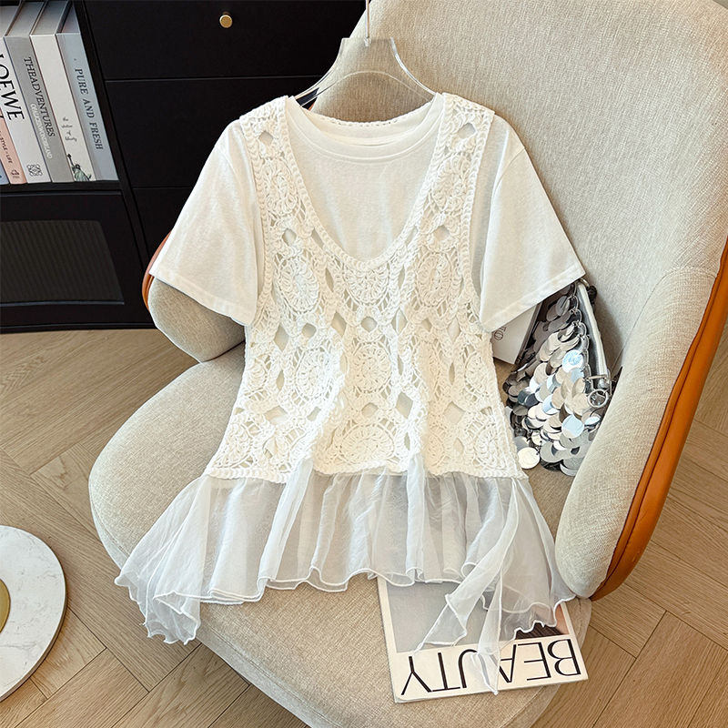 BY12346# 圆领百搭休闲短袖T恤+计感镂镂空拼接网纱背心两件套套装 服裝批發女裝批發服飾貨源