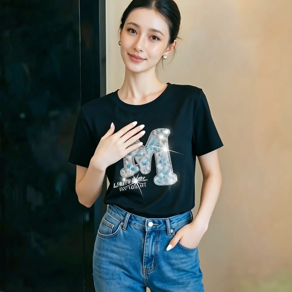 BY12388# 夏季新款洋气时尚字母烫钻立体圆领短袖T恤上衣女 服裝批發女裝批發服飾貨源