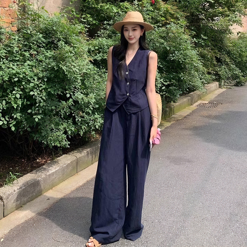 夏季新款天丝亚麻混纺马甲套装气质通勤藏青阔腿裤两件套 服裝批發女裝批發服飾貨源