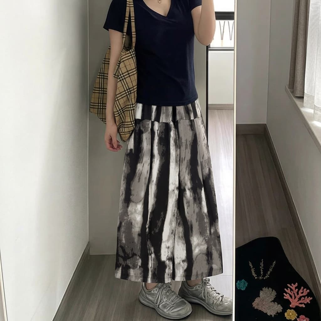 BY14383# 开叉设计感印花半身裙裤女夏季新款大码胖mm宽松显瘦遮胯阔腿裤子 服裝批發女裝批發服飾貨源