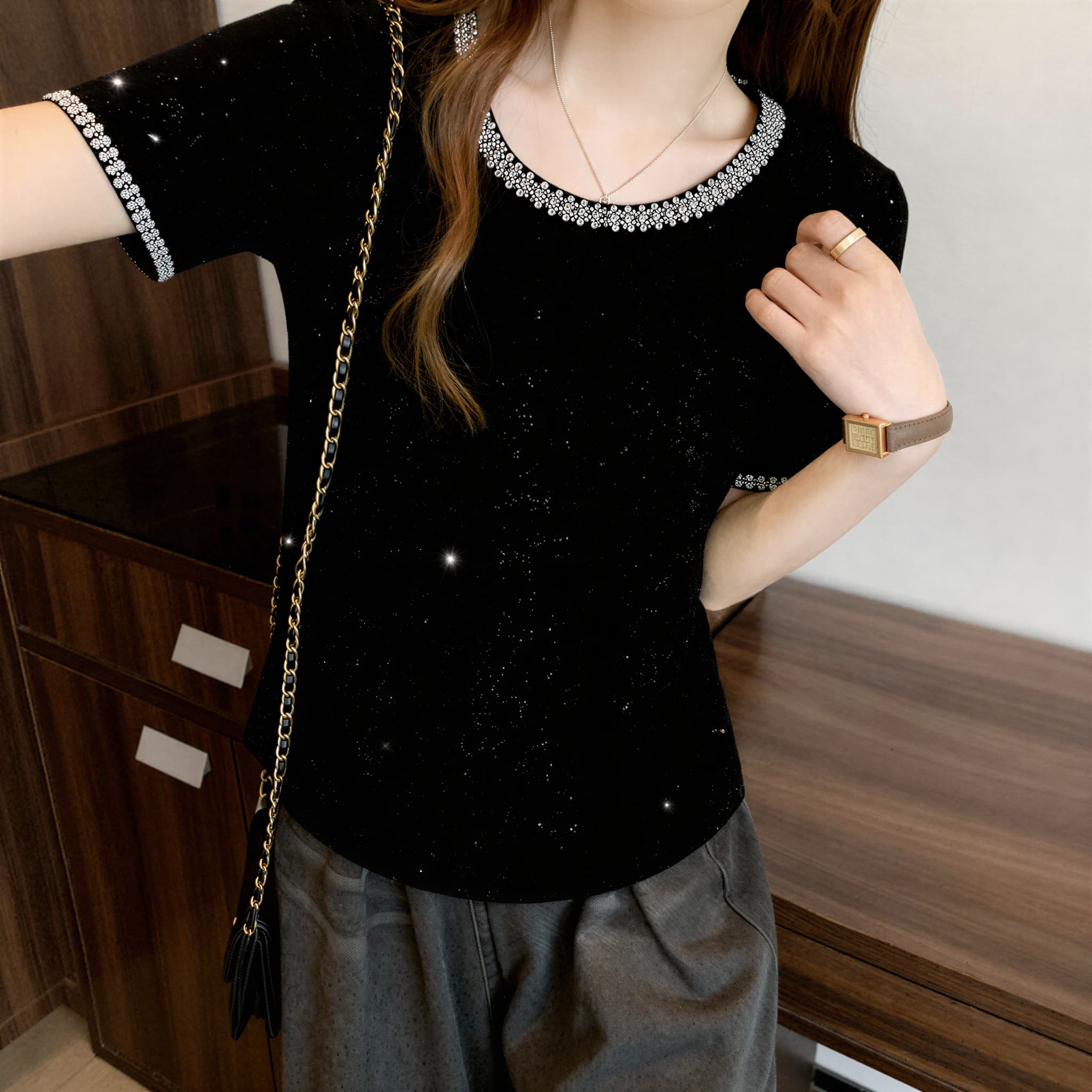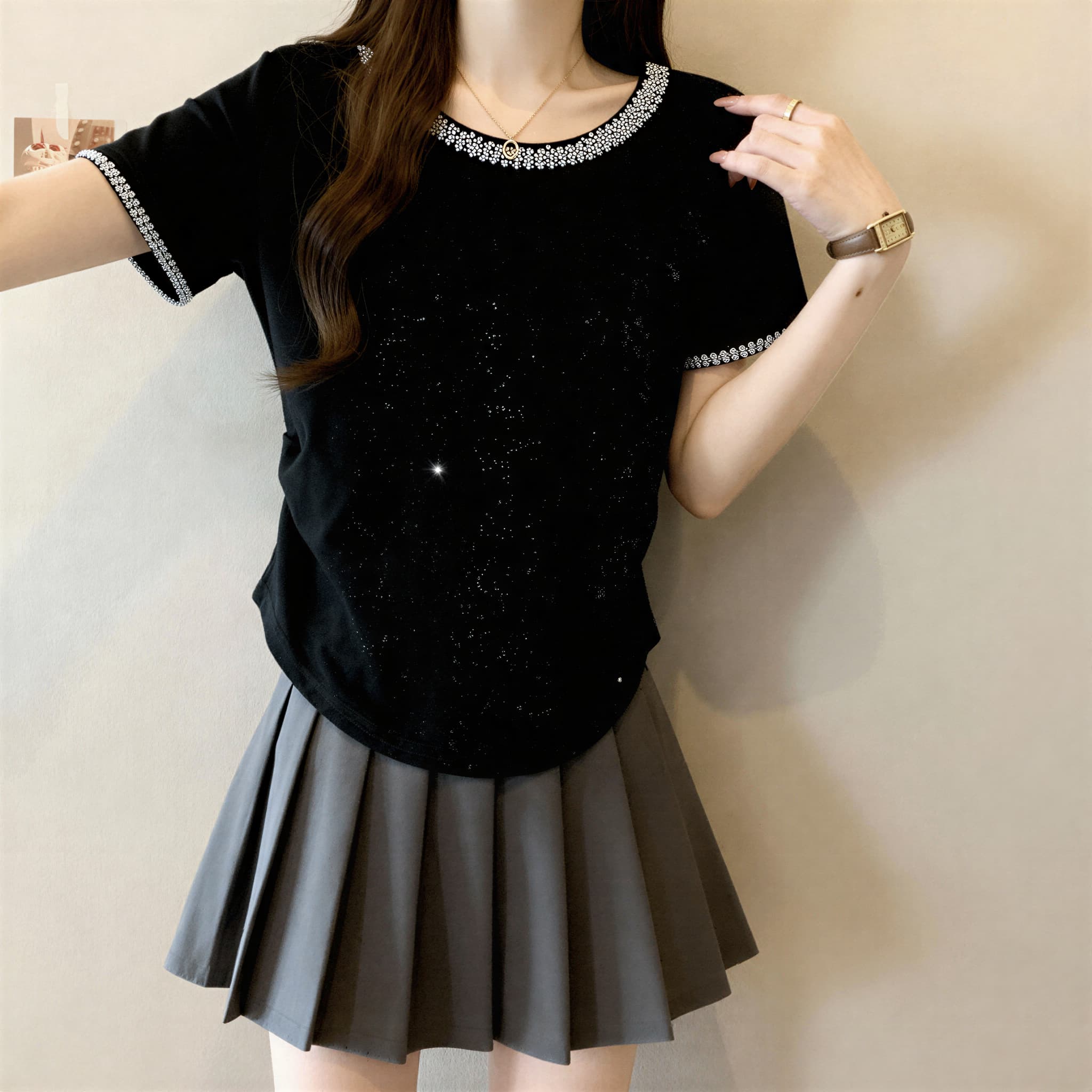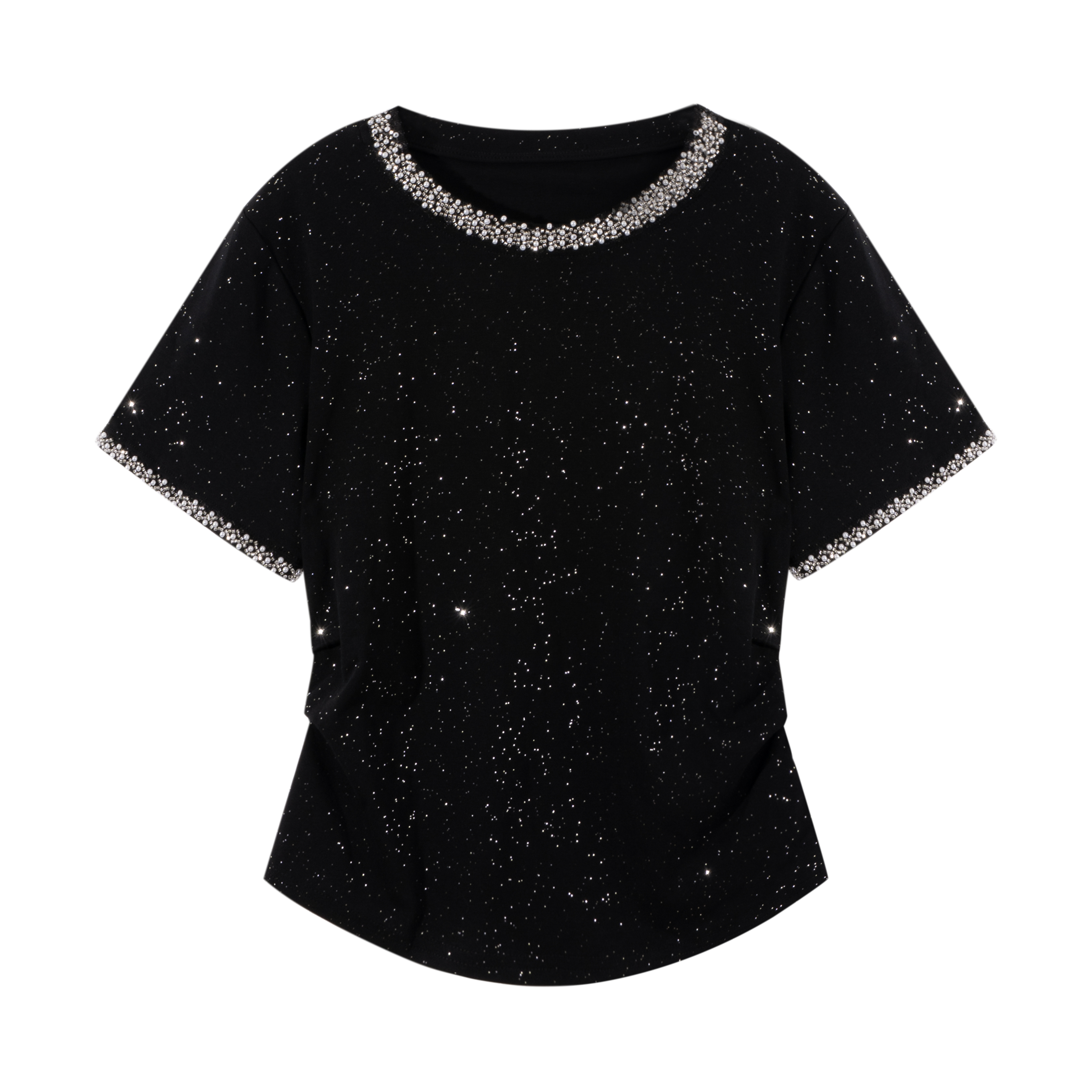 BY14398# 重工满天星镶钻圆领短袖t恤大码微胖MM夏季显瘦气质修身上衣 服裝批發女裝批發服飾貨源