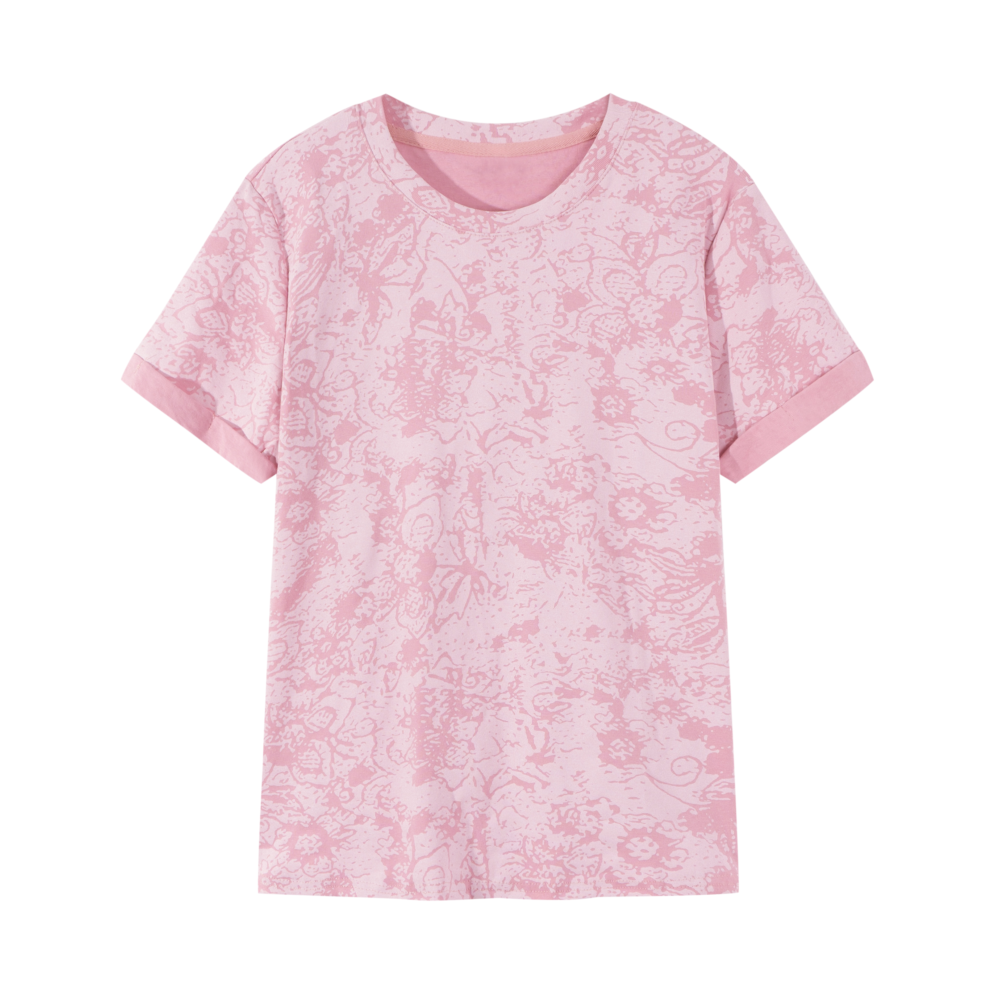 BY14403# 夏季新款欧货粉色印花圆领短袖t恤大码女胖MM设计感别致洋气上衣 服裝批發女裝批發服飾貨源