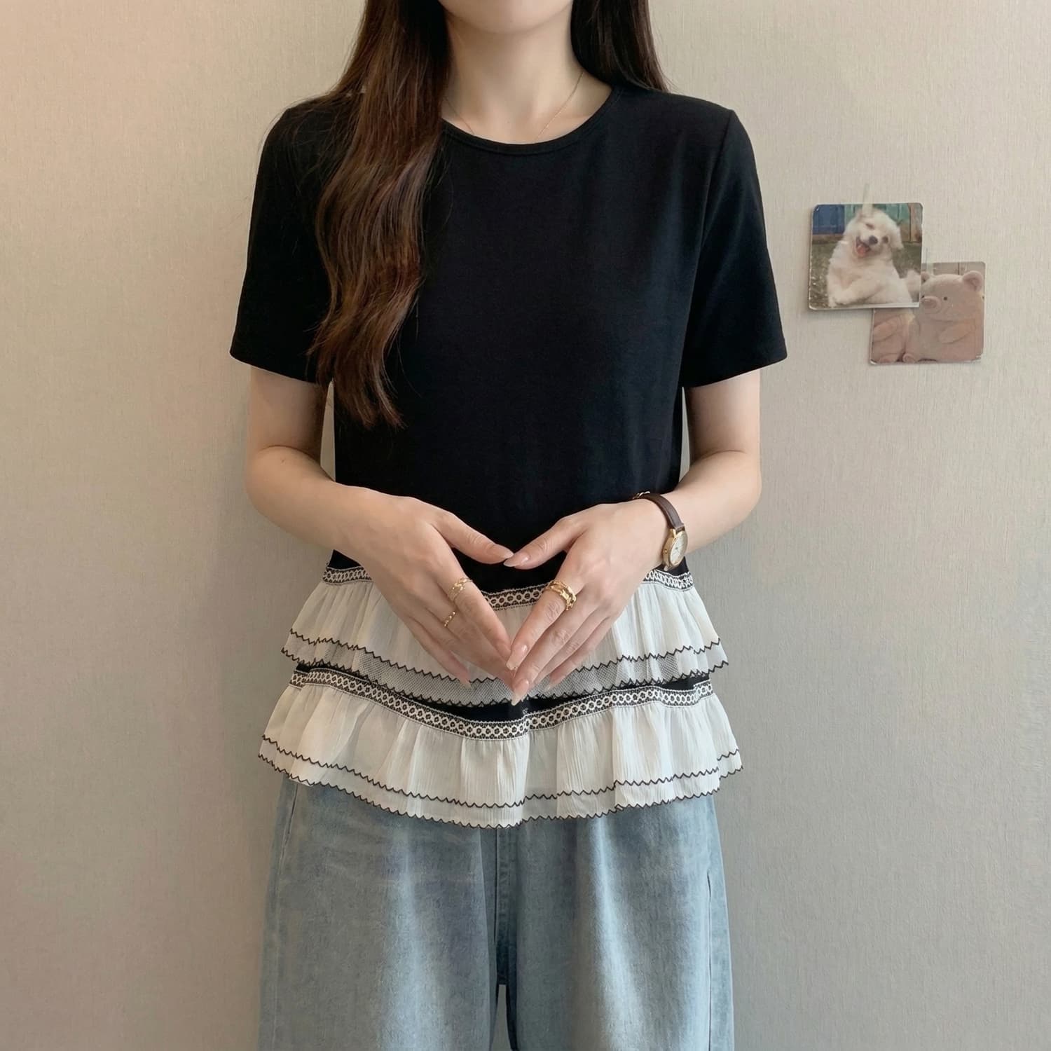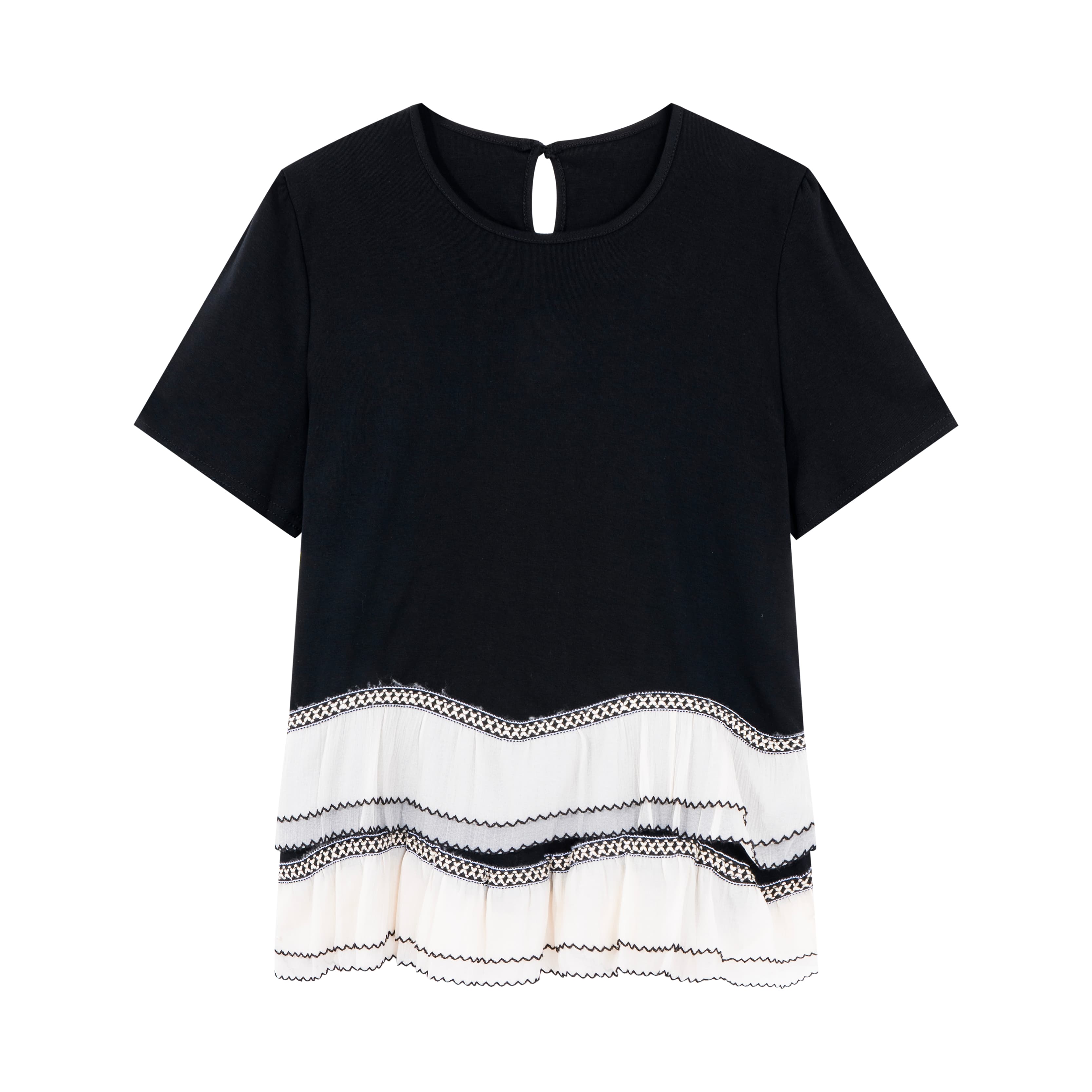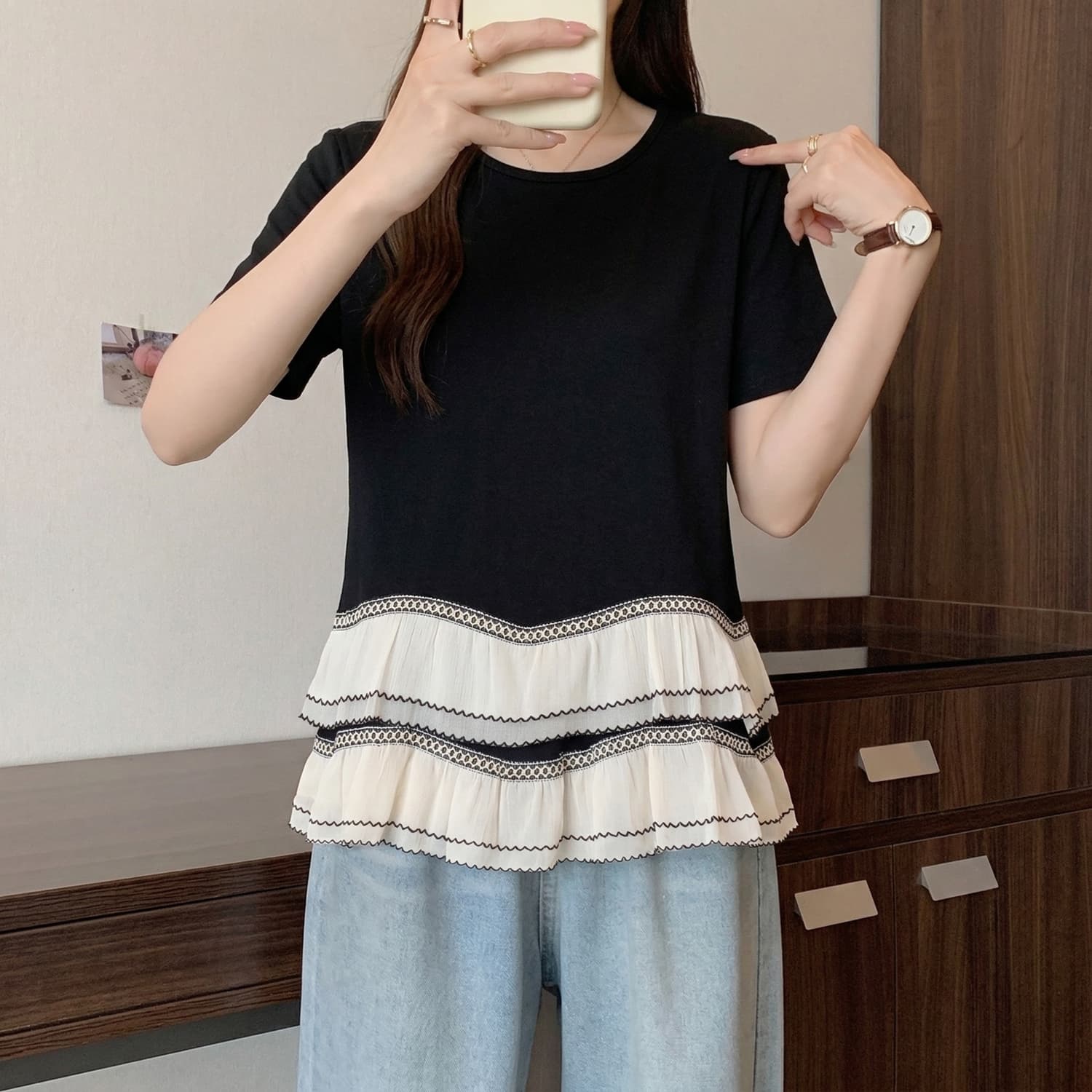 BY14413# 大码法式黑色圆领短袖T恤女夏季新款双层荷叶边设计感上衣 服裝批發女裝批發服飾貨源