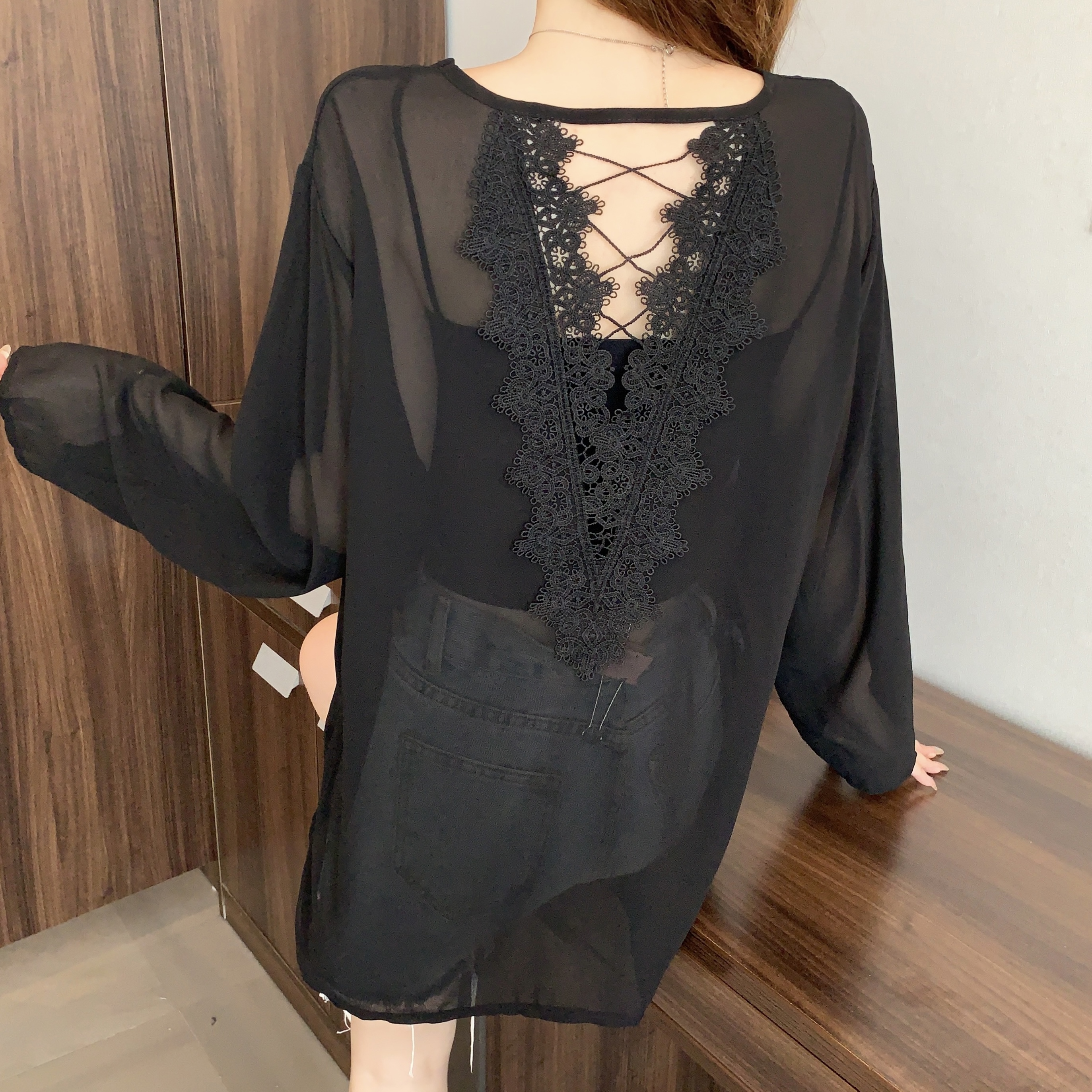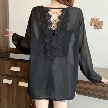 BY14869# 大码女装夏季新款开叉露背蕾丝拼接绑带雪纺上衣防晒衫 服裝批發女裝批發服飾貨源