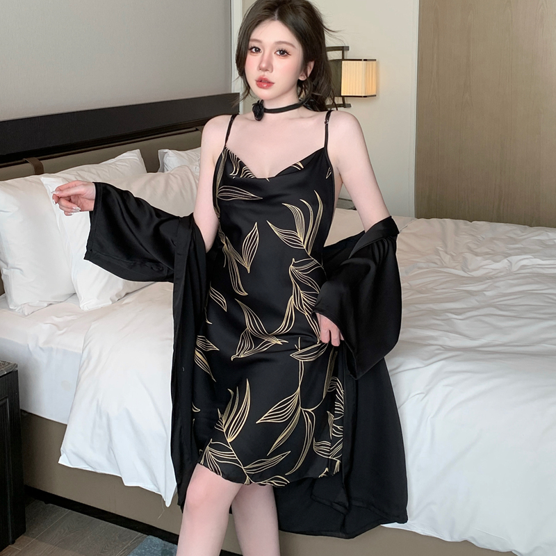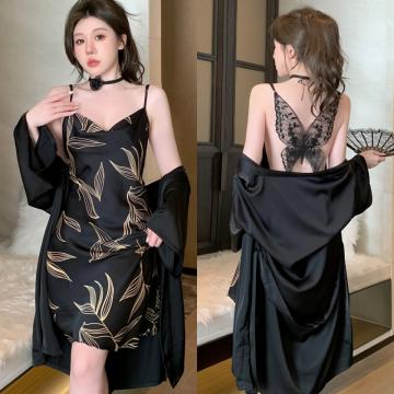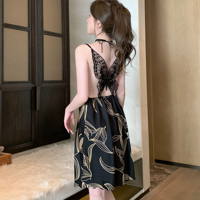 BY14877# 性感睡衣缎面冰丝吊带睡裙睡袍套装后背蝴蝶蕾丝高级感家居服 睡裙批发睡衣批发家居服批发
