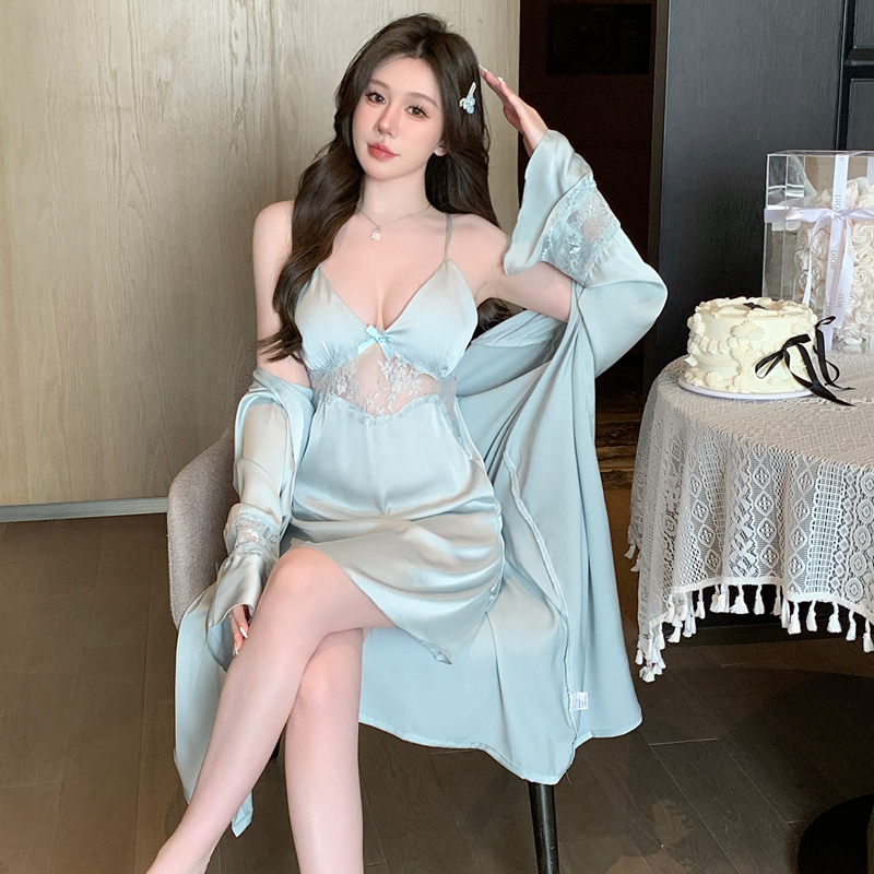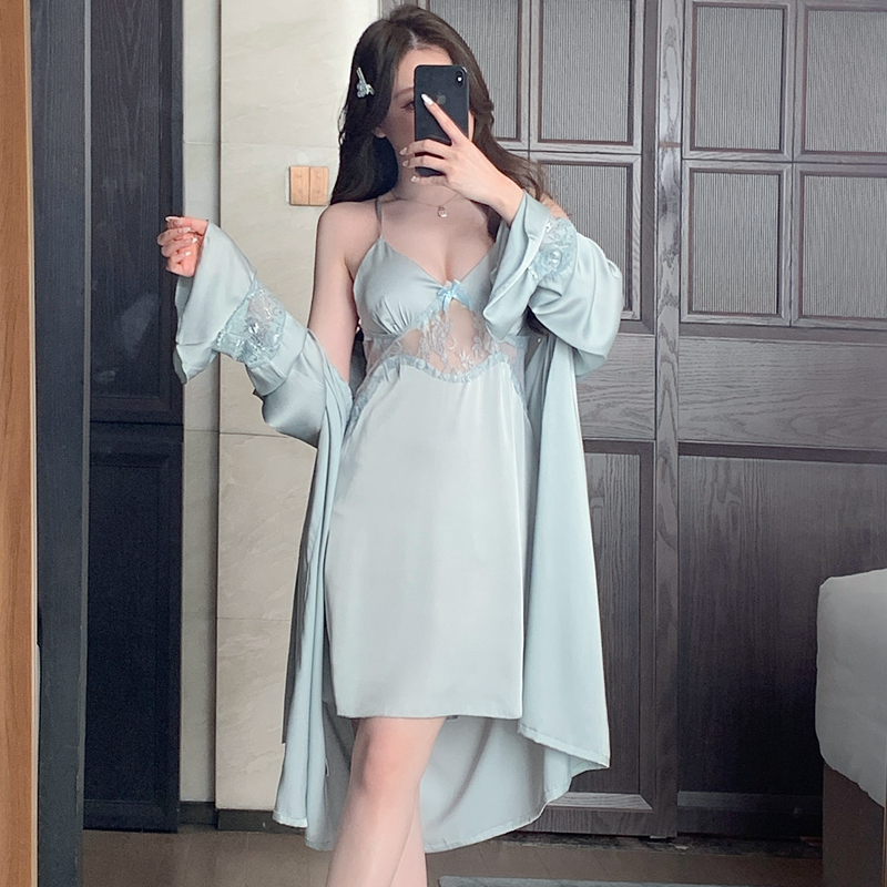 BY14884# 新款性感睡衣女冰丝吊带睡裙睡袍两件套蕾丝花边带胸垫家居服 睡裙批发睡衣批发家居服批发