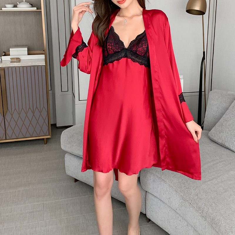 BY14902# 春夏性感睡衣女冰丝吊带睡裙睡袍两件套蕾丝美背带胸垫纯欲家居服 睡裙批发睡衣批发家居服批发