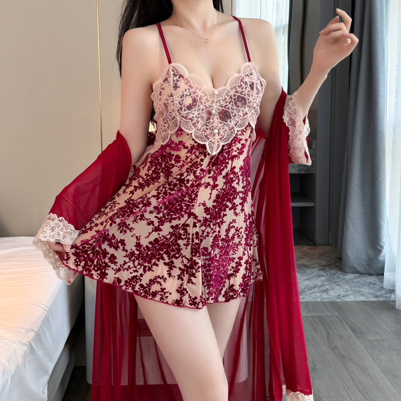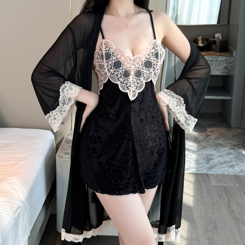 BY14906# 性感睡衣女烧花丝绒吊带睡裙网纱外袍蕾丝低胸带胸垫纯欲风家居服 睡裙批发睡衣批发家居服批发