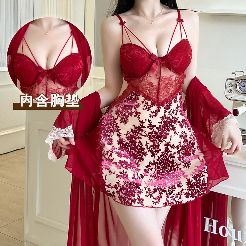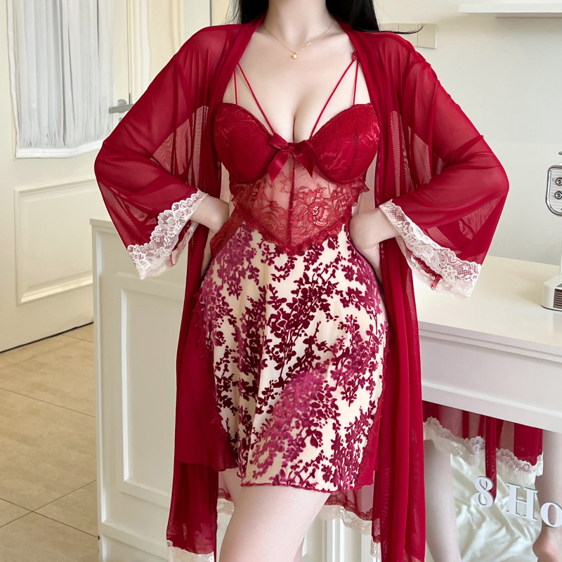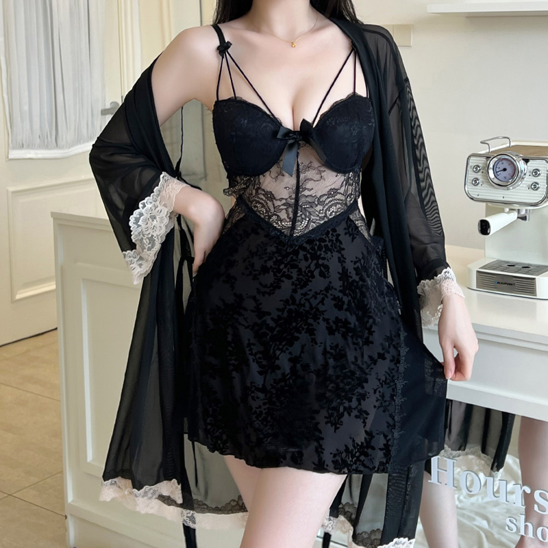 BY14908# 性感睡衣女烧花丝绒吊带睡裙网纱外袍蕾丝低胸带胸垫纯欲风家居服 睡裙批发睡衣批发家居服批发