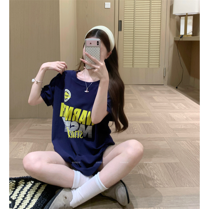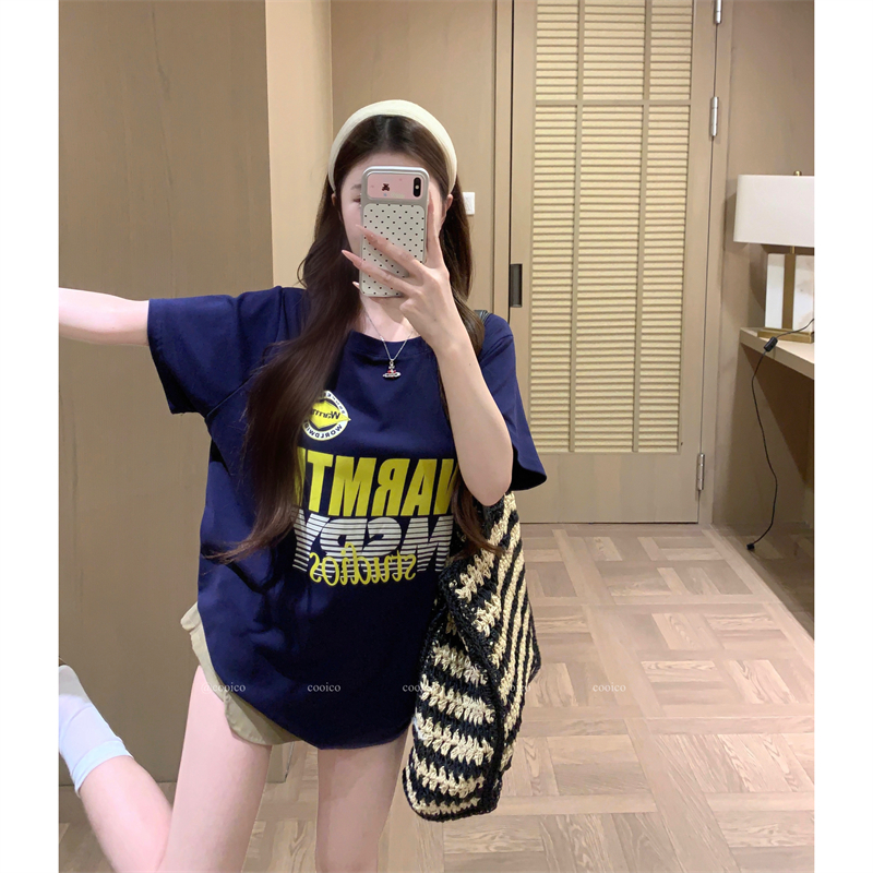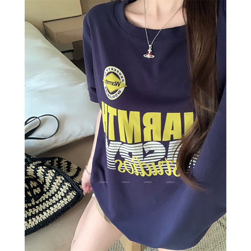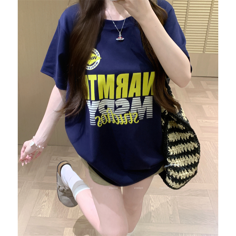 BY15897# 大码胖mm正肩夏季复古休闲百搭撞色字母印花纯棉短袖t恤女 服裝批發女裝批發服飾貨源