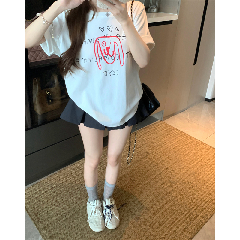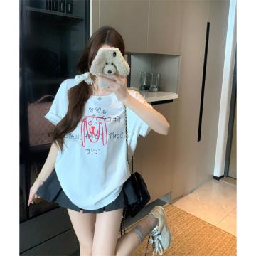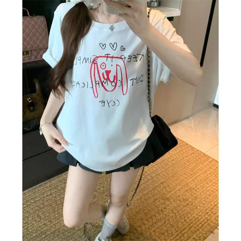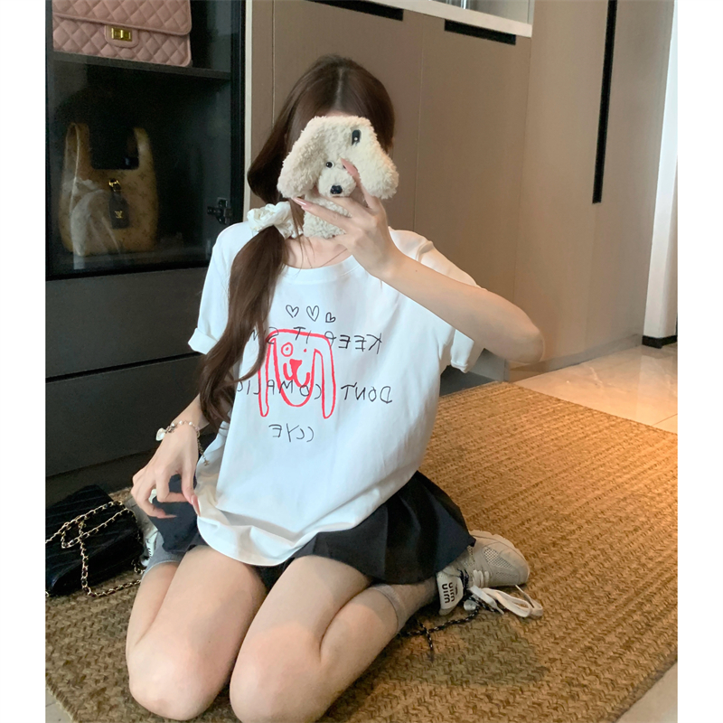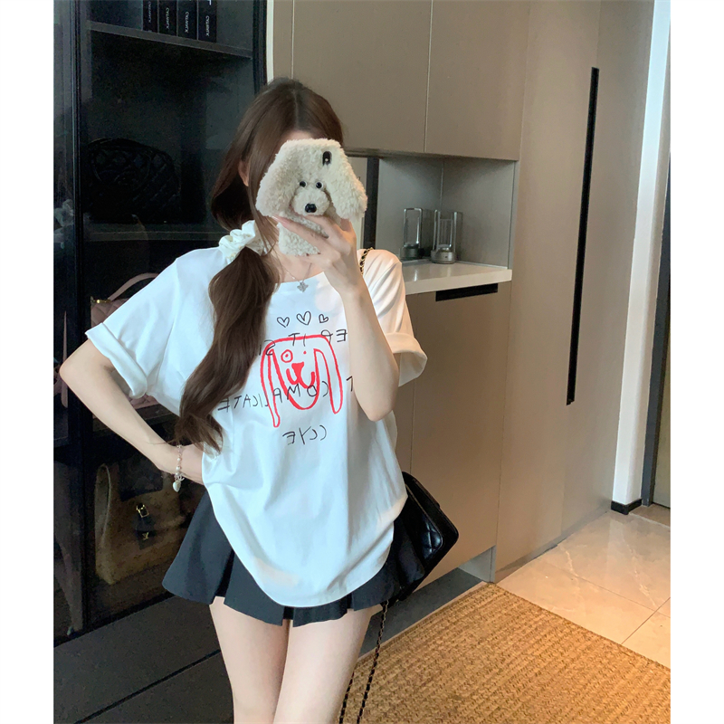 BY15898# 宽松版大码夏季胖mm正肩纯棉短袖白色小狗印花宽松T恤上衣女 服裝批發女裝批發服飾貨源