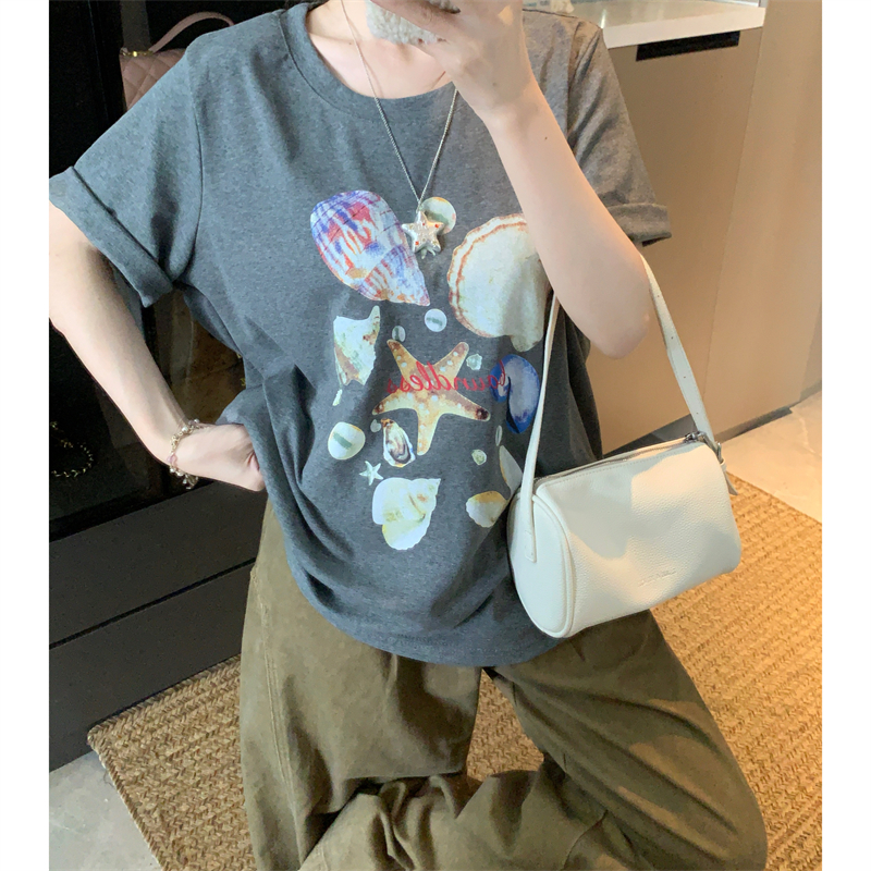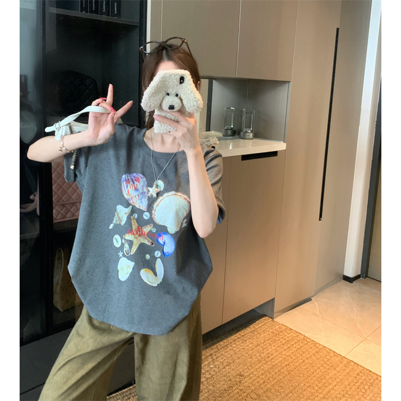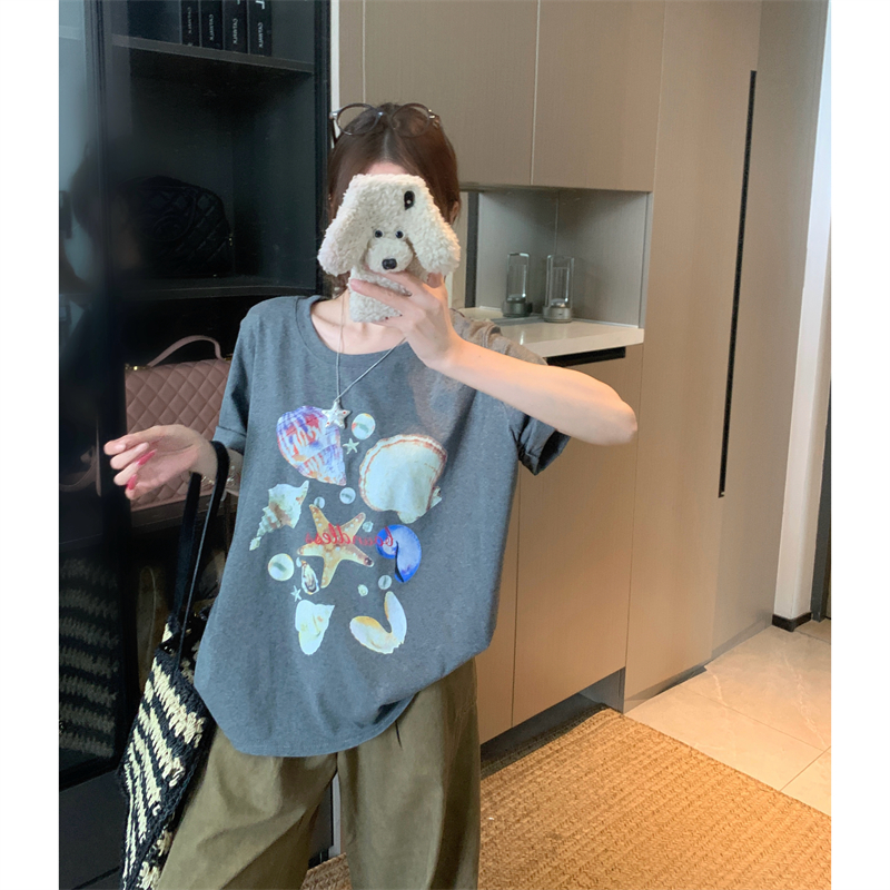 BY15900# 宽松版大码夏季胖mm正肩纯棉短袖海星贝壳印花宽松T恤上衣女 服裝批發女裝批發服飾貨源