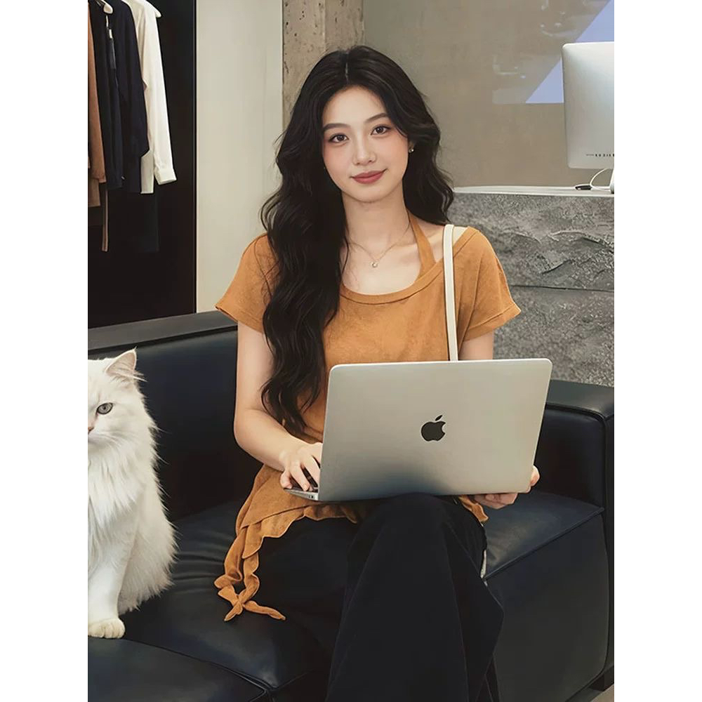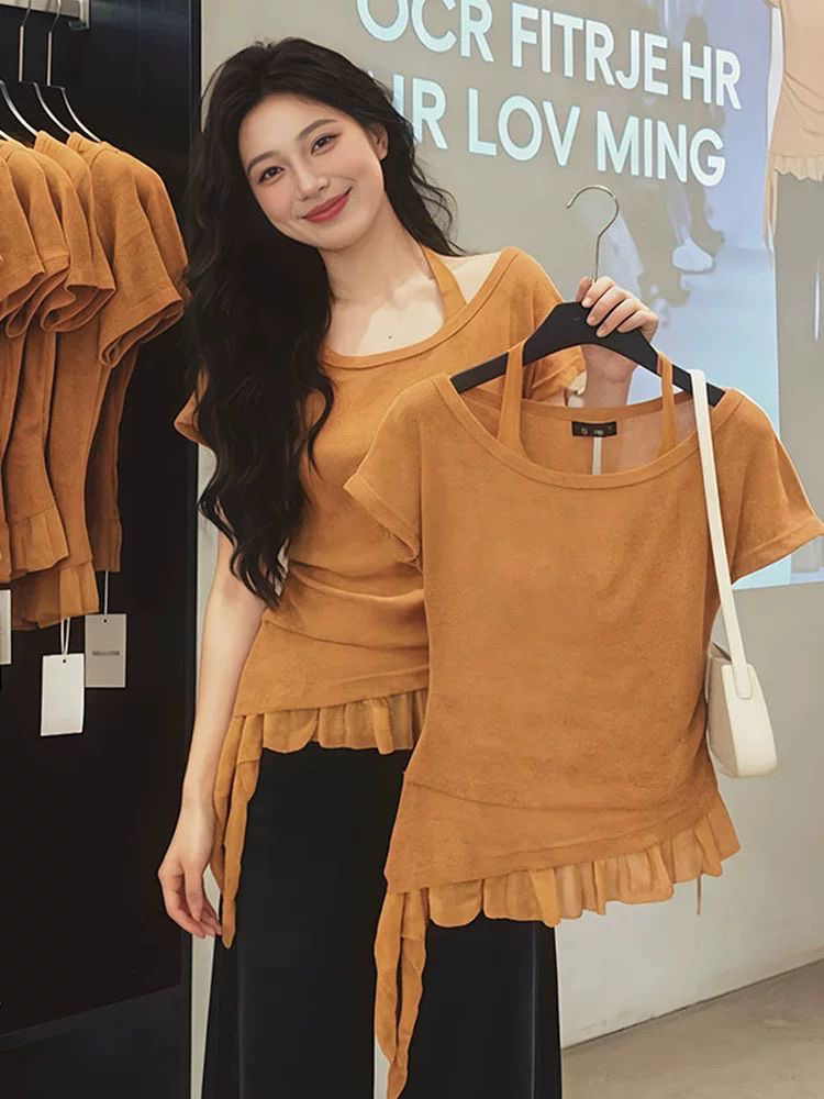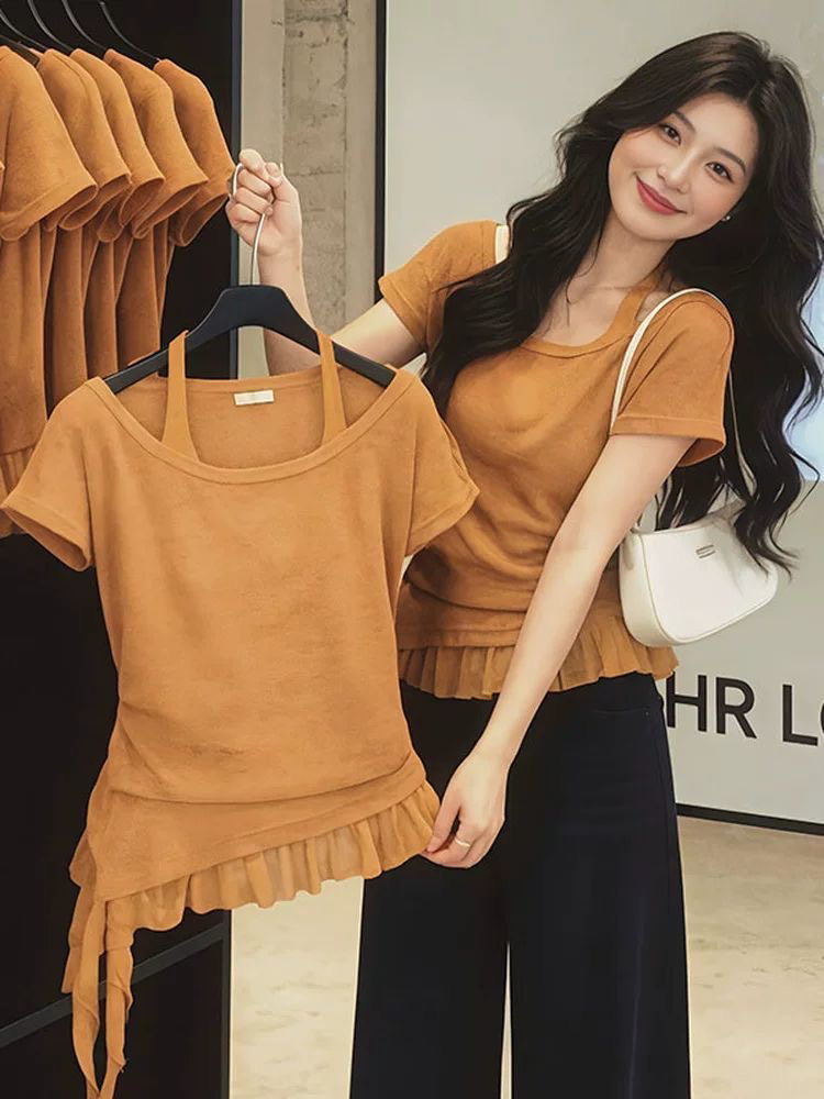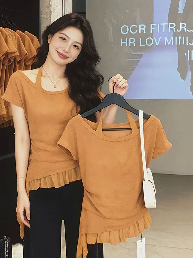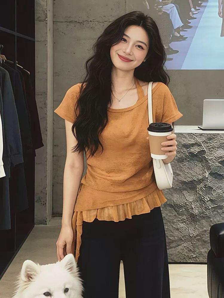 BY16149# 大码设计感不规则挂脖吊带短袖夏季300斤胖mm巨显瘦掐腰气质上衣 服裝批發女裝批發服飾貨源