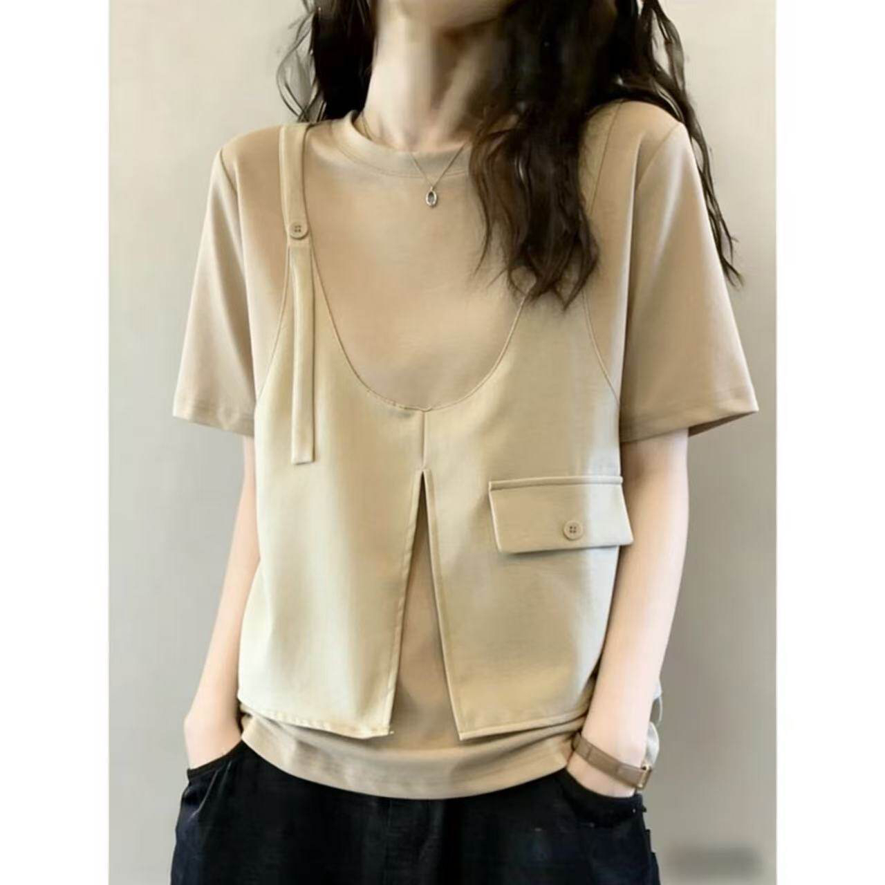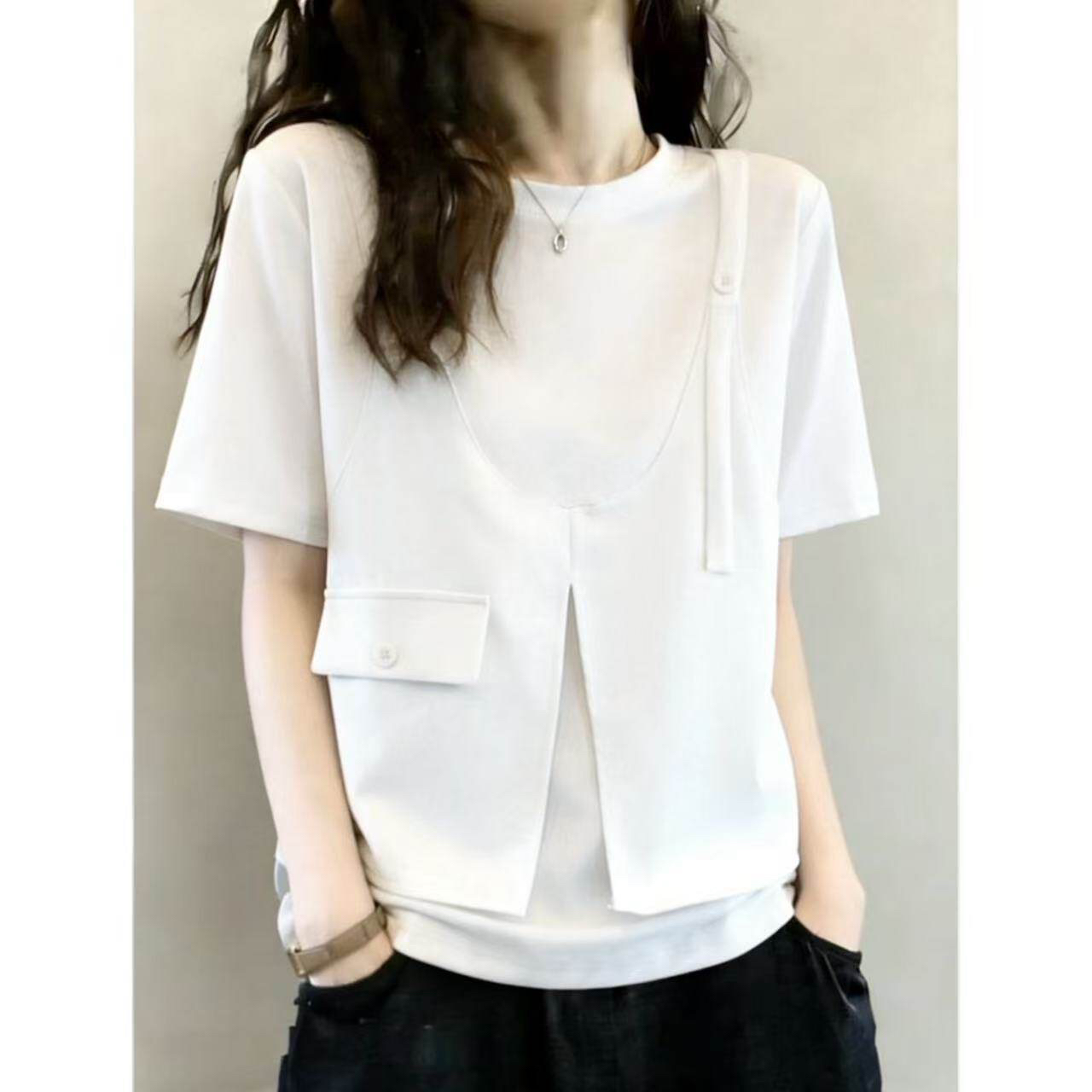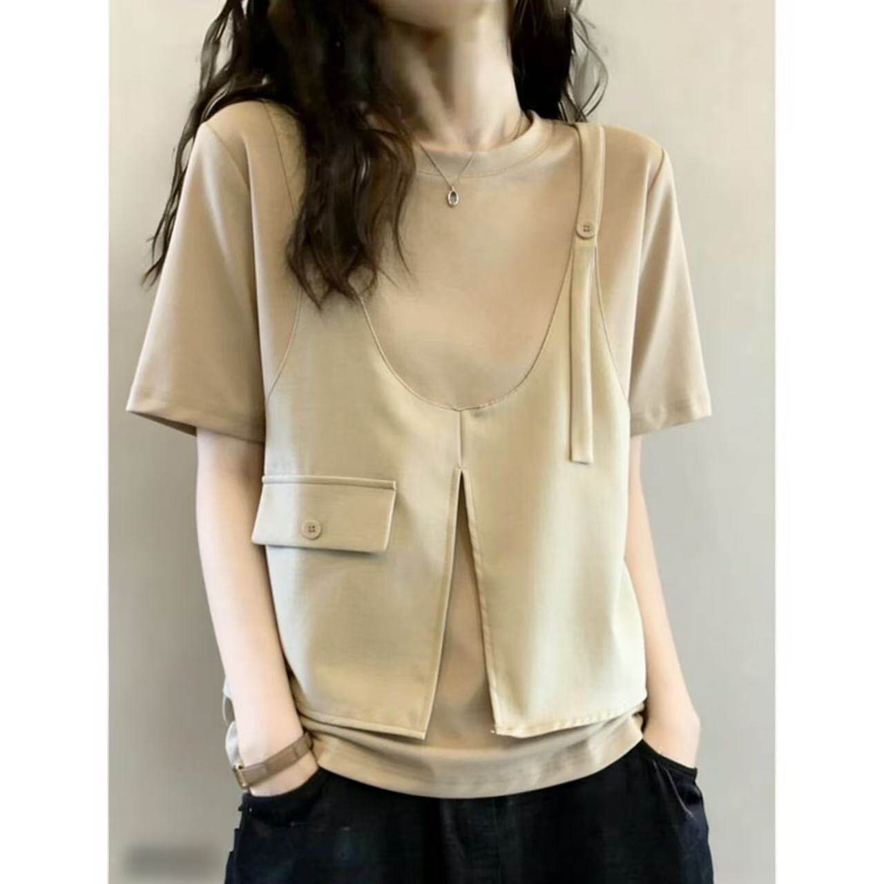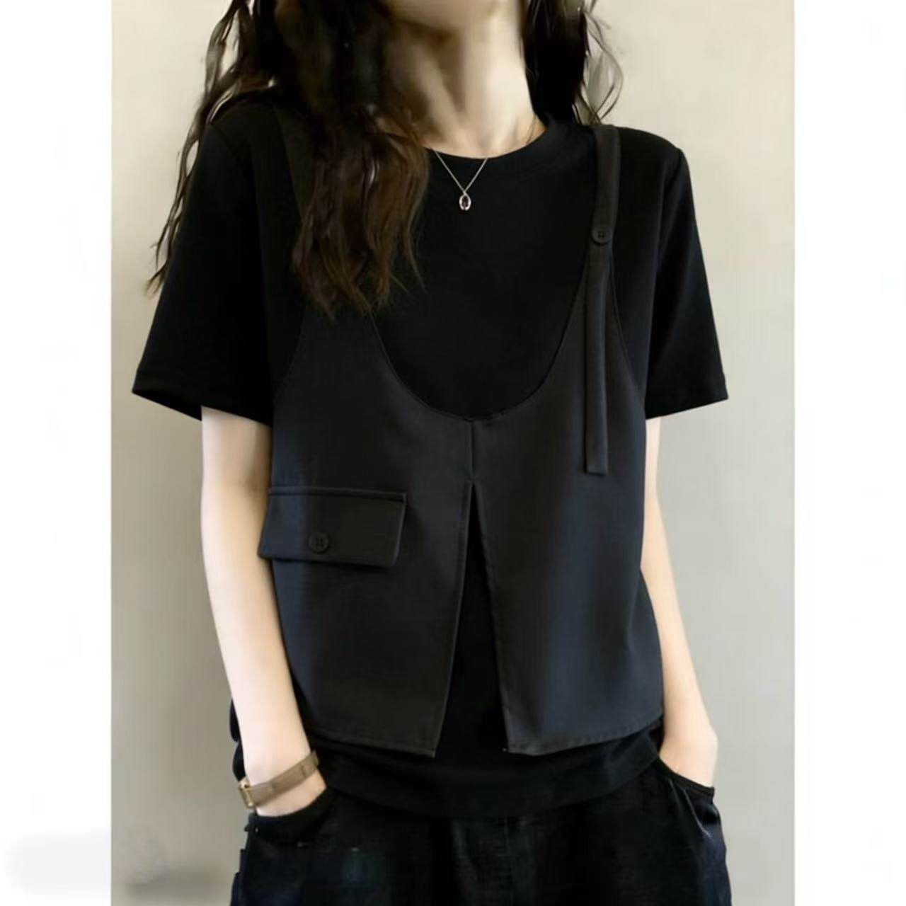 BY16152# 设计感假两件马甲短袖T恤女夏季大码胖mm工装风显瘦遮肚别致上衣 服裝批發女裝批發服飾貨源