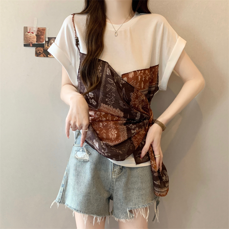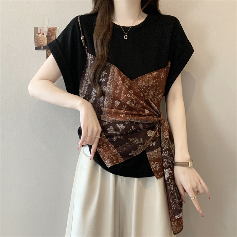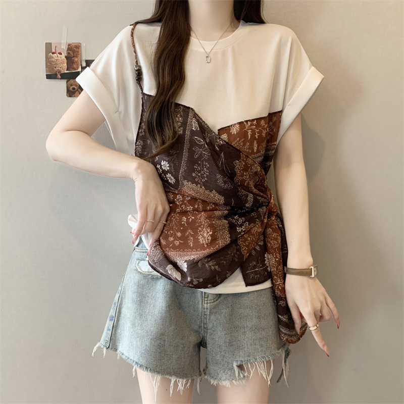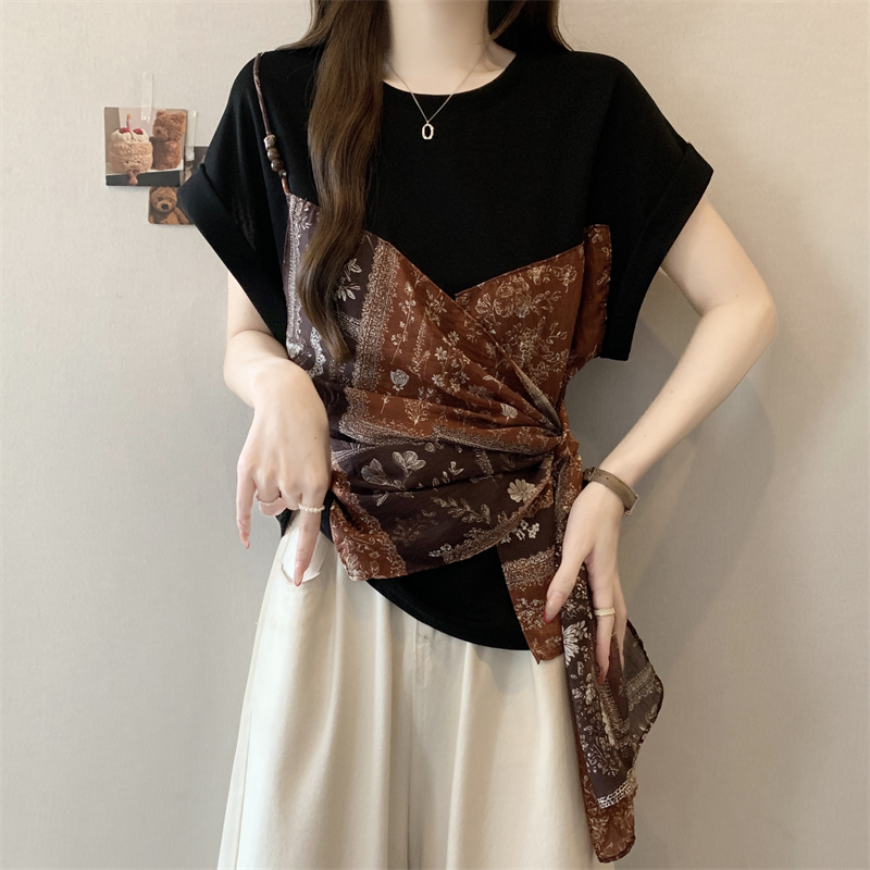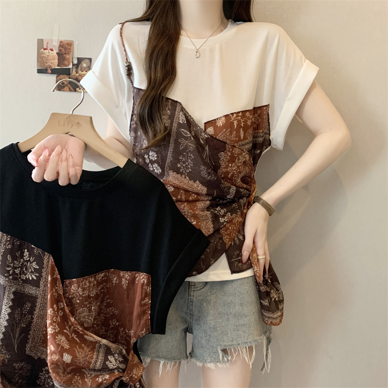 BY16196# 大码胖MM新款设计感不规则拼接假两件上衣遮肉显瘦T恤 服裝批發女裝批發服飾貨源