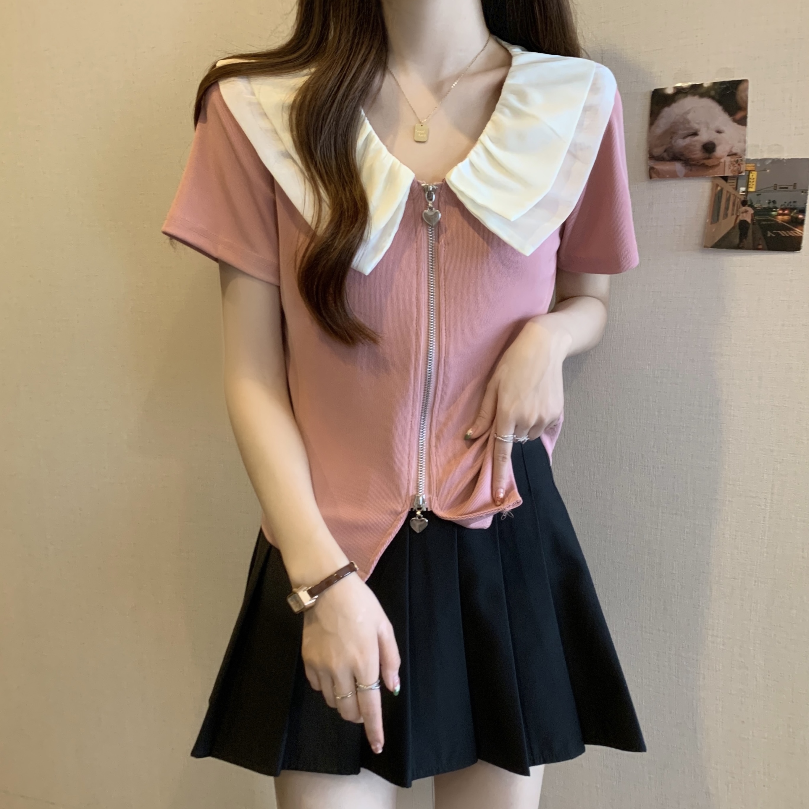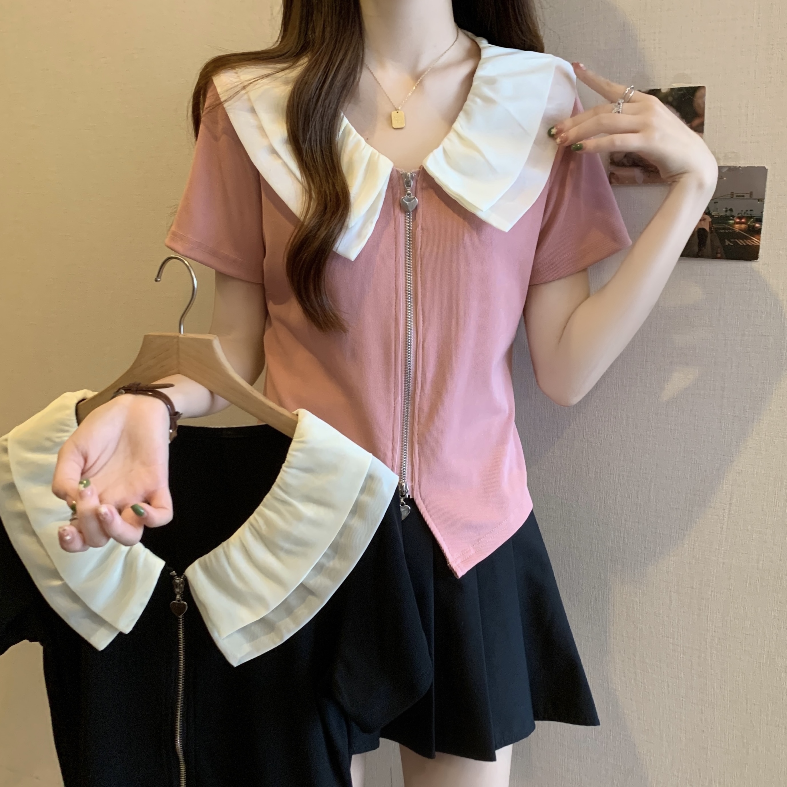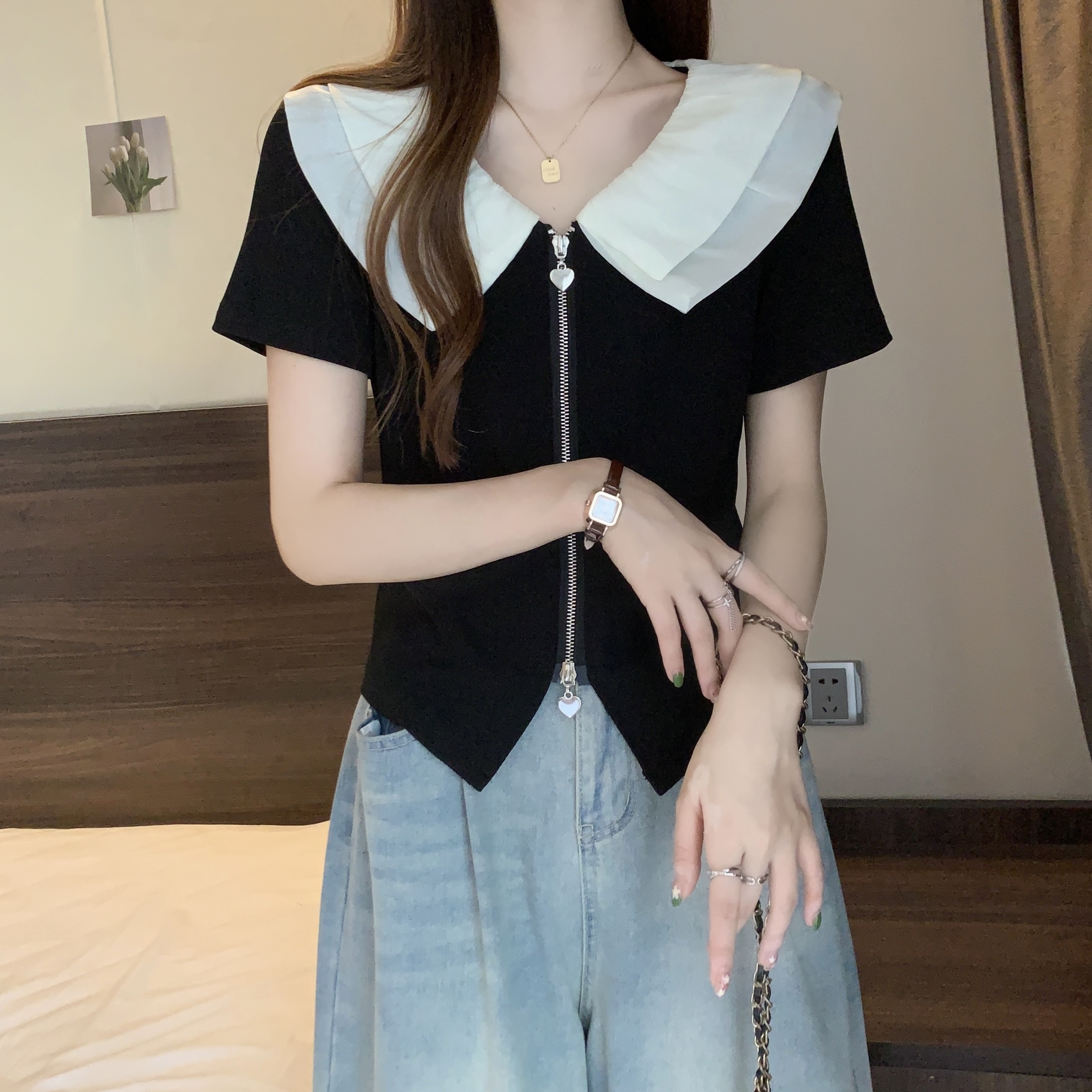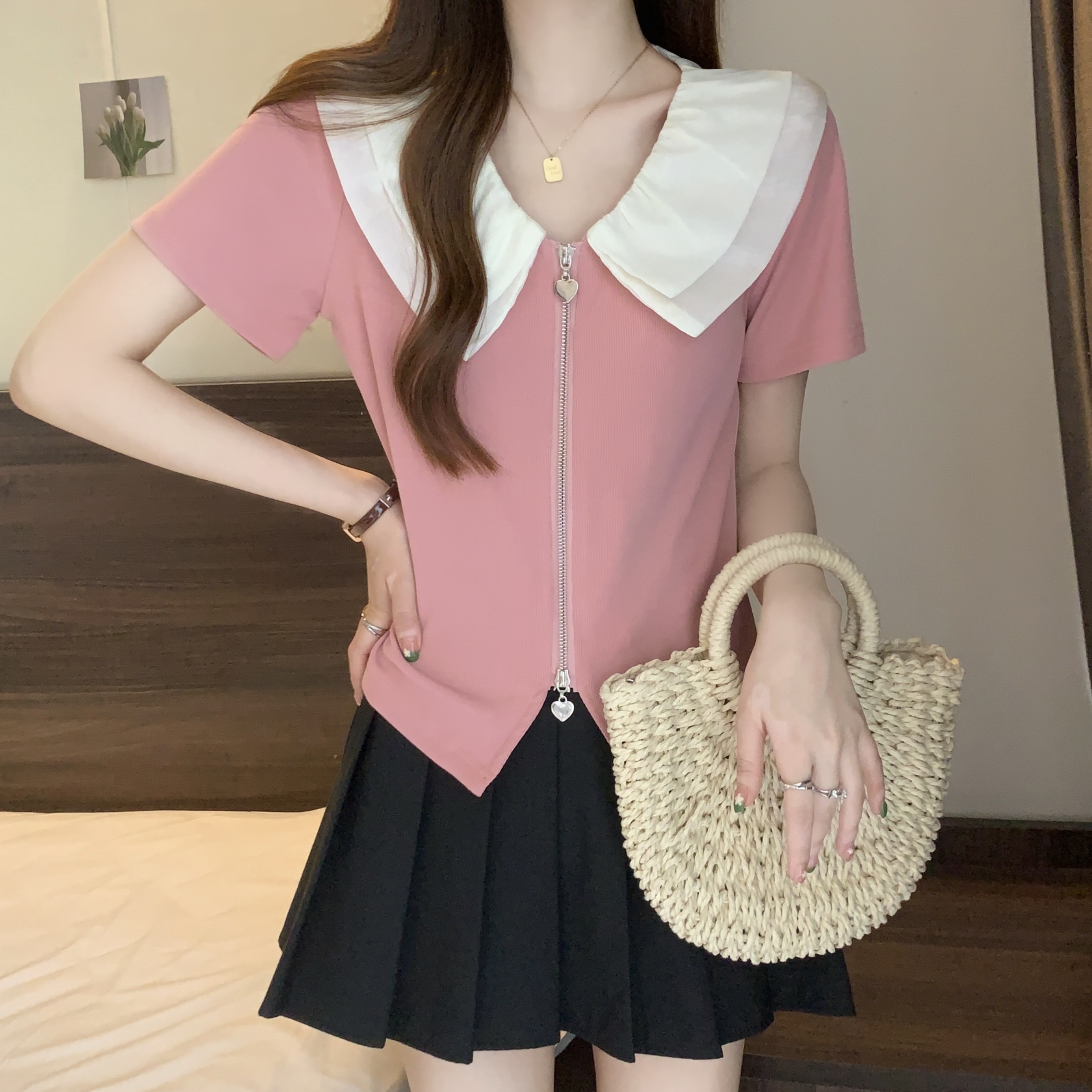 BY16296# 夏款胖MM撞色双领设计感时尚百搭上衣纯欲风修身T恤 服裝批發女裝批發服飾貨源