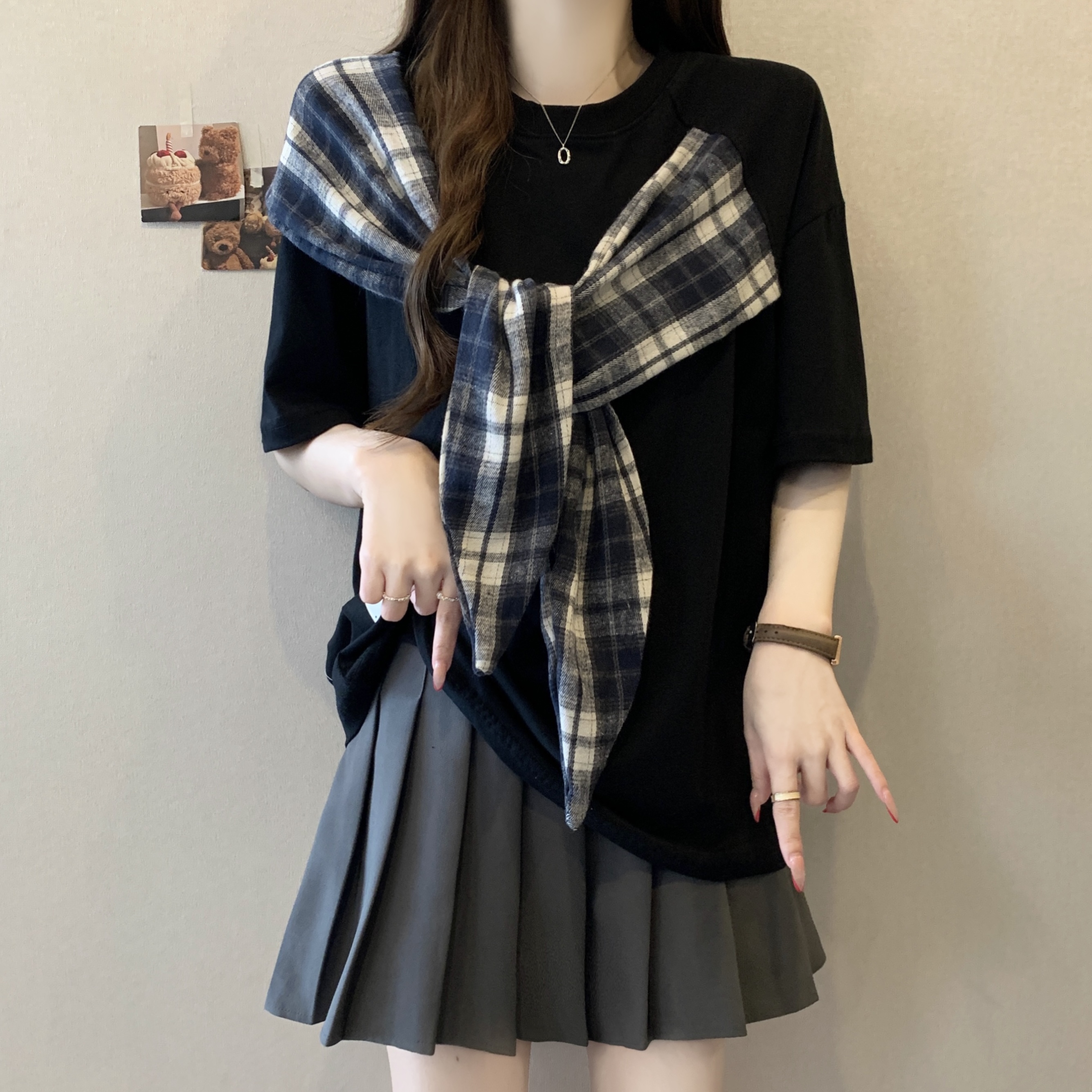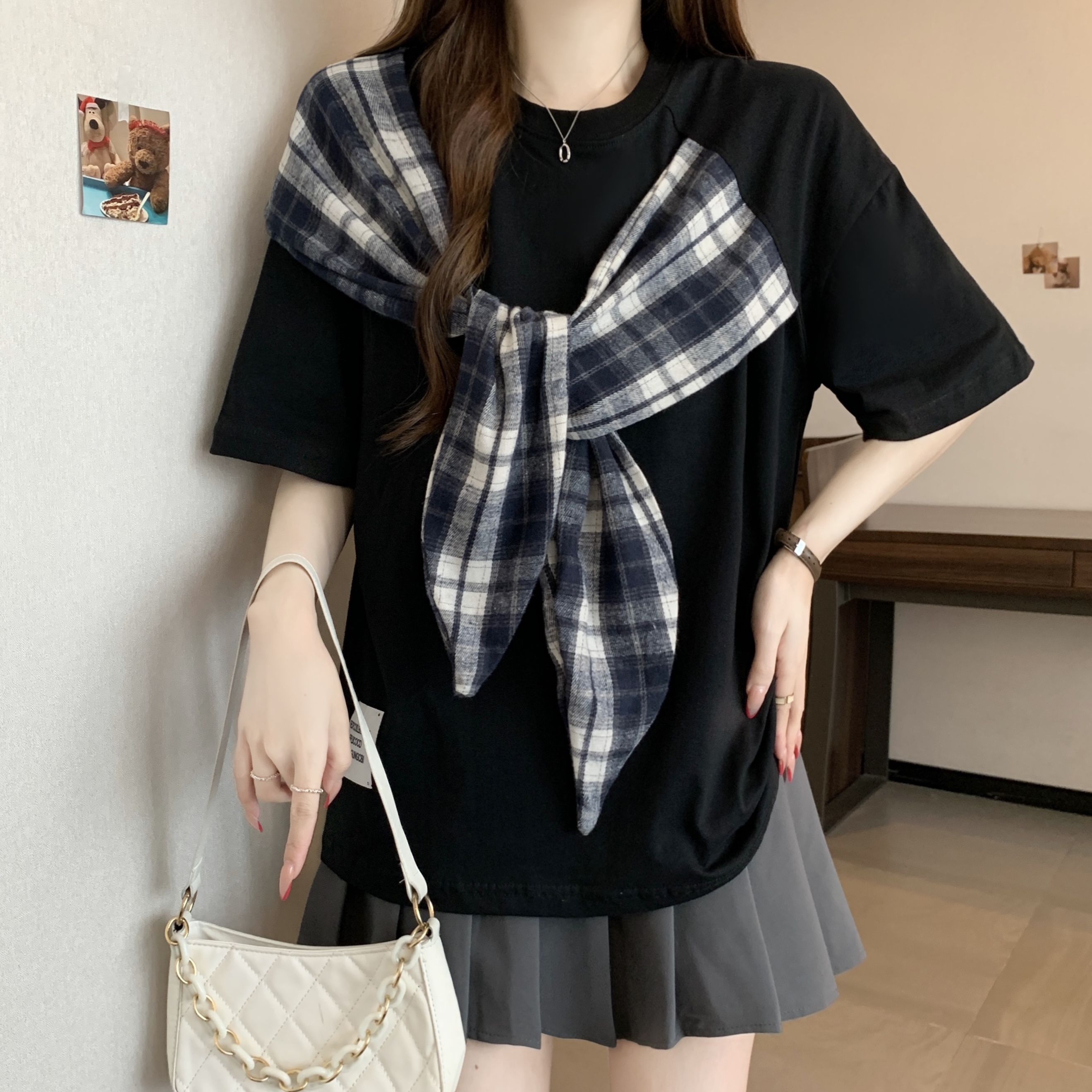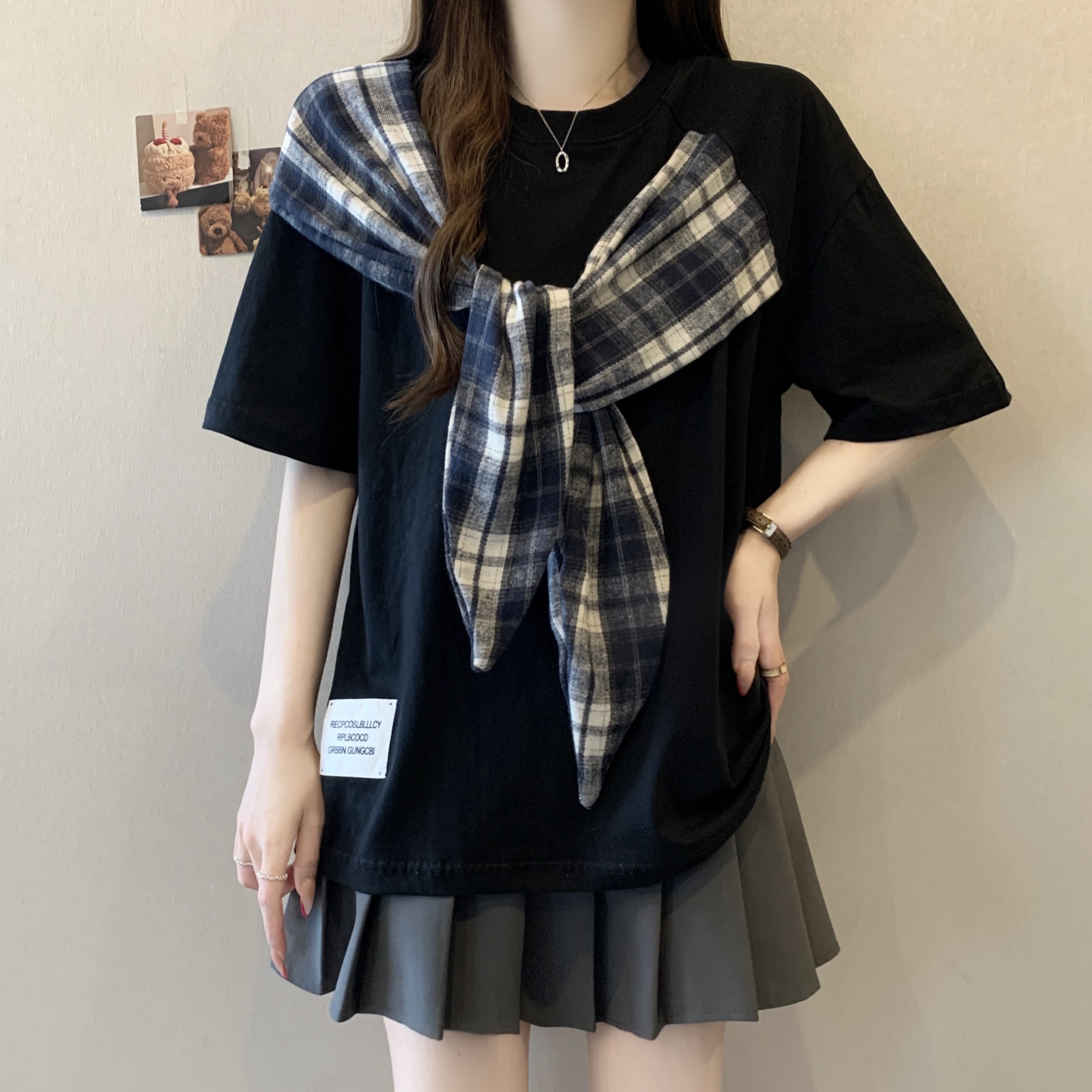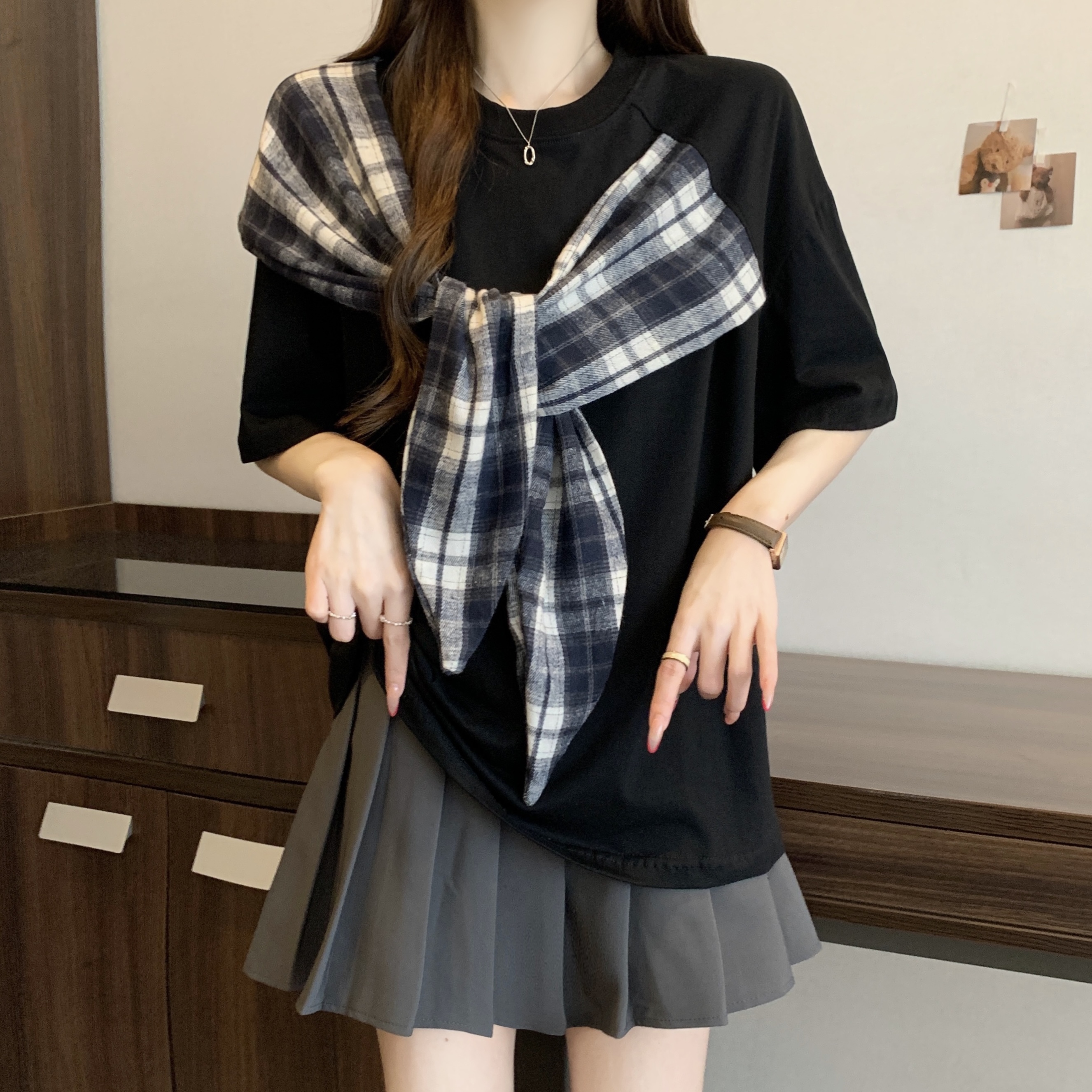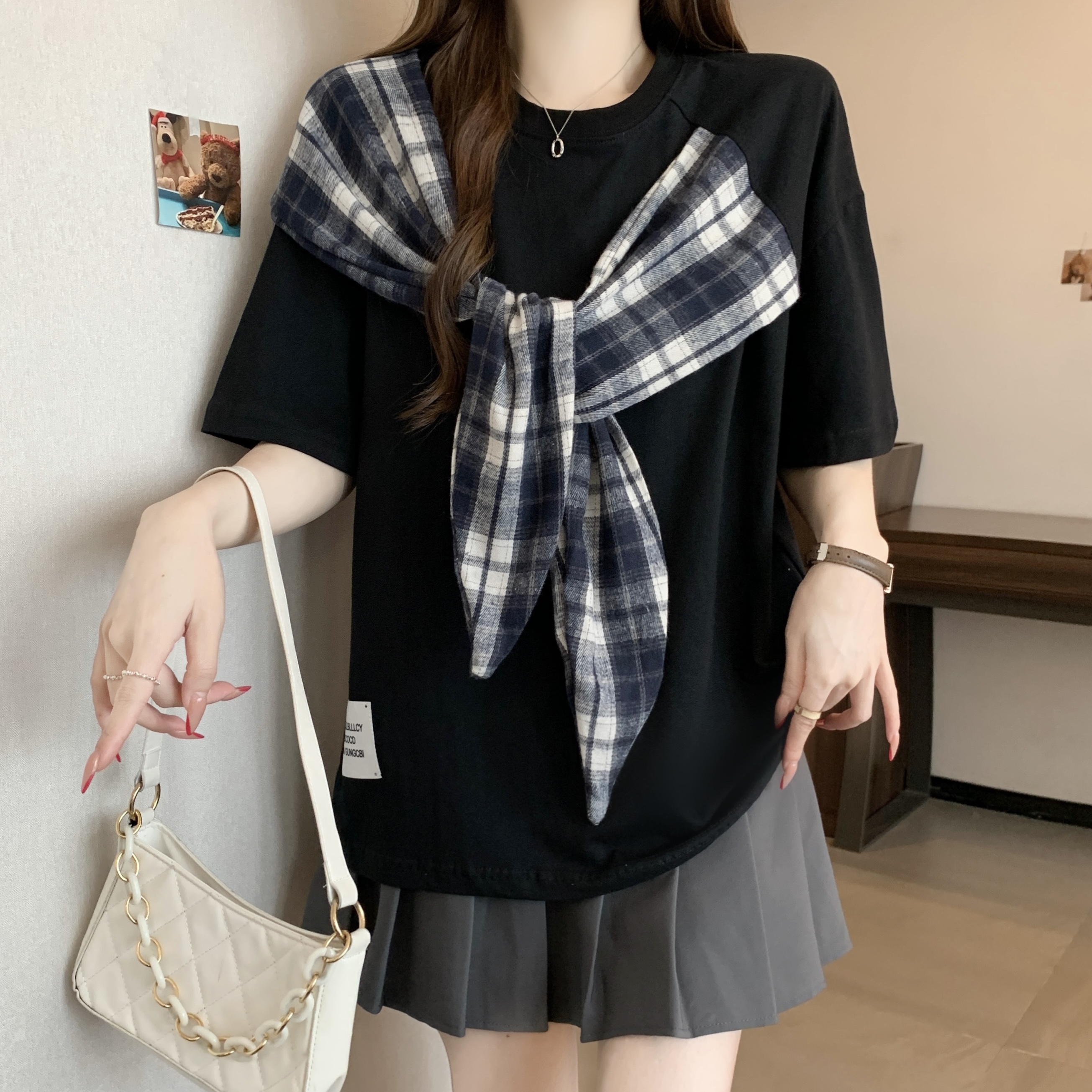 BY16297# 新款大码胖MM美式设计感蝴蝶结拼接宽松显瘦潮牌百搭上衣 服裝批發女裝批發服飾貨源