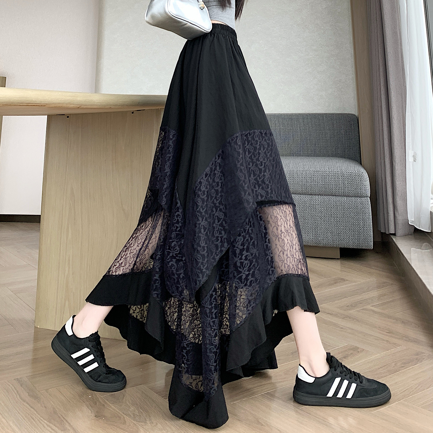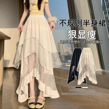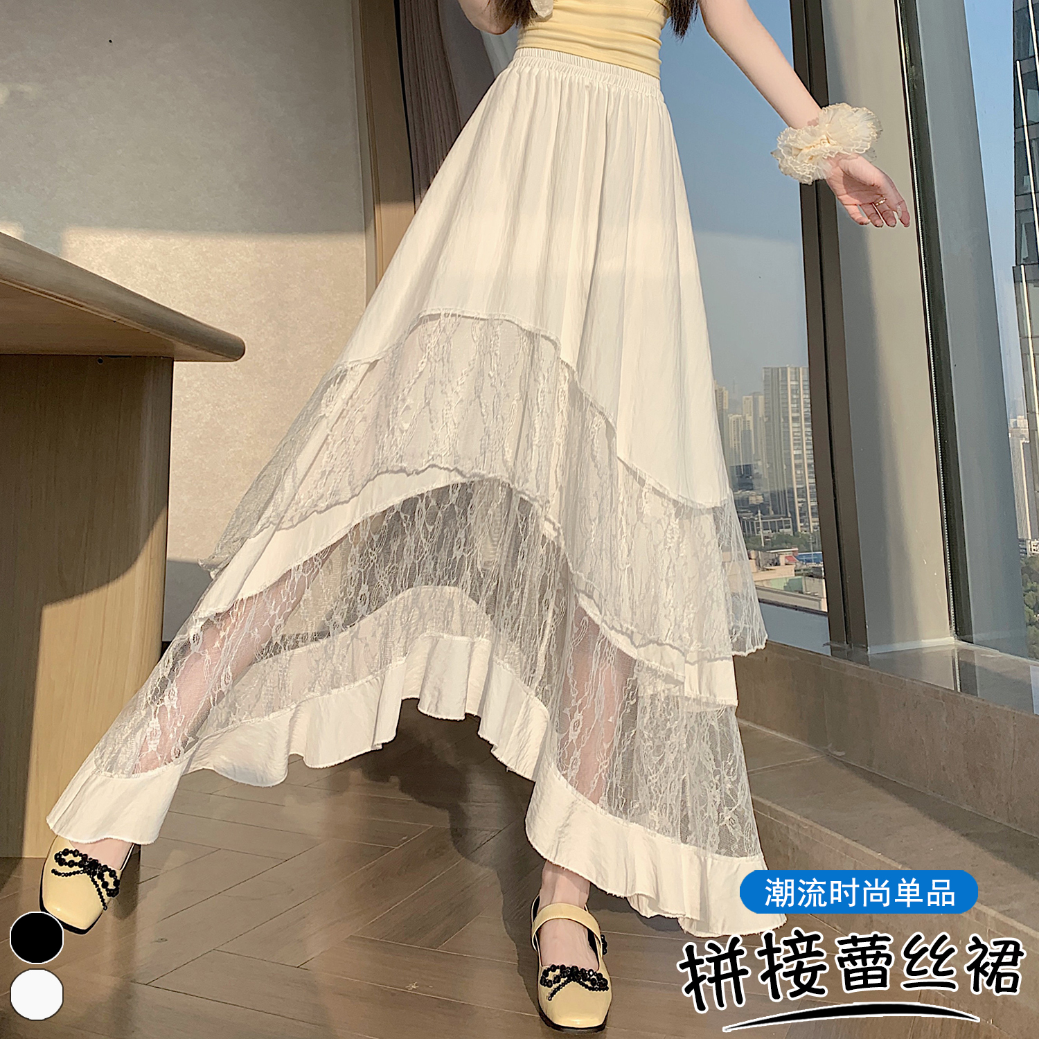 BY16467# 设计感韩版不规则拼接蕾丝荷叶边蛋糕裙女高腰显瘦A字伞裙夏 服裝批發女裝批發服飾貨源
