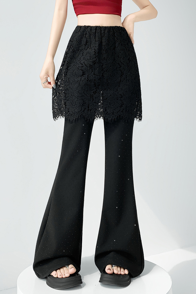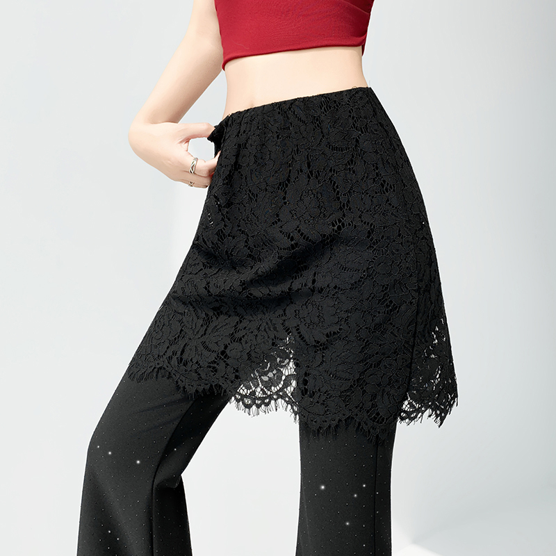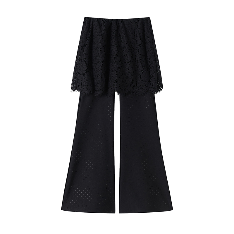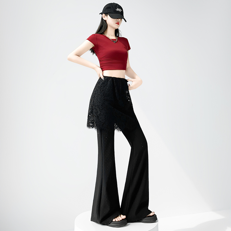 BY16489# 假两件蕾丝屁帘烫钻裤子女夏季薄款高腰弹力休闲垂感微喇叭裤 服裝批發女裝批發服飾貨源