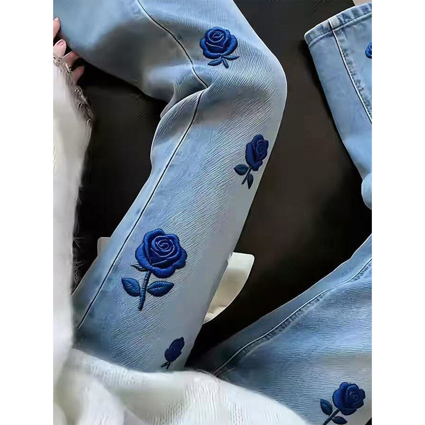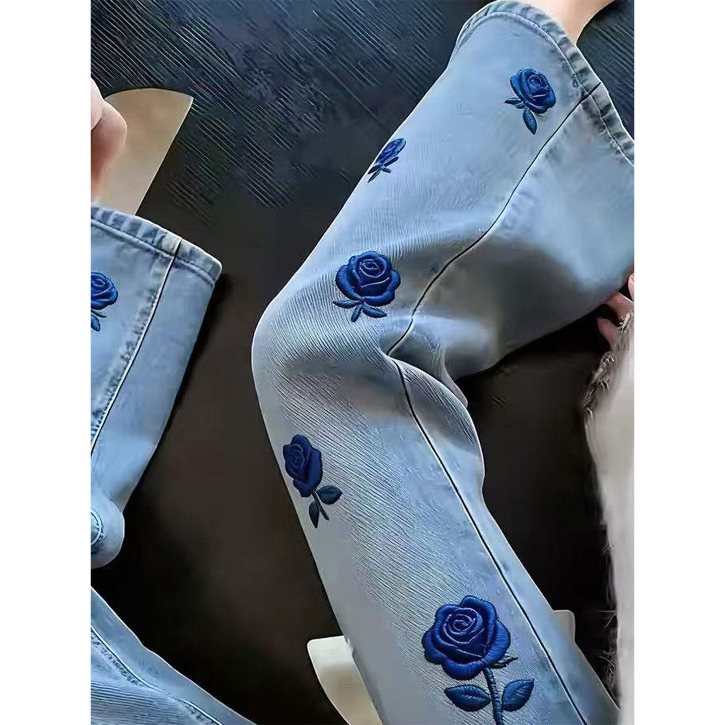 BY16526# 高腰时尚百搭长裤蓝色玫瑰刺绣牛仔裤女流行新款轻奢百搭直筒裤子 服裝批發女裝批發服飾貨源