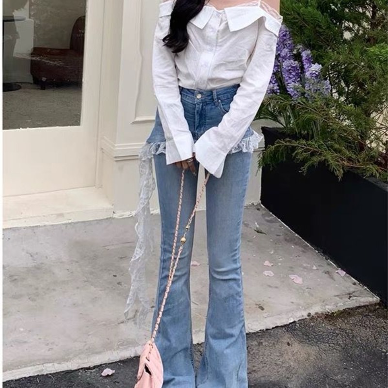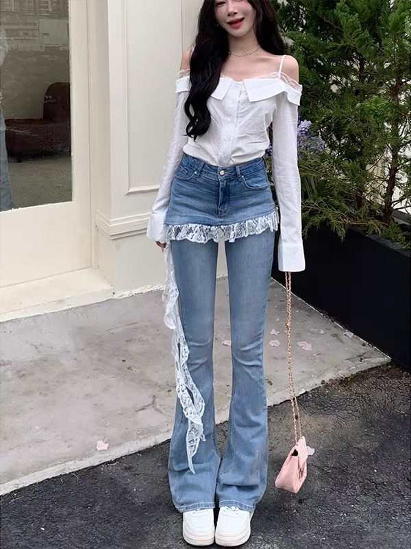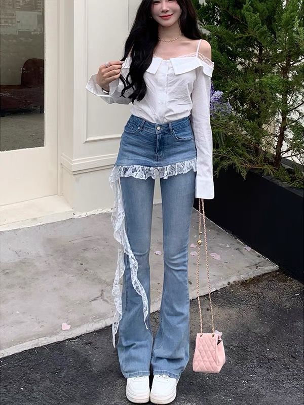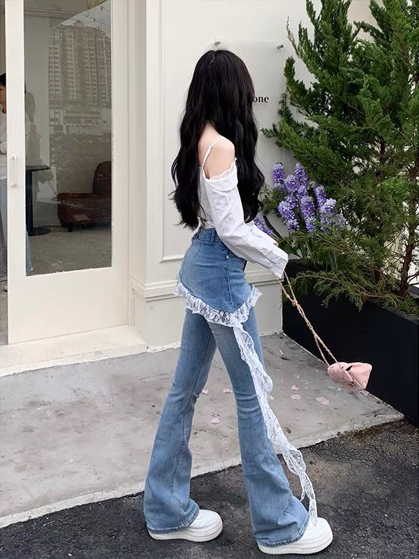 BY16528# 服饰法式蕾丝花边微喇牛仔裤女夏款假两件高腰显瘦拖地裤子 服裝批發女裝批發服飾貨源